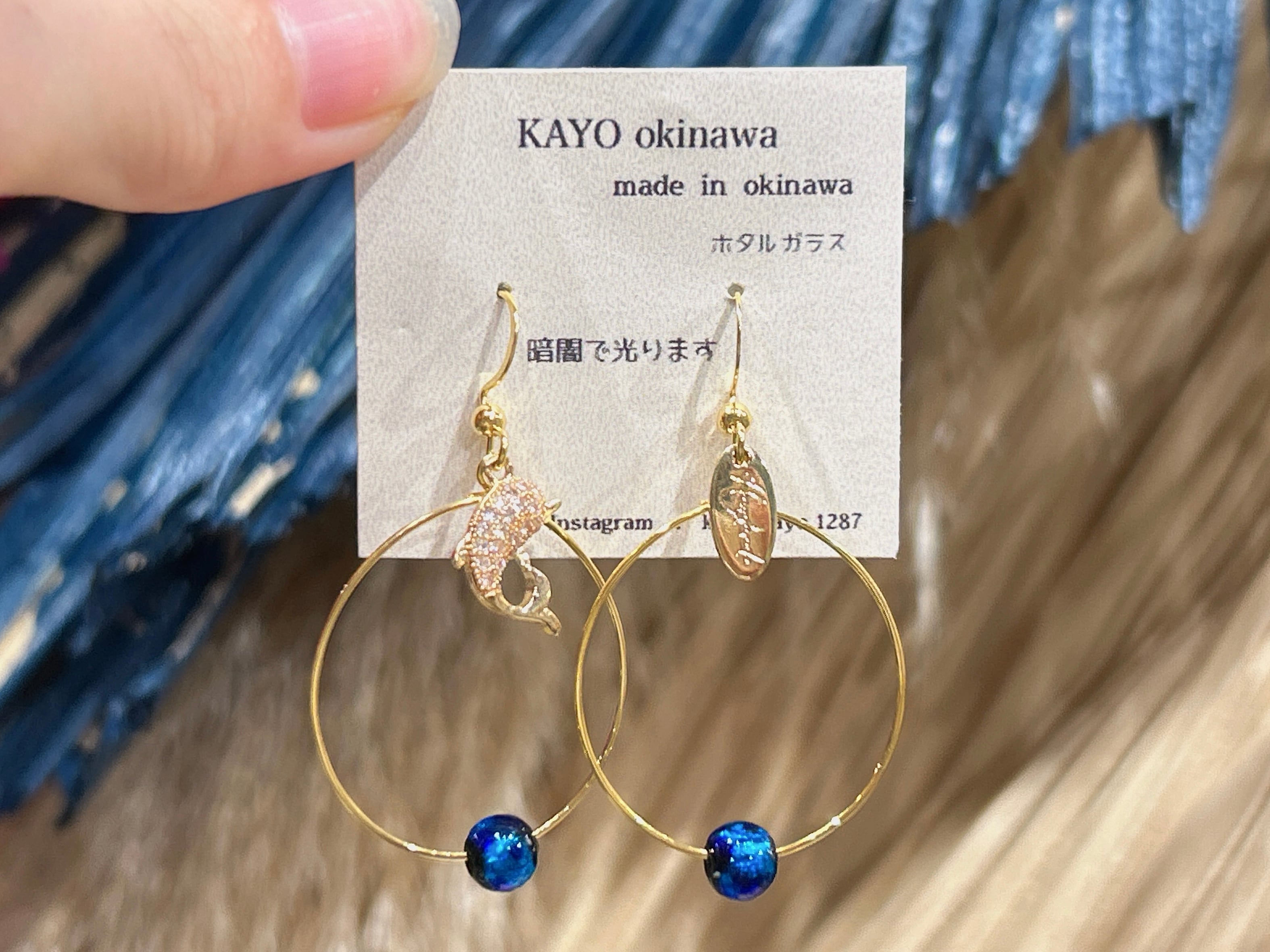 美しいホタルガラスが幻想的に輝く、フープピアスが登場しました!このアイテムは、夜になると光を放つ特性があり、昼間はスッキリとしたデザインで、シーンを選ばずお使いいただけます。さらに片耳には可愛らしいイルカチャームが施されており、左右で異なるデザインが楽しめる遊び心満載の作品です。