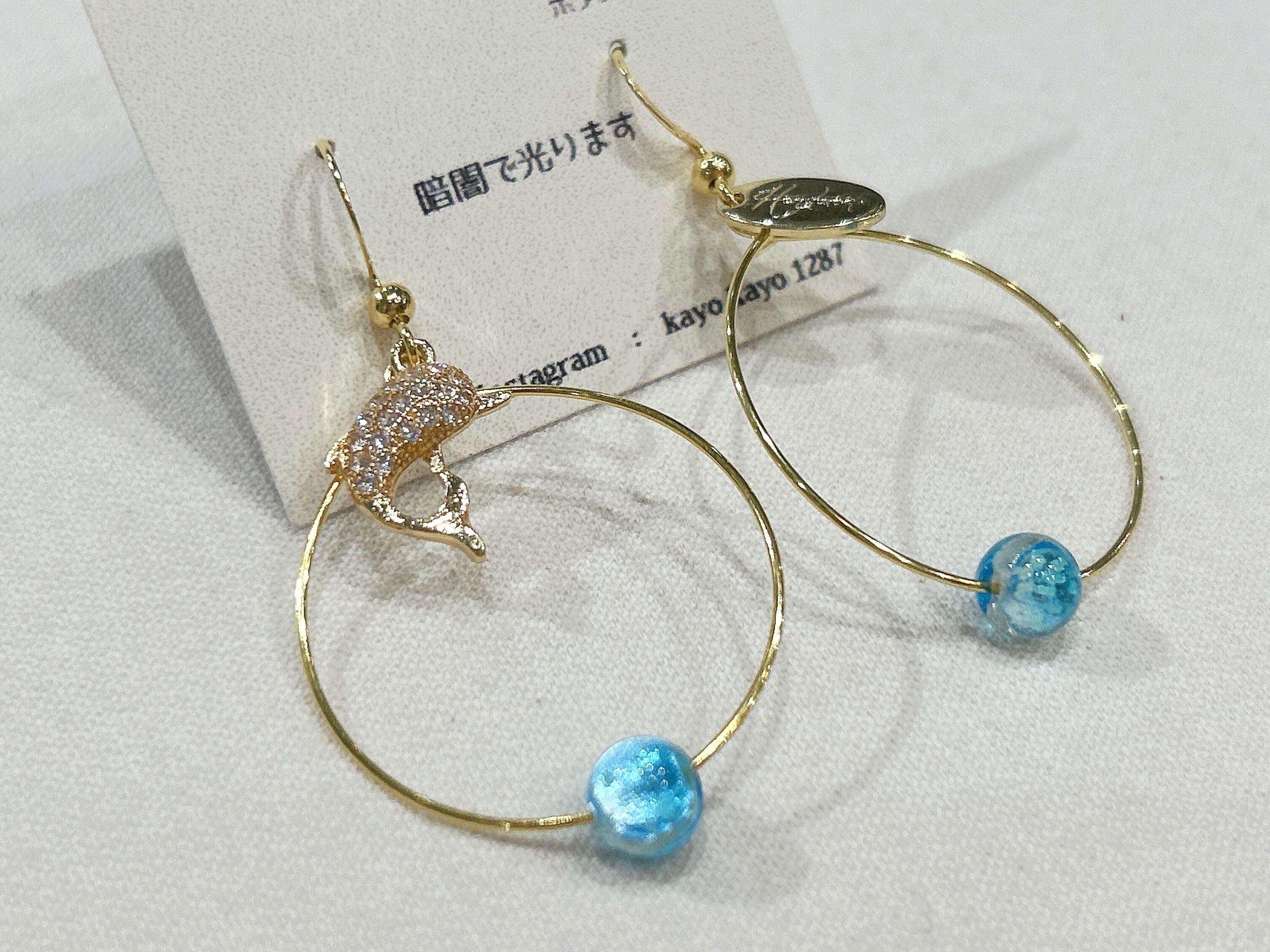 美しいホタルガラスを使用したフープピアスが登場しました!左右でデザインの異なってイルカチャームがアクセントとなり、あなたの耳元を華やかに彩ります。独自のデザインと色合いは、見る人を魅了し、自然の美しさを感じさせる逸品です。