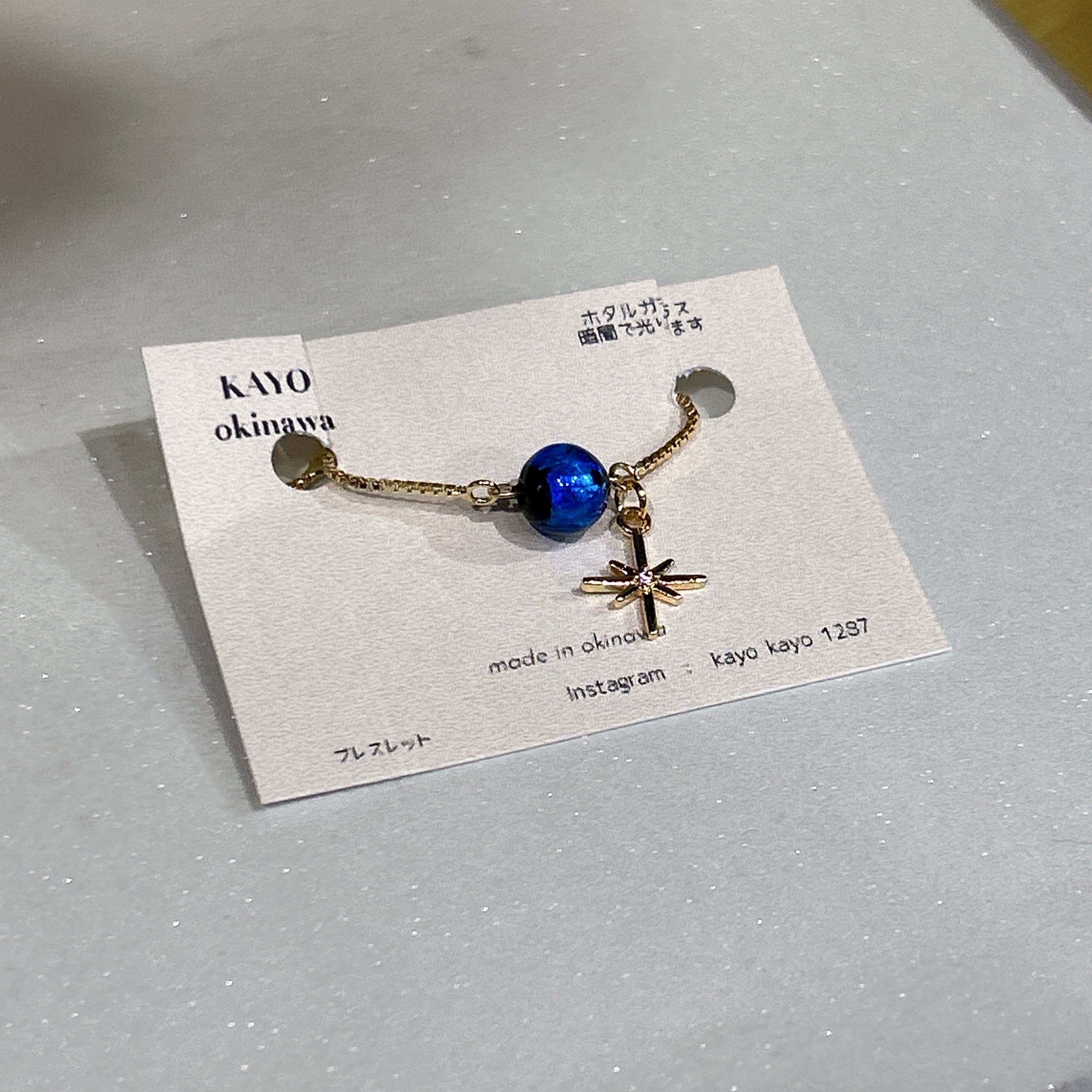 手首に付けると、ブルーのホタルガラスが光を反射し、煌めくような輝きを放ちます。シンプルながらも上品でエレガントな装いを演出してくれます。