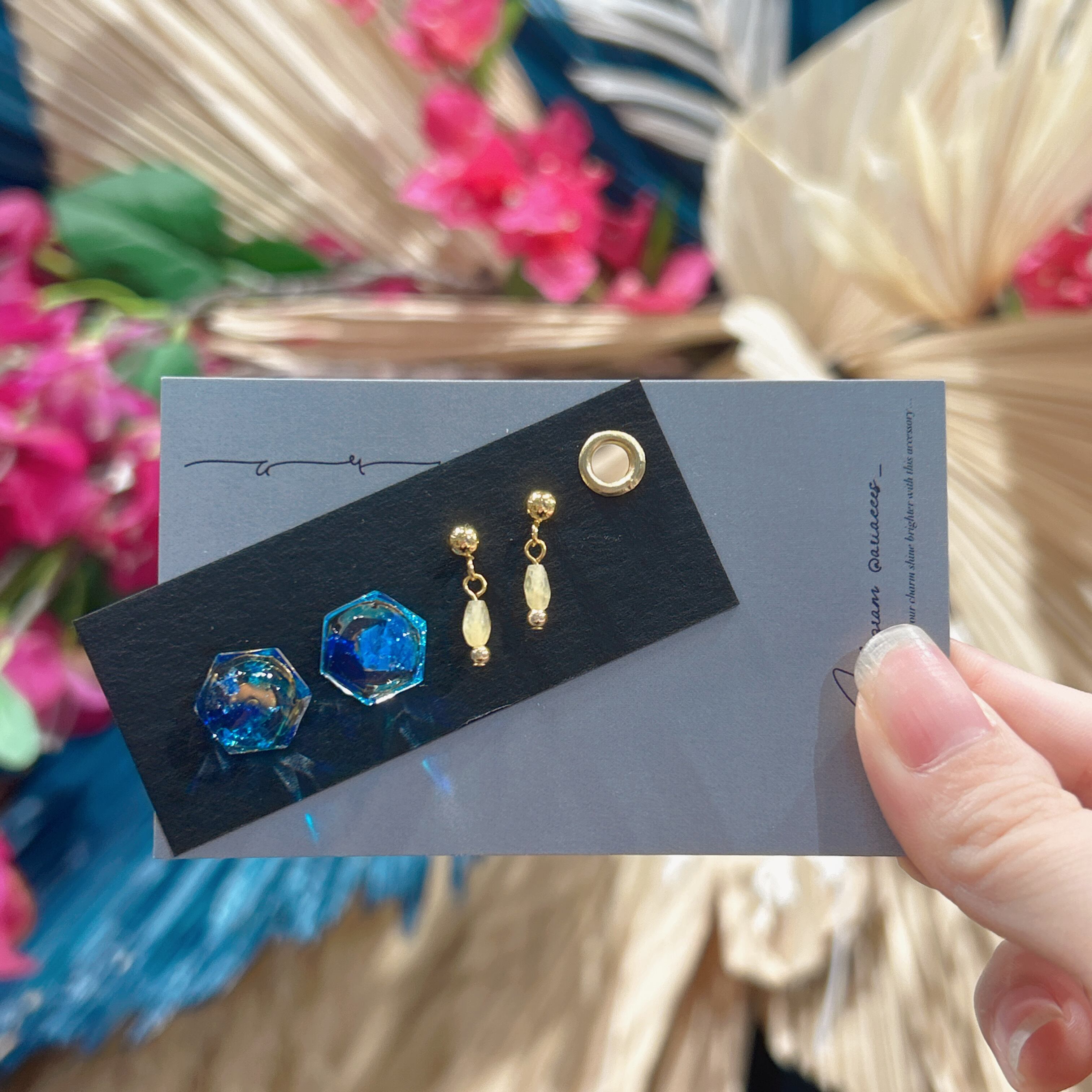 琉球ガラスとイエローアベンチュリンが織り成す、上品で華やかなピアスセットです。青と水色の琉球ガラスが美しく輝き、イエローアベンチュリンの煌めきがアクセントになっています。普段使いにも、パーティーシーンにもおすすめのデザインで、お洋服の印象をぐっと引き立ててくれます。また、サージカルステンレスを使用しているので、金属アレルギーをお持ちの方にもお使いいただけます。