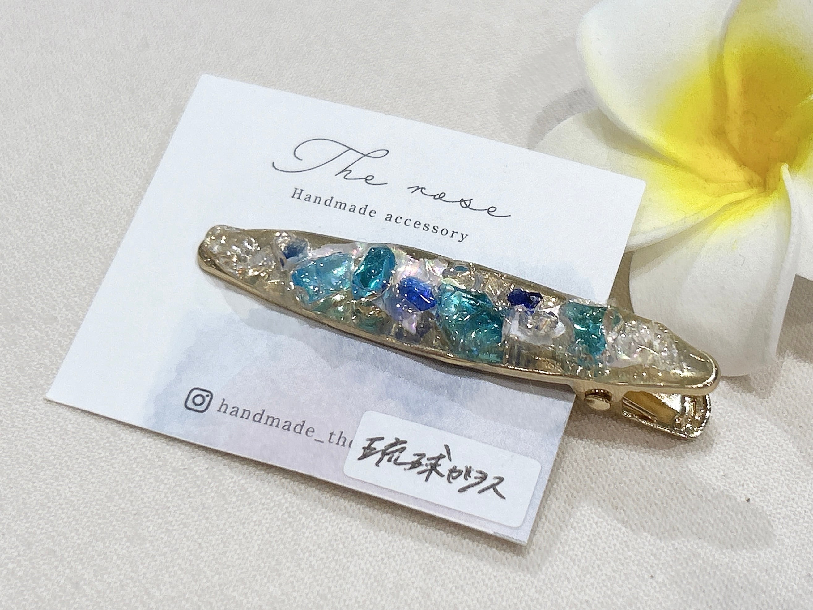 琉球ガラスのかけらを使用したピアスは、透明感と海の青さを再現した、華やかなデザインです。手作りの技術と愛情が込められたこの一品は、光を受けてまばゆく輝き、特別な存在に引き立てます!