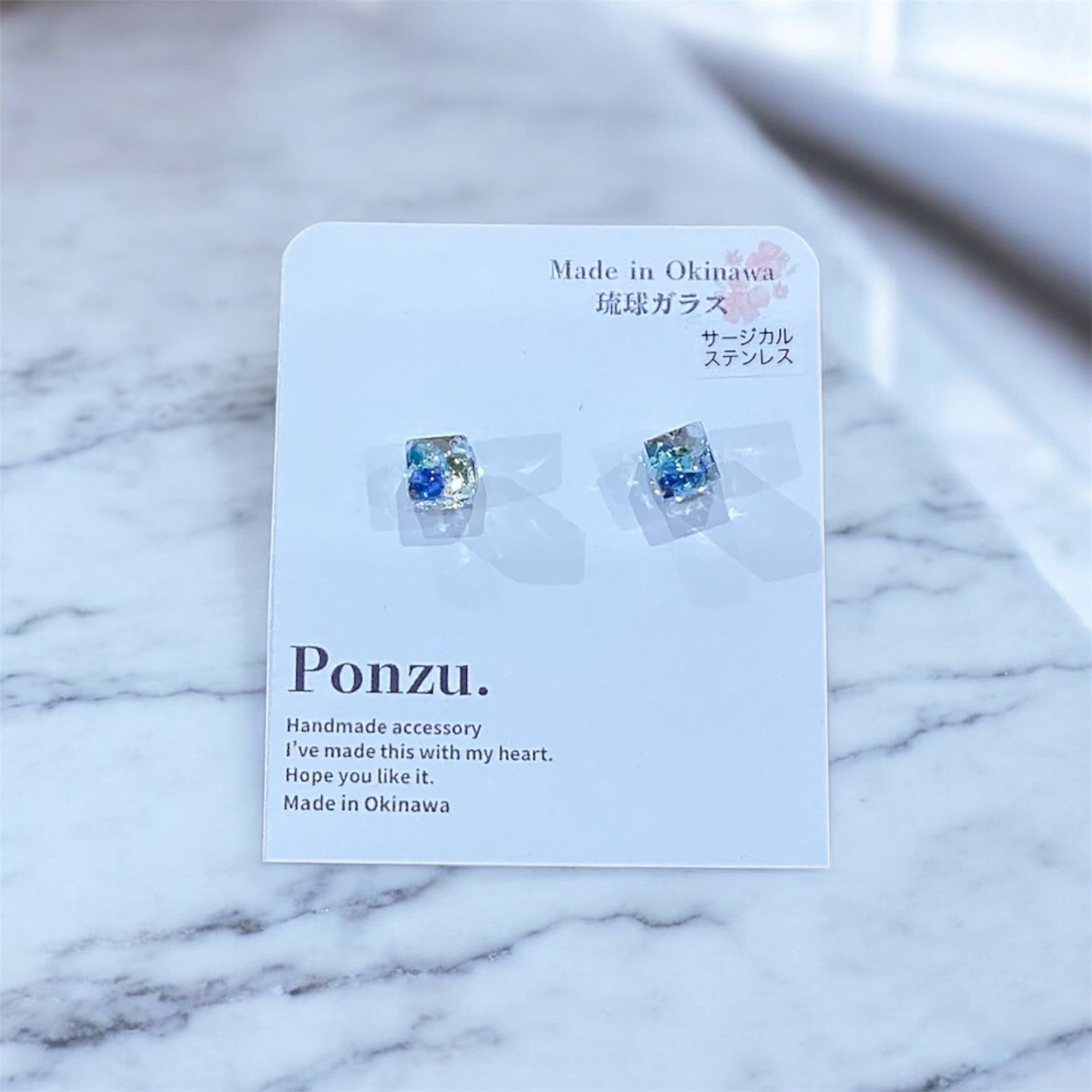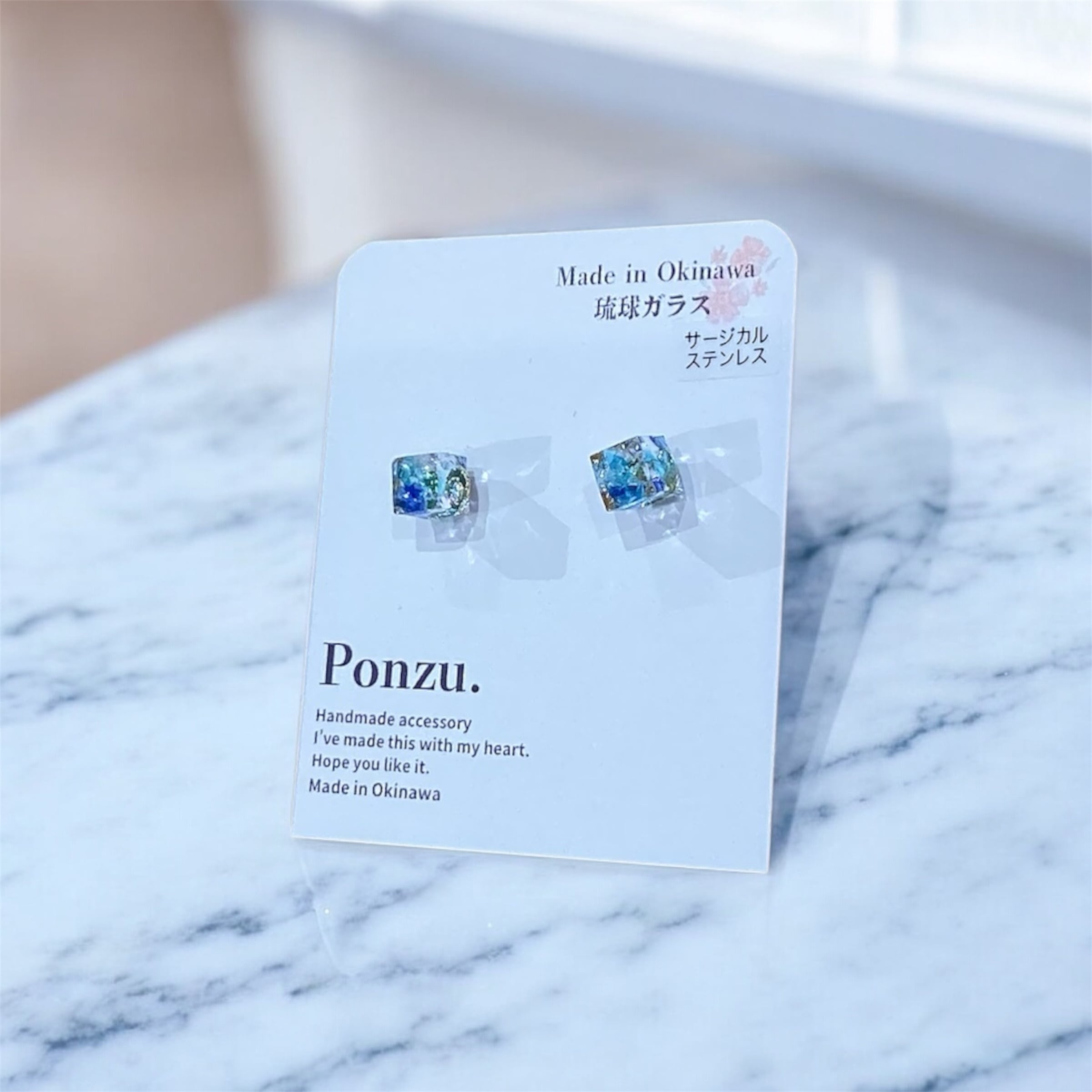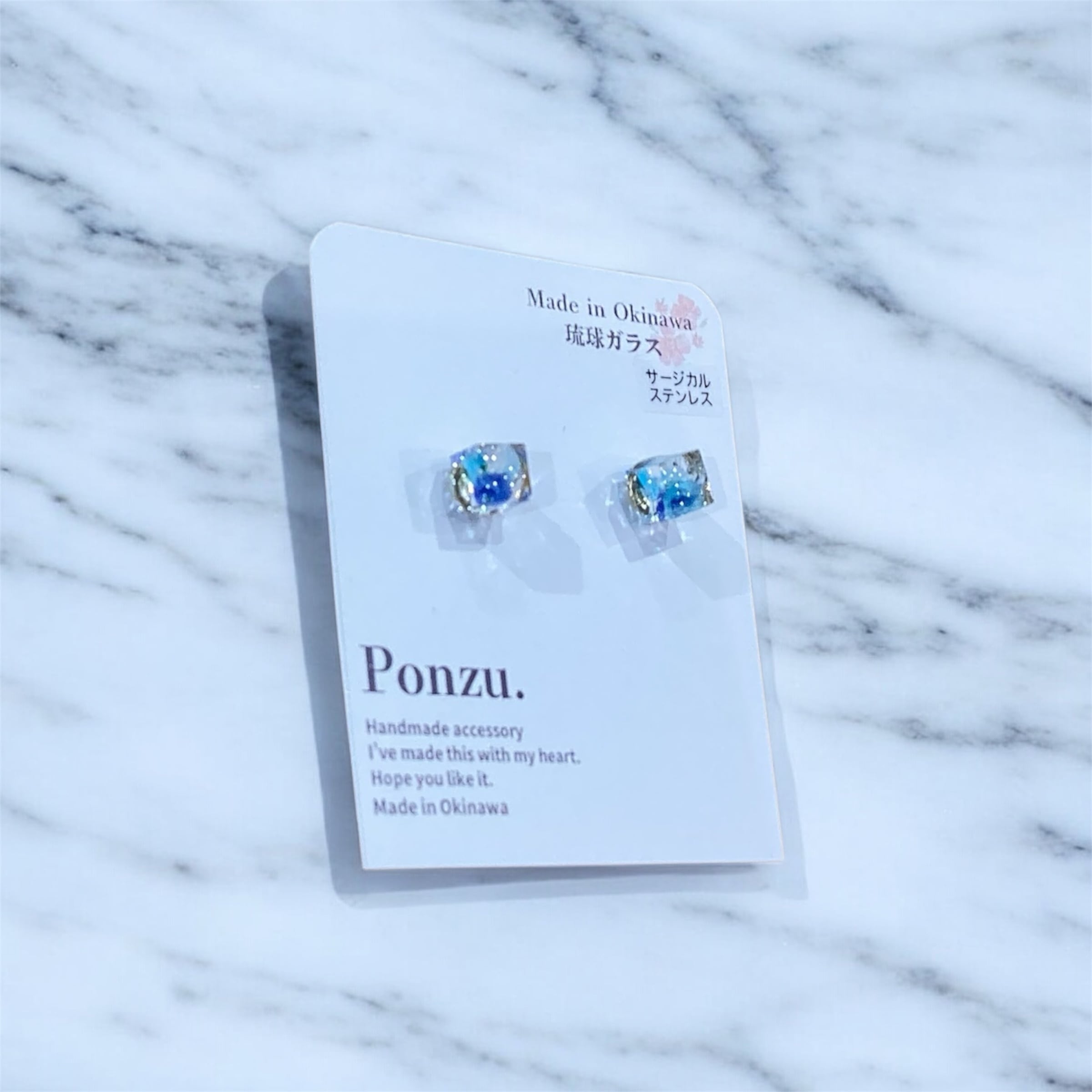 水色の琉球ガラスのカケラを使用した爽やかなアクセサリーです!