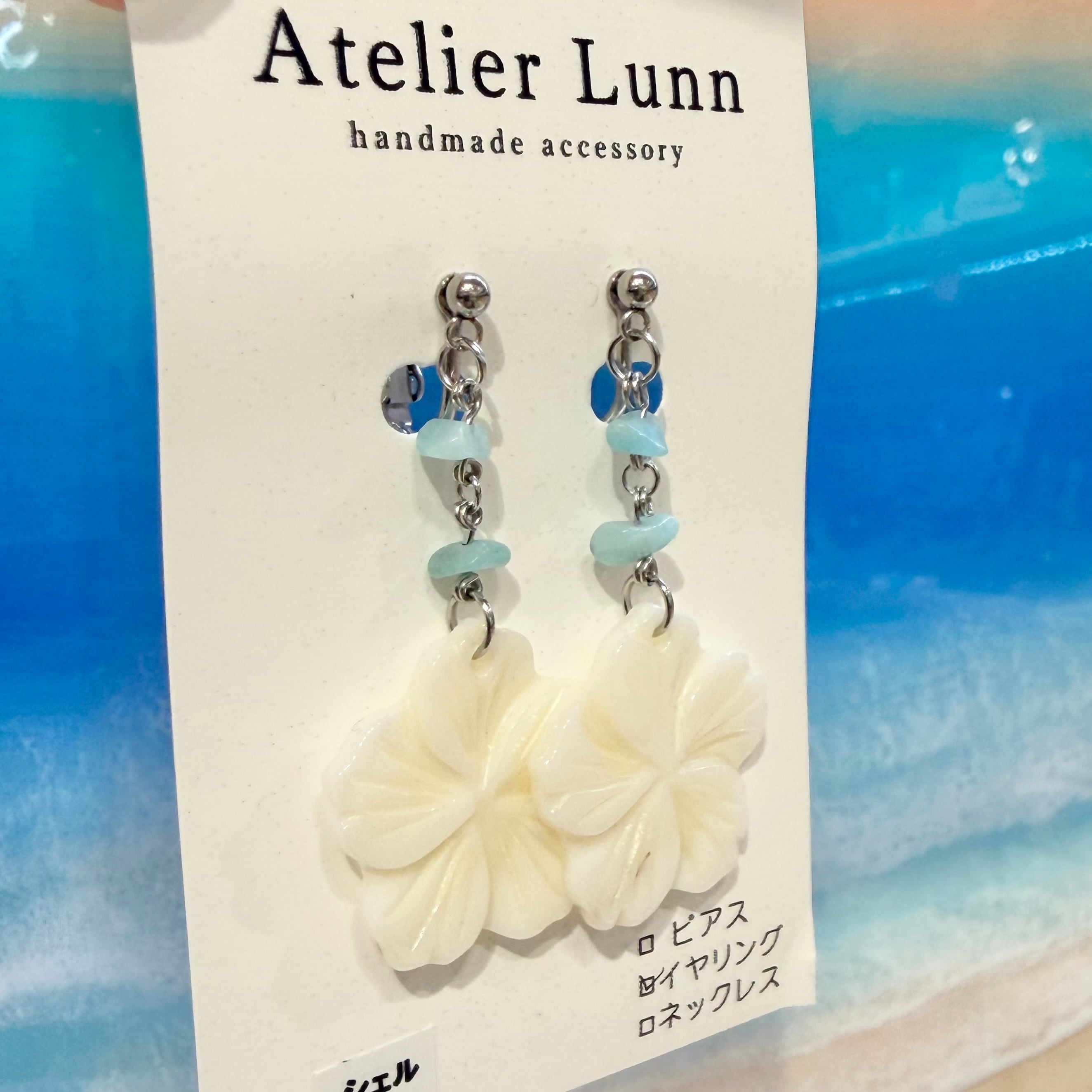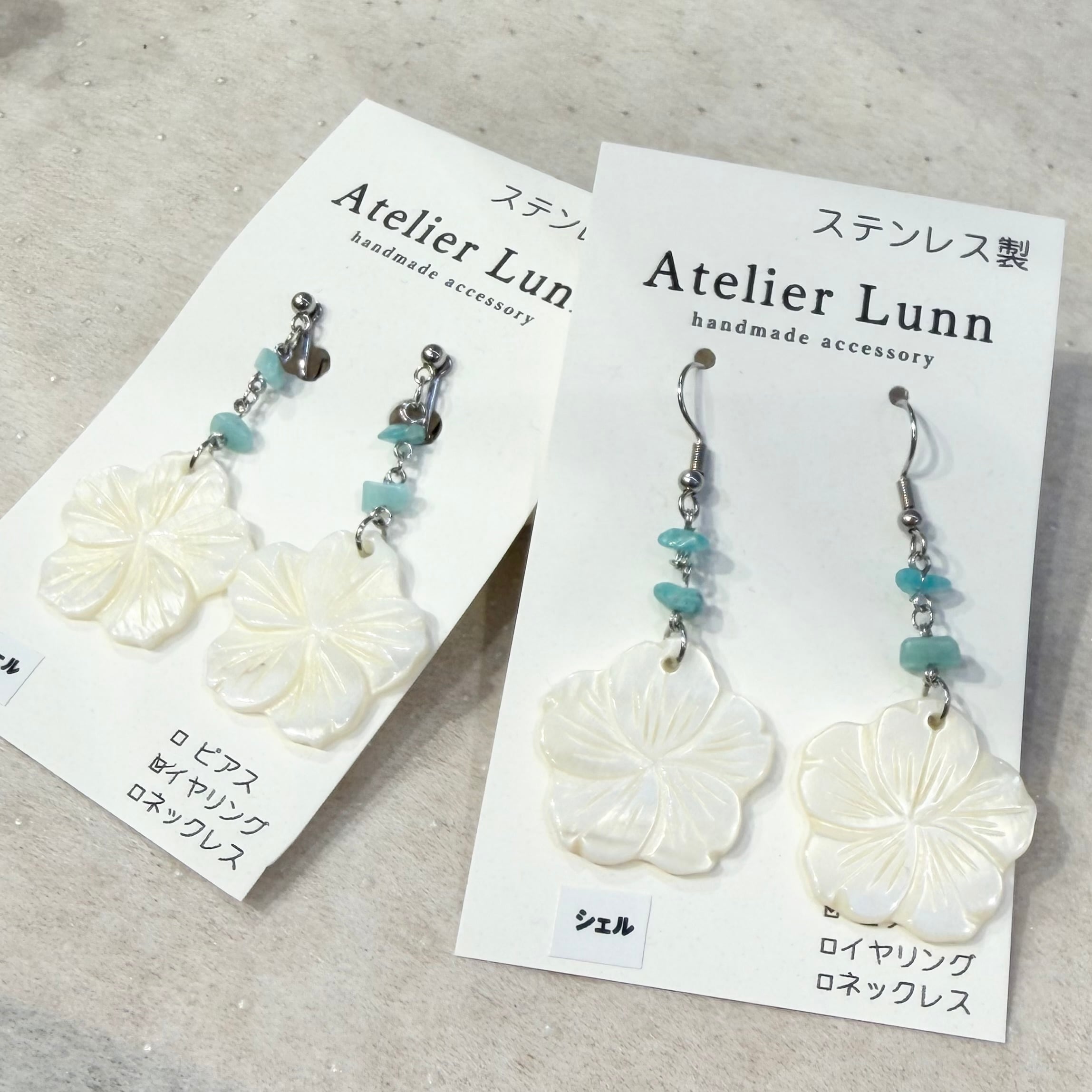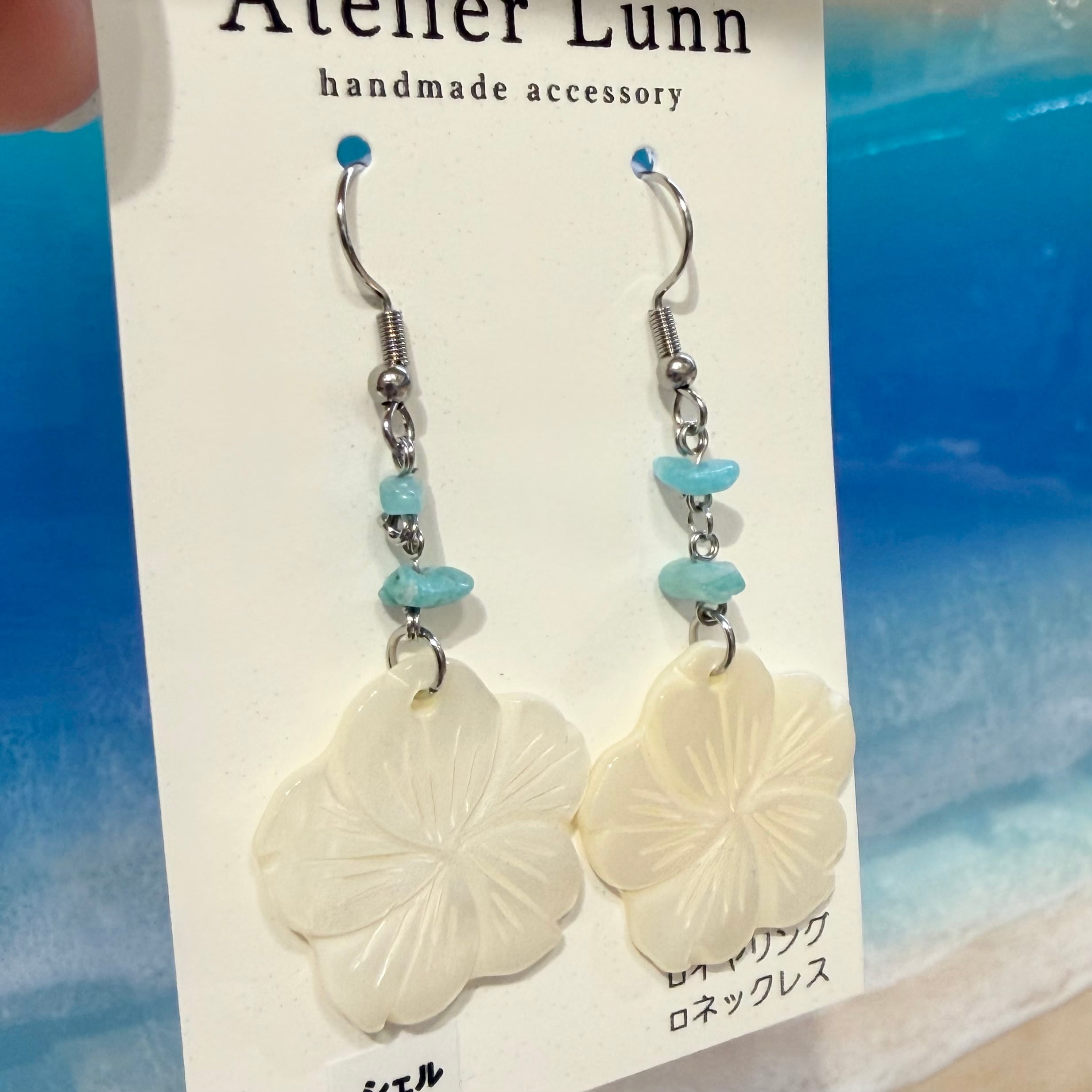 ハイビスカスの花をモチーフにしたこのピアスは、その柔らかな曲線と色合いが耳元で華やかさを添えます。シェルの素材感が心地よい輝きを放ち、どんなスタイルにもぴったりなアクセントになること間違いなしです!