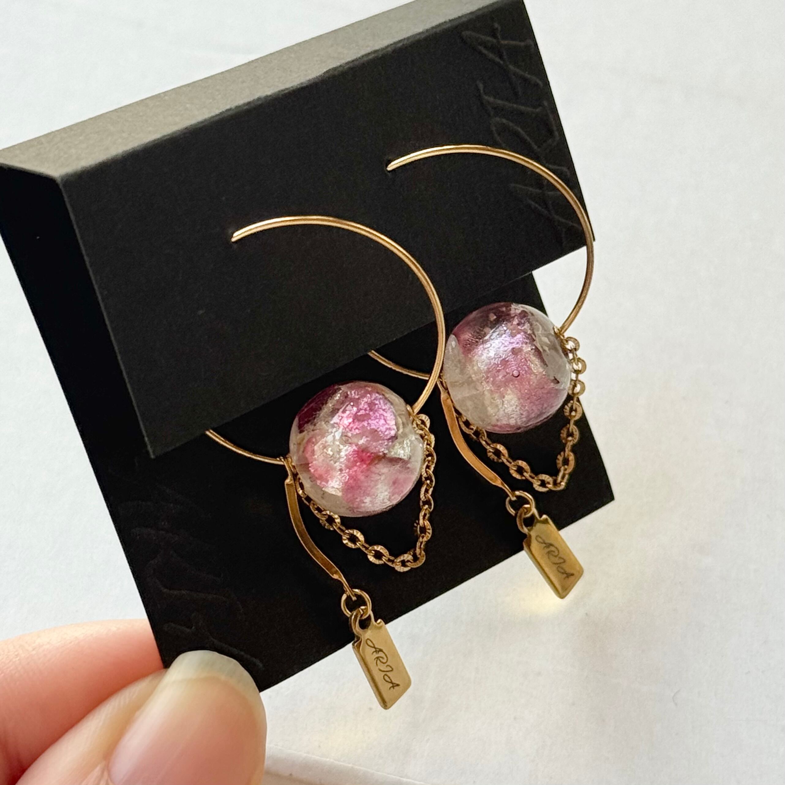 美しいピンクのホタルガラスを使用した、ロマンティックで上品なフープピアスが登場しました!