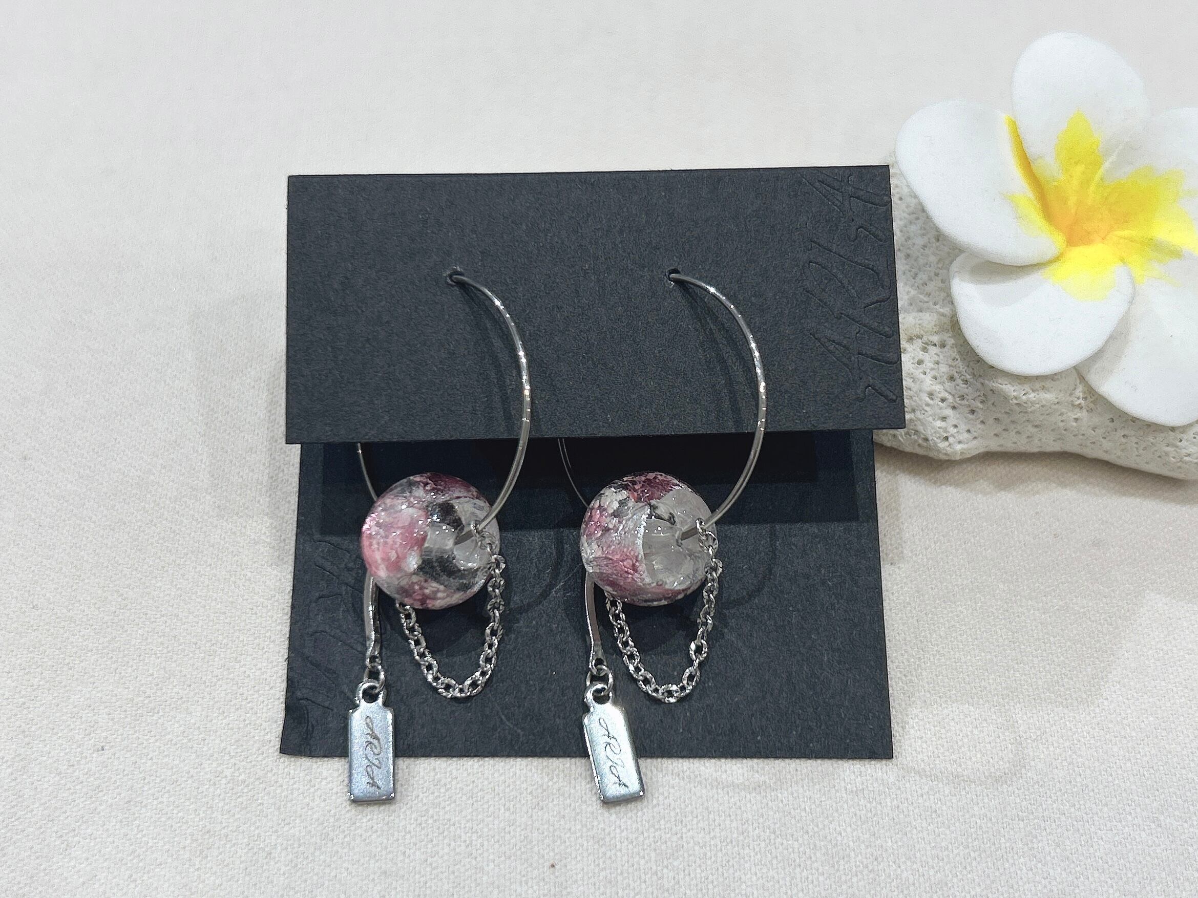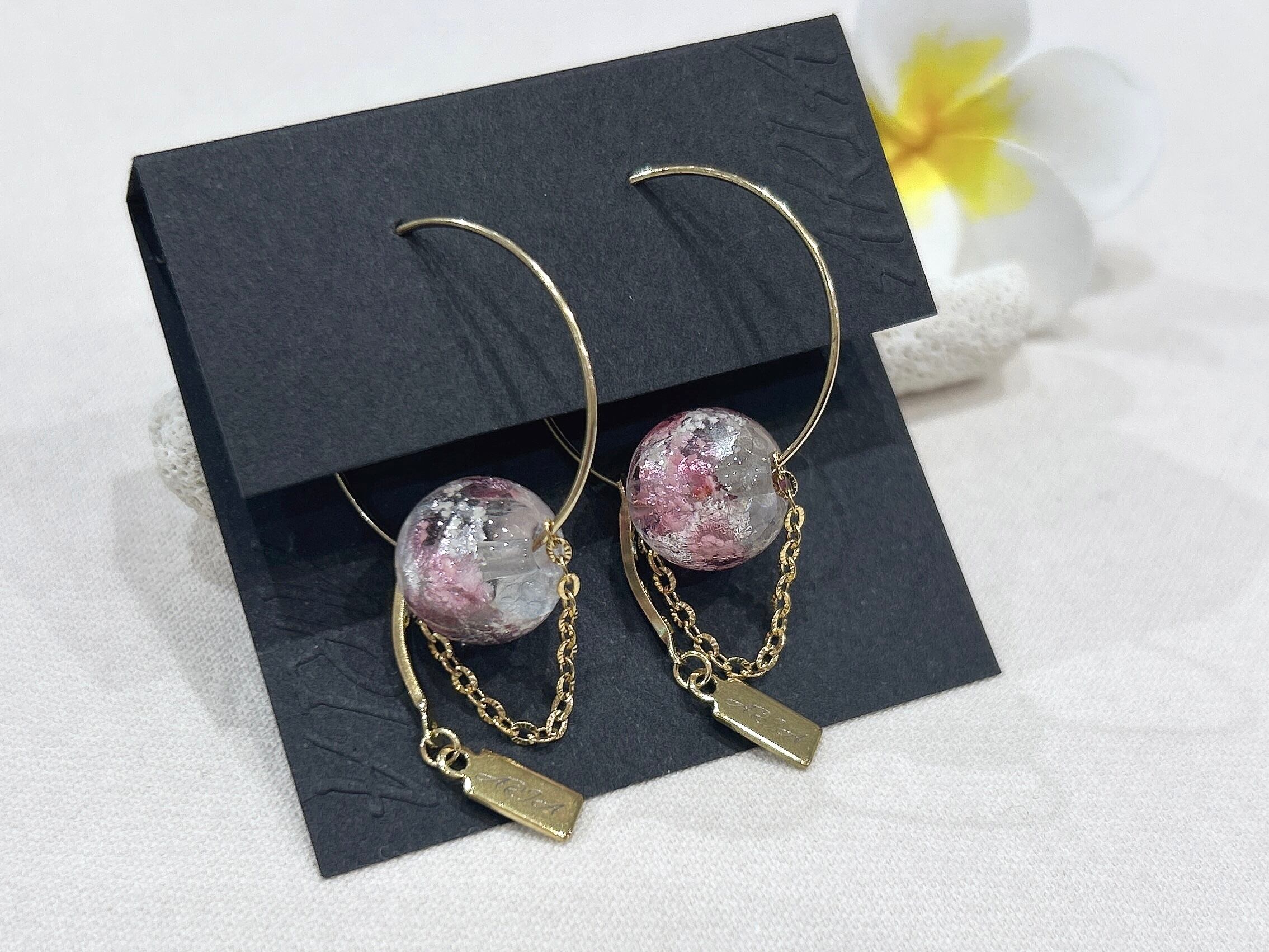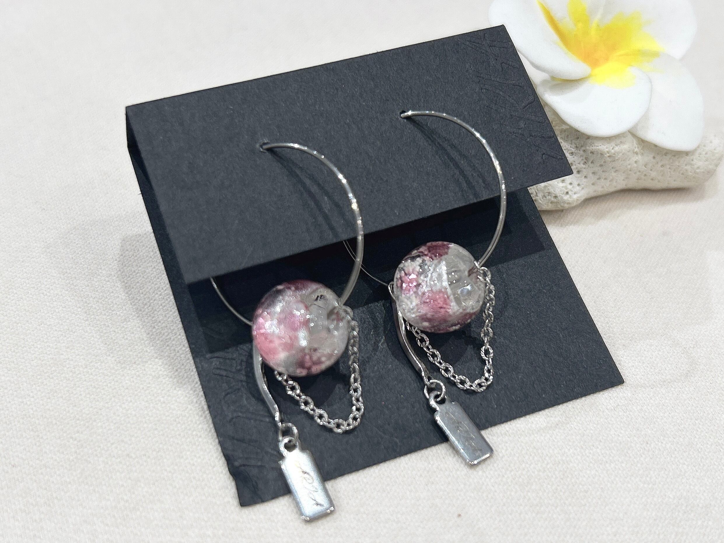 優雅なピンクのフープピアスが登場しました!ホタルガラスの美しい色合いが耳元で華やかさを演出し、さりげないアクセントとしてお使いいただけます。このピアスはサージカルピアスで作られているため、デイリーユースにも適しており、肌に優しく安心してご使用いただけます。