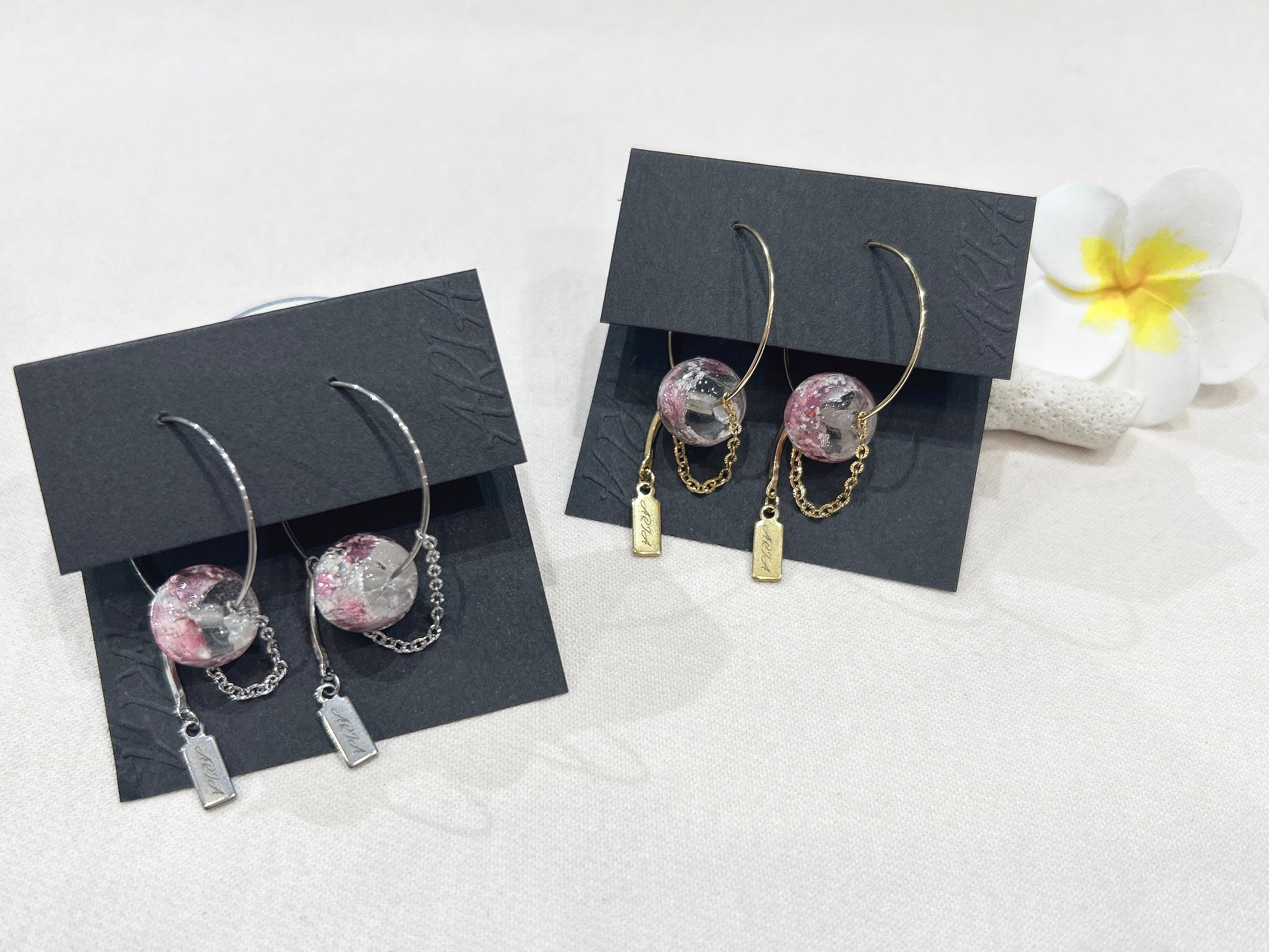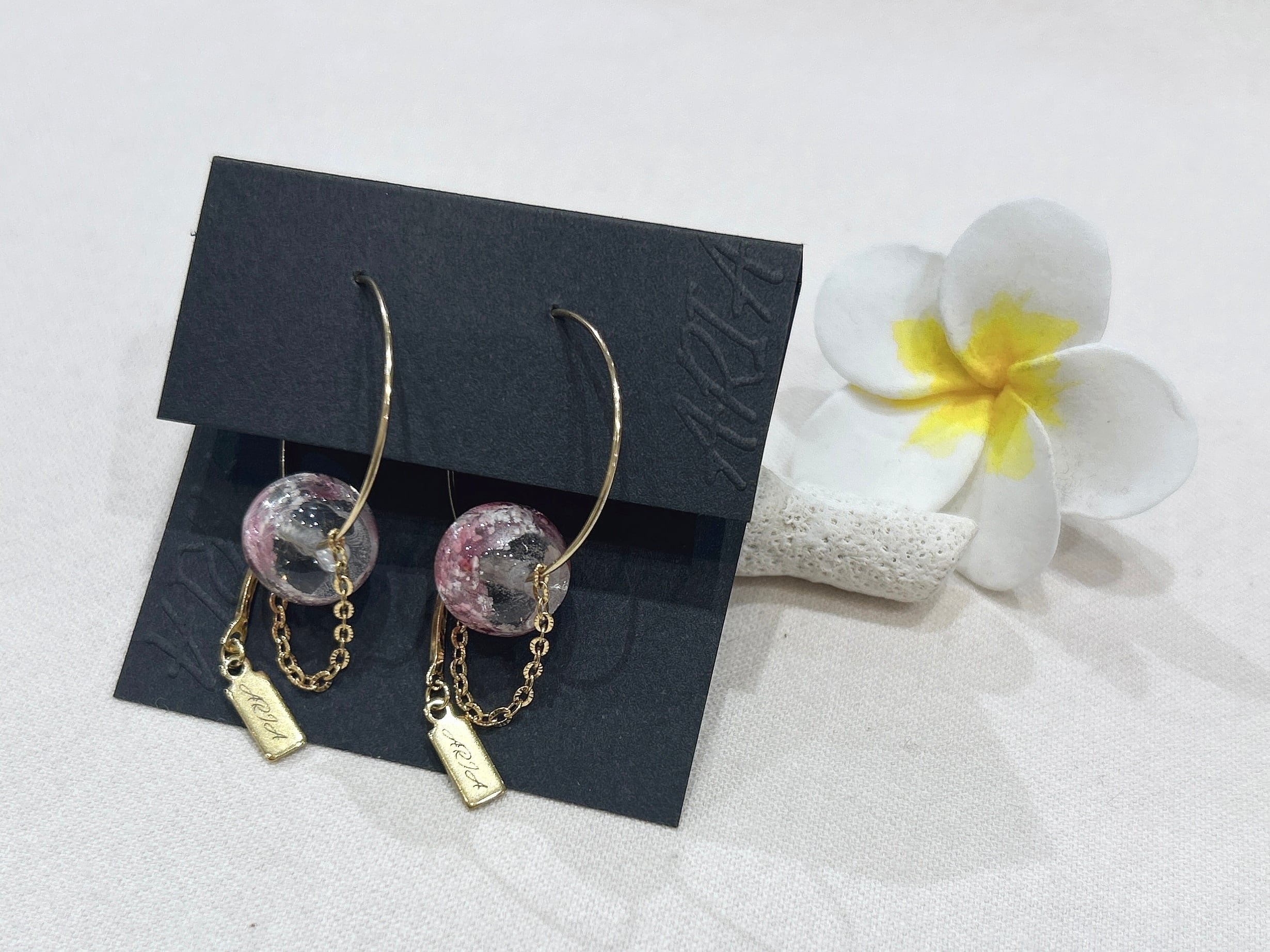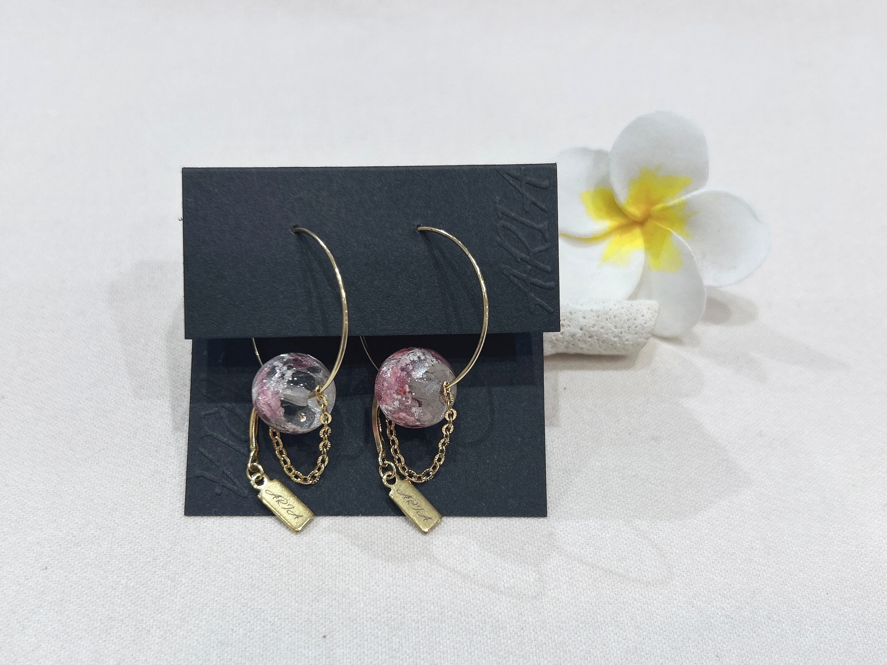 優雅なピンクのフープピアスが登場しました!ホタルガラスの美しい色合いが耳元で華やかさを演出し、さりげないアクセントとしてお使いいただけます。このピアスはサージカルピアスで作られているため、デイリーユースにも適しており、肌に優しく安心してご使用いただけます。