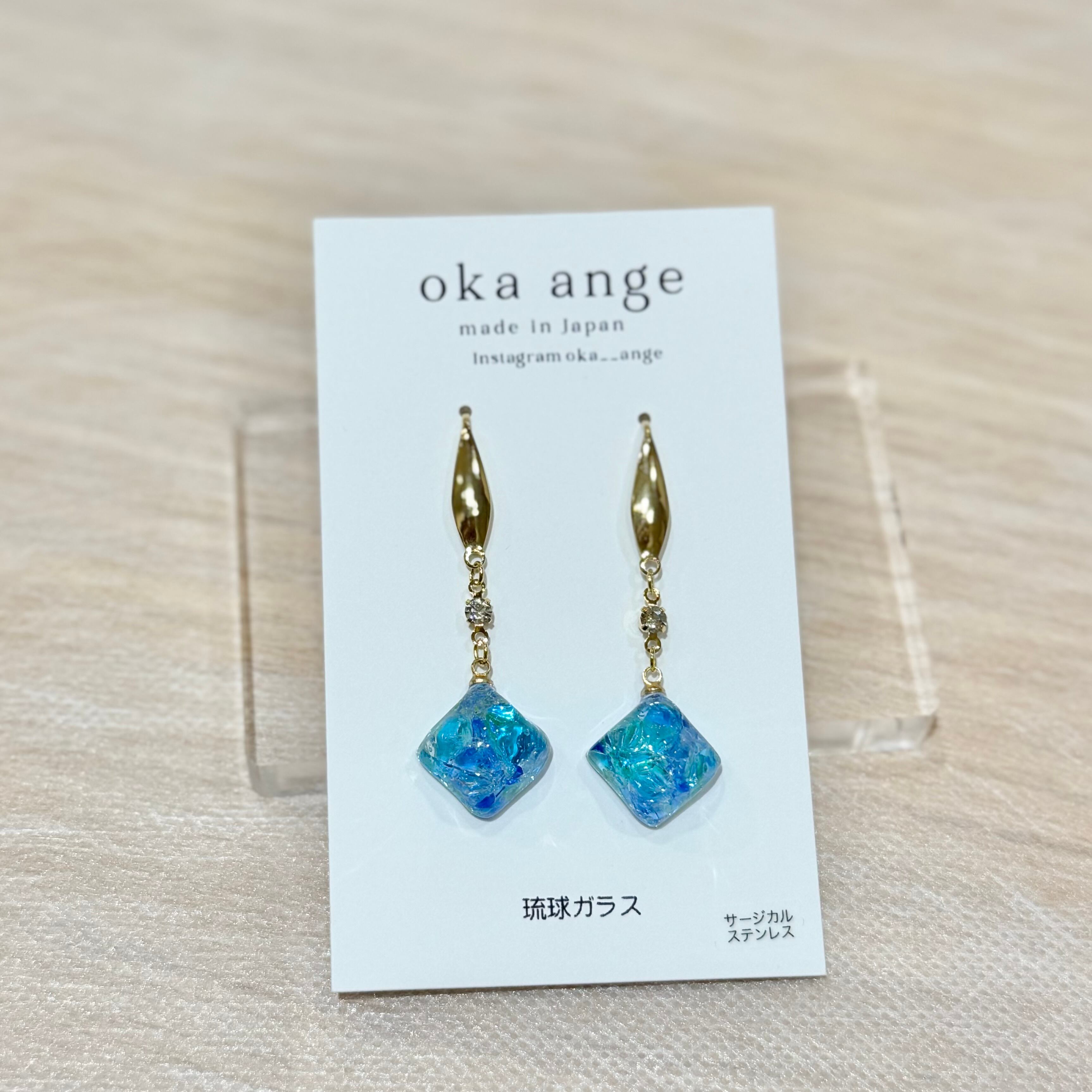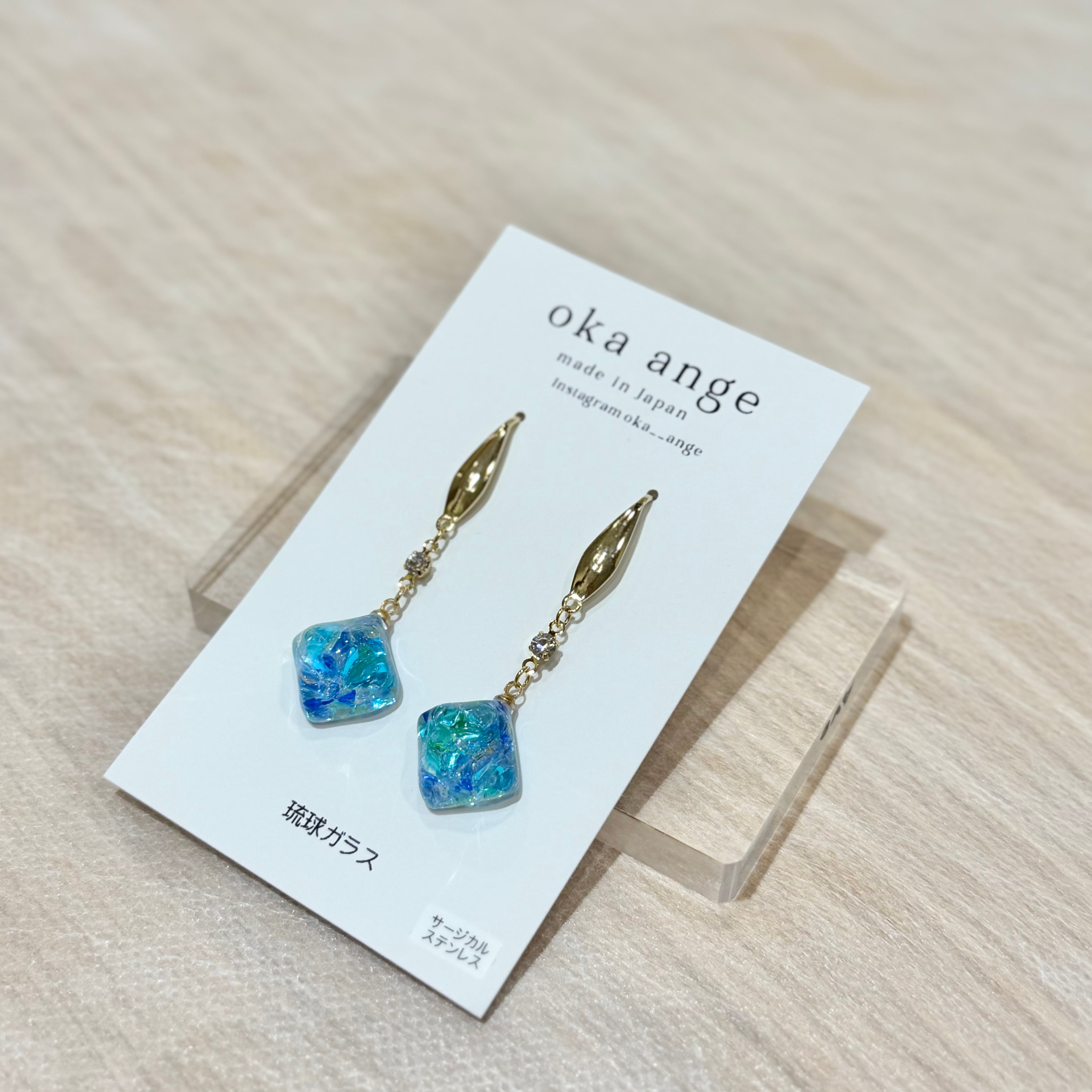 琉球ガラスのかけらを使用したピアスは、透明感と海の青さを再現した、華やかなデザインです。手作りの技術と愛情が込められたこの一品は、光を受けてまばゆく輝き、あなたの耳元を特別な存在に引き立てます!