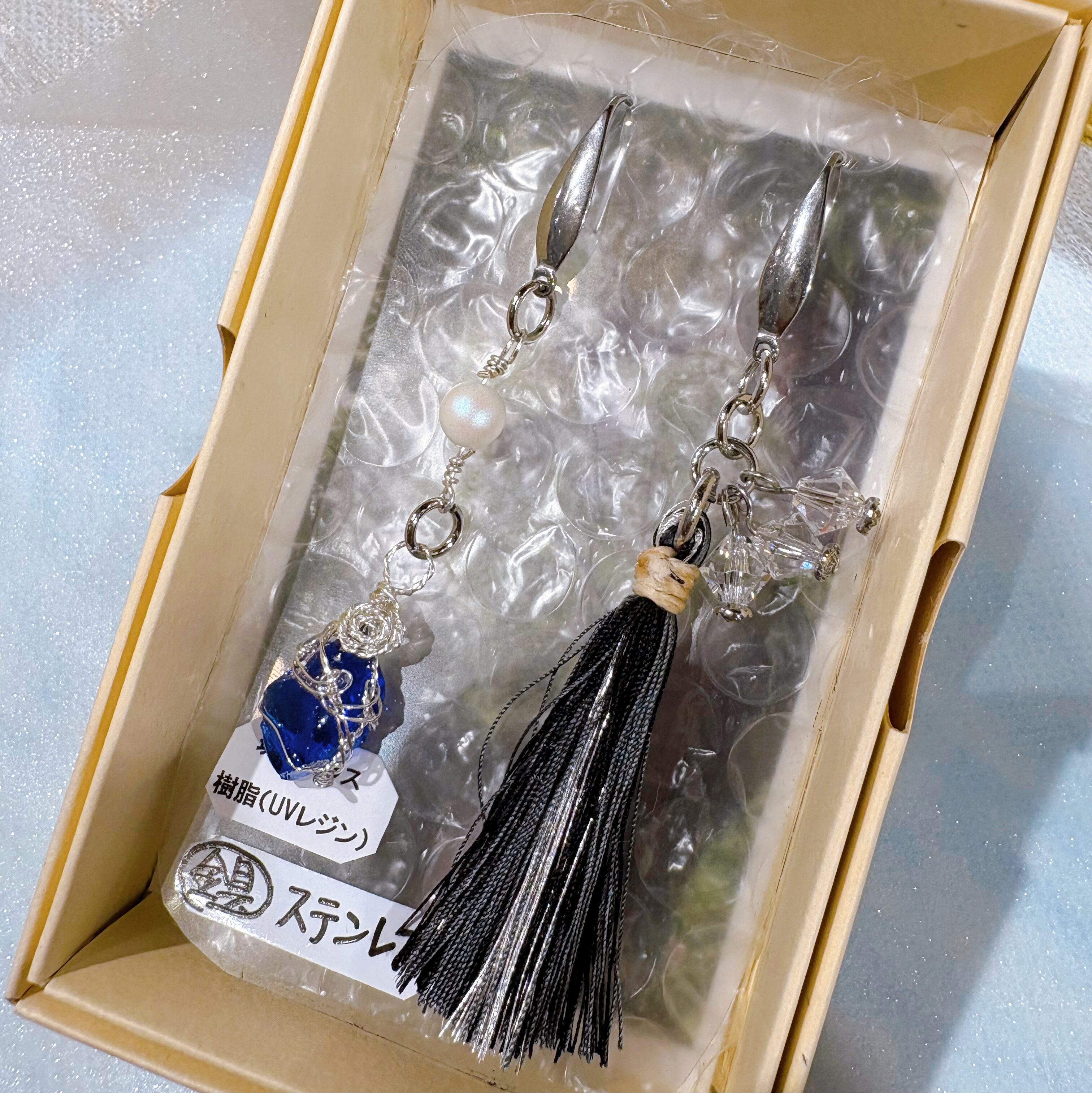 琉球ガラスの魅力を感じさせるアクセサリーは、深みのある黒と紺の組み合わせが特徴的で、シックで洗練された印象を与えるデザインです。手作りの技術が光るこのアクセサリーは、耳元で優雅に揺れ、特別な瞬間を演出します!シルバーのパーツがガラスの美しい色合いを引き立て、シンプルながらも存在感のあるスタイルを実現します。