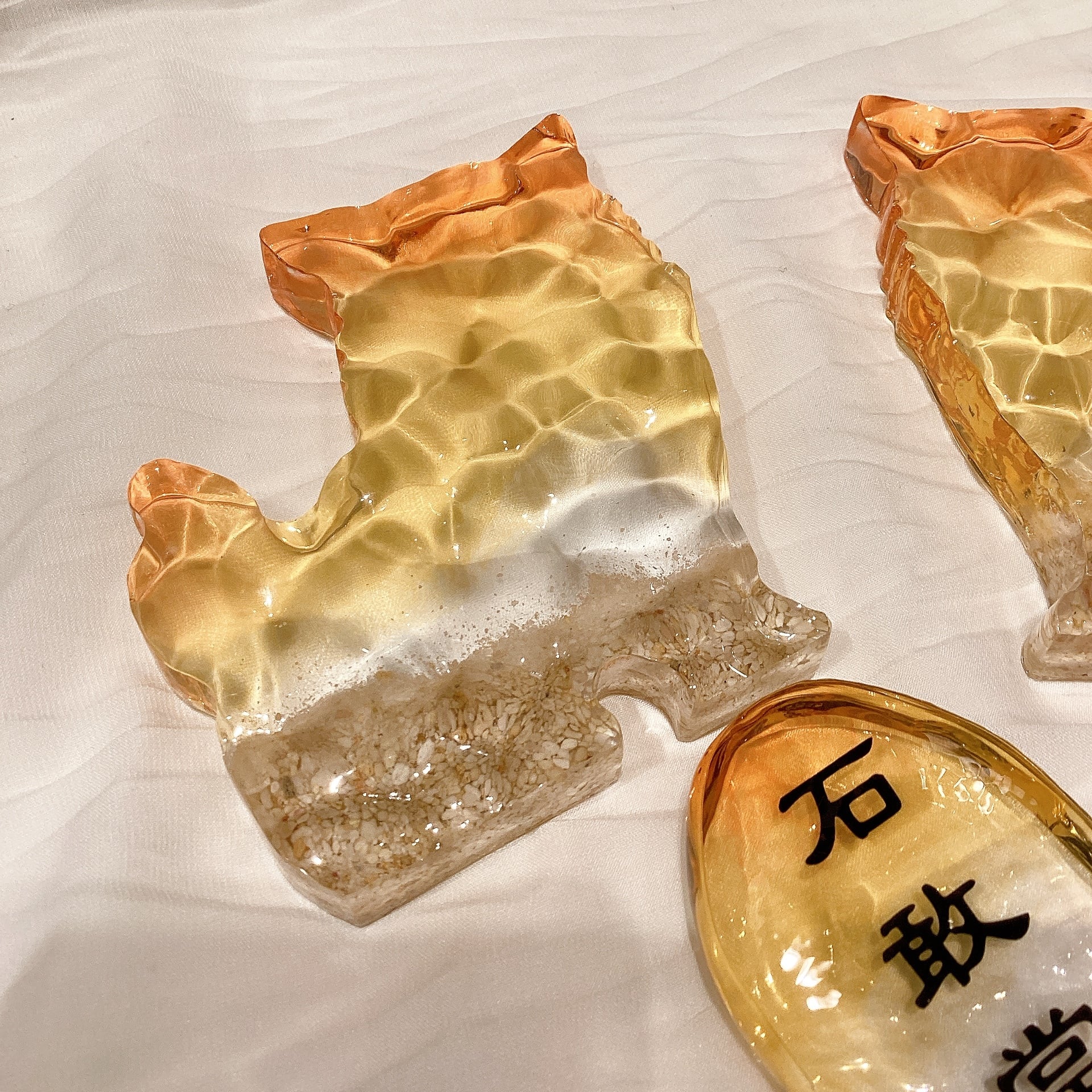 沖縄の海を特殊技術を施した波紋アートでシーサーと石敢當を表現。