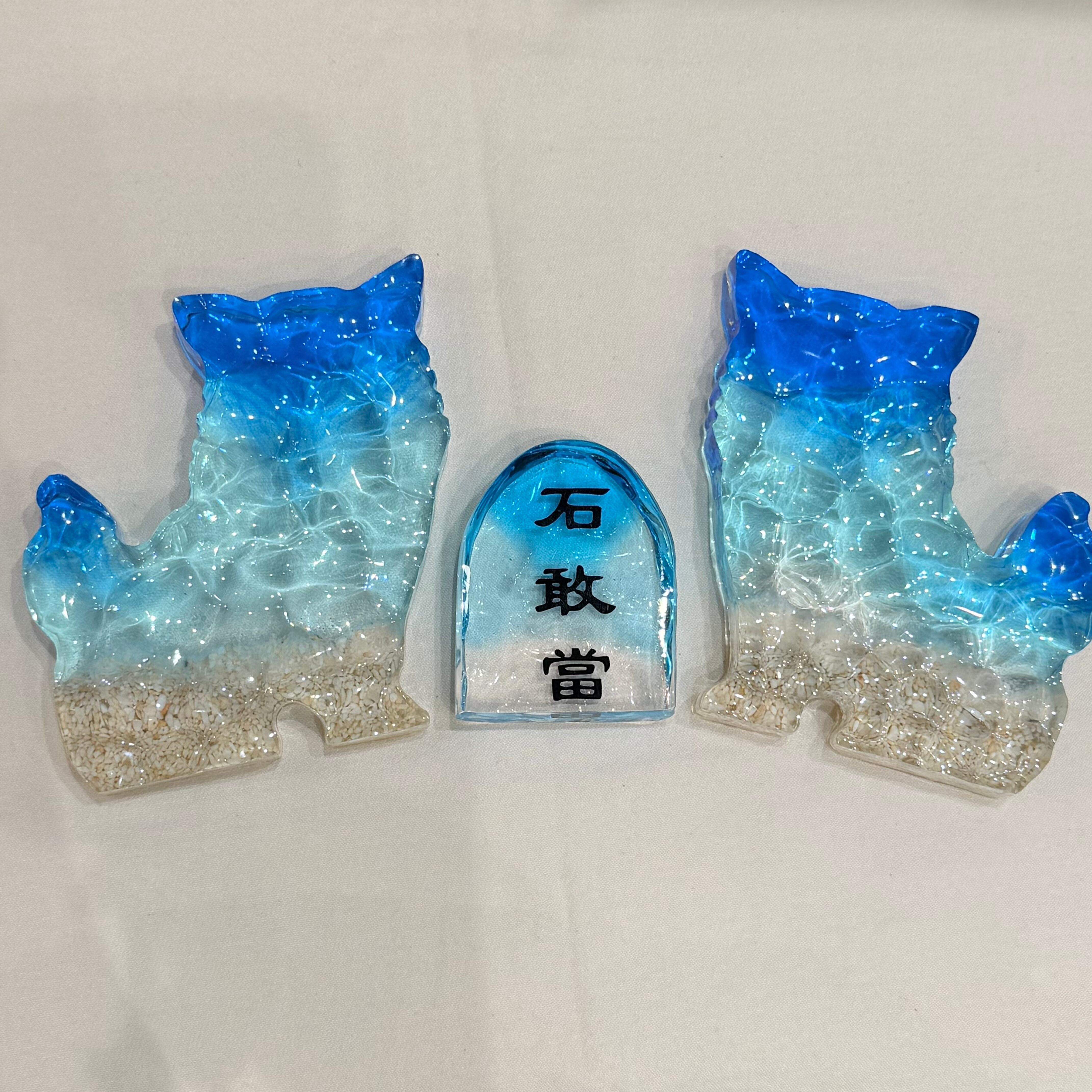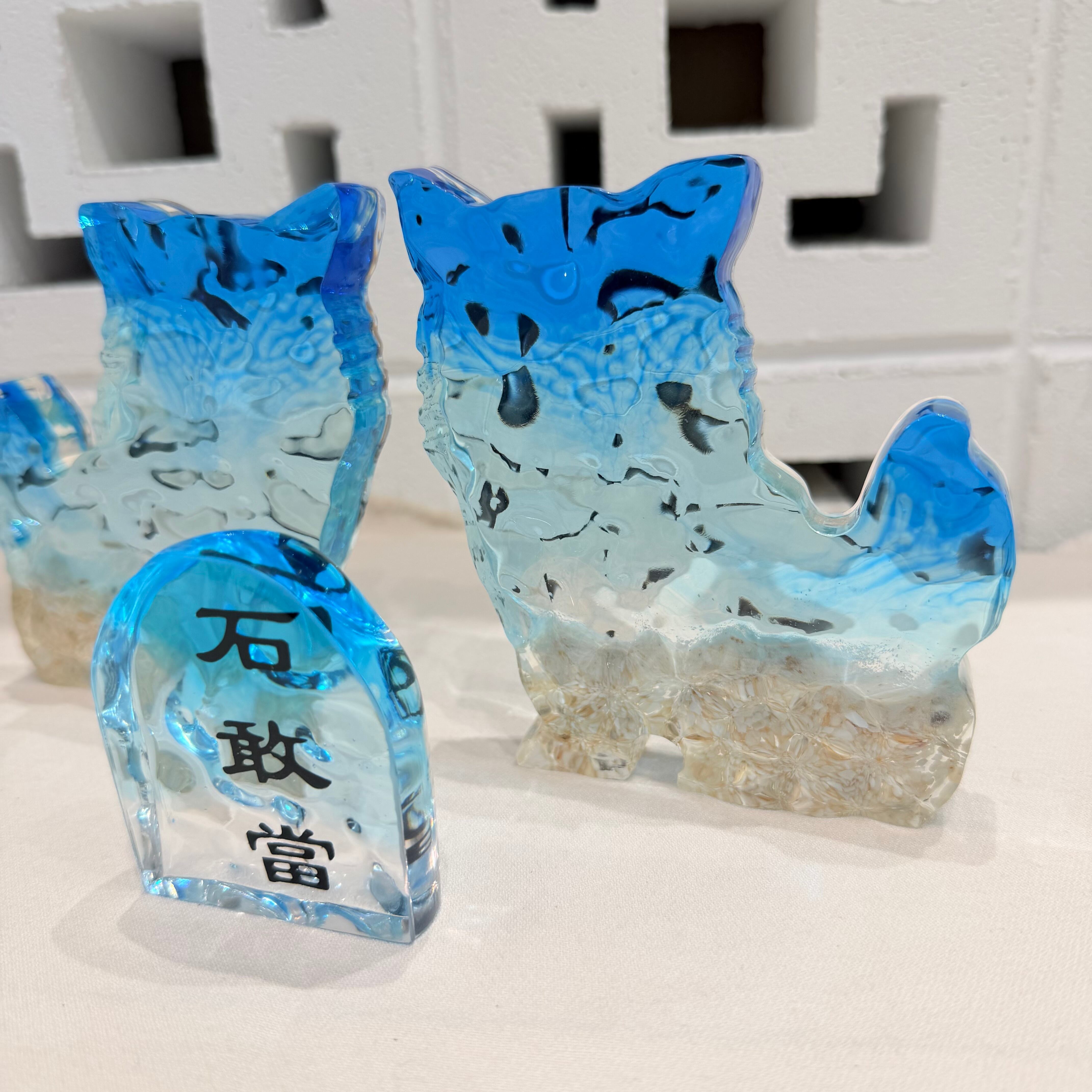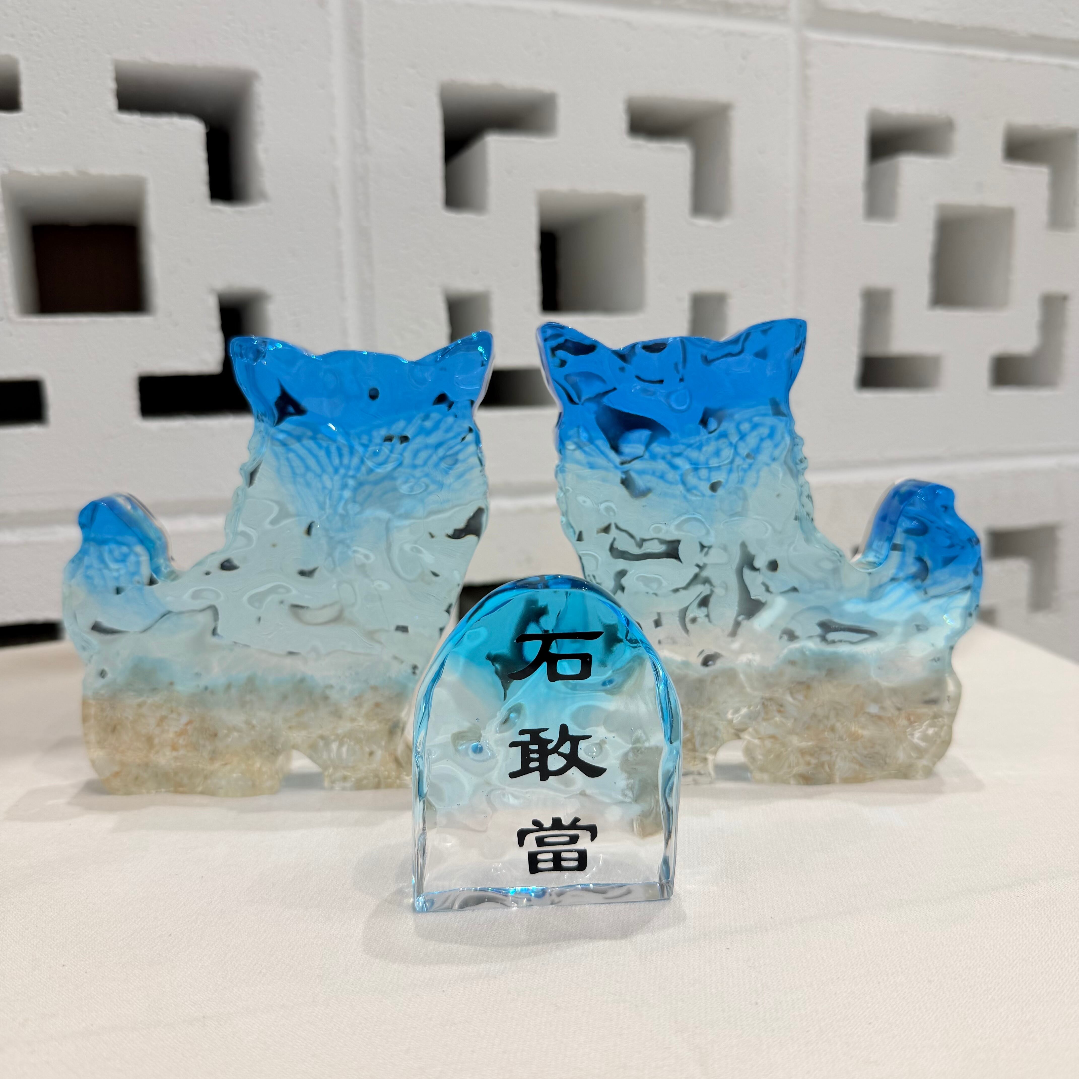 沖縄の海をイメージさせ特殊技術を施した波紋アートシーサーと石敢當。シーサーと石敢當は、沖縄で昔から家の魔物の侵入を防ぎ幸福をもたらすアイテムとして親しまれています。シーサーはオスとメスのペアで飾ることが一般的です。