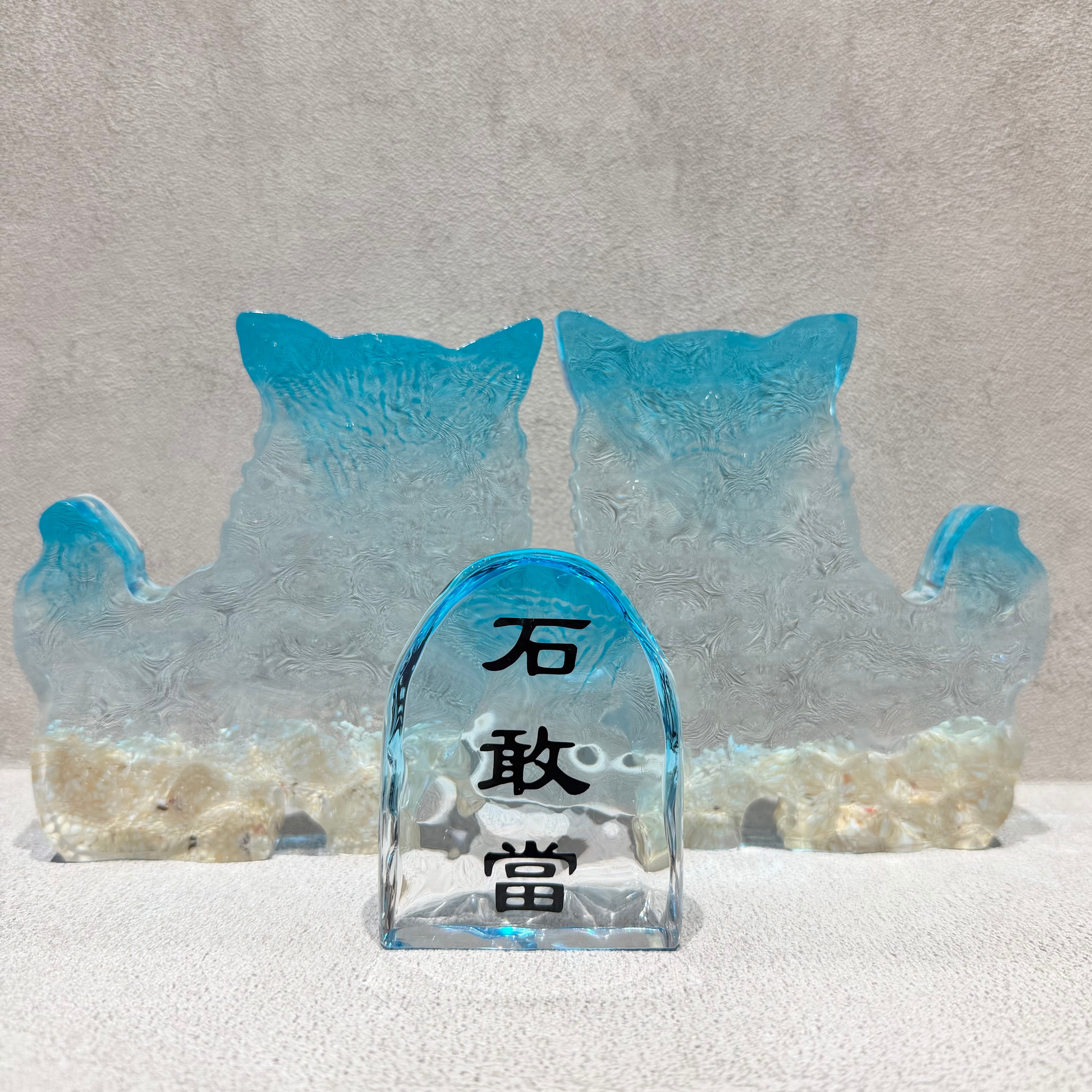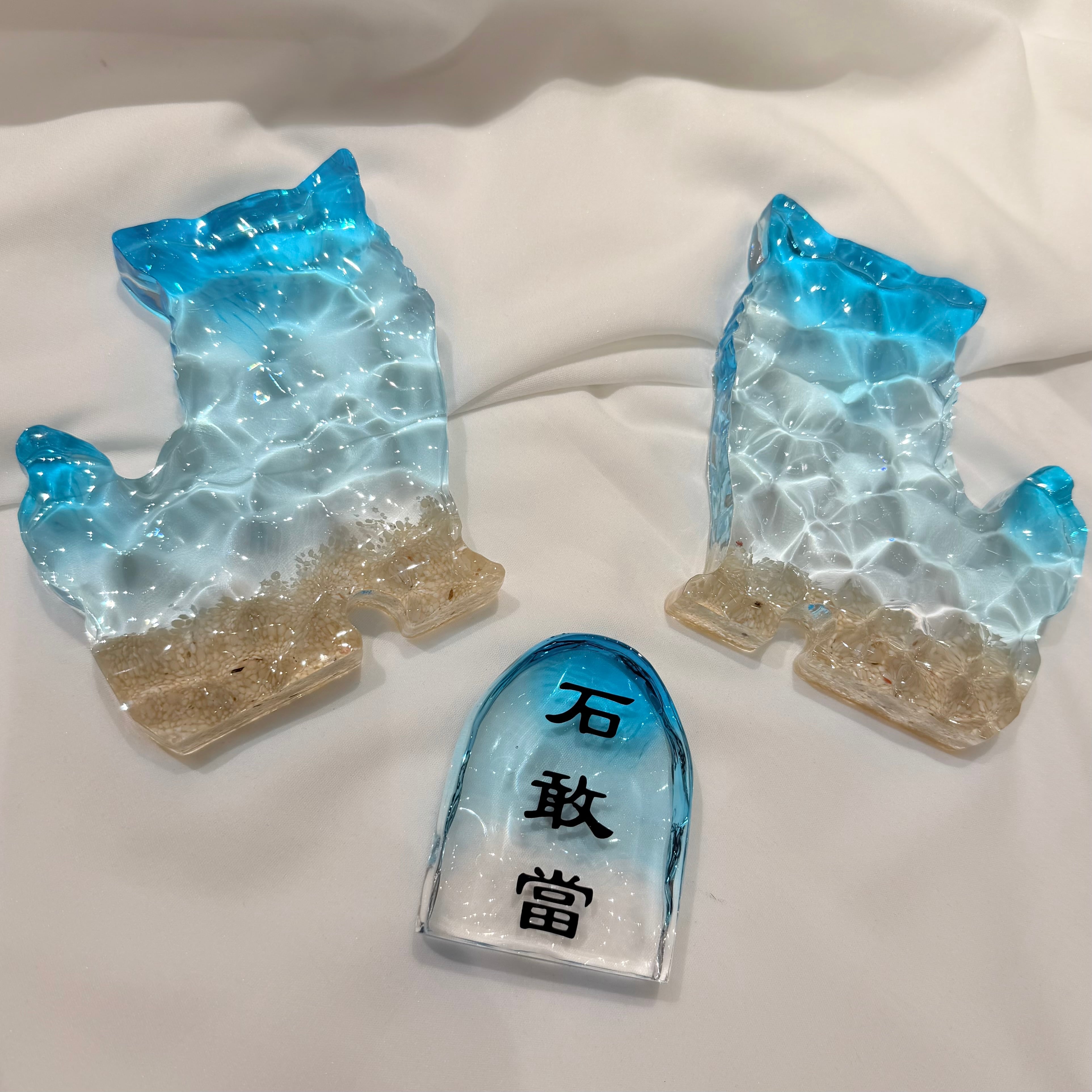 沖縄の海をイメージさせ特殊技術を施した波紋アートシーサーと石敢當。シーサーと石敢當は、沖縄で昔から家の魔物の侵入を防ぎ幸福をもたらすアイテムとして親しまれています。オスとメスのペアで飾ることが一般的です。