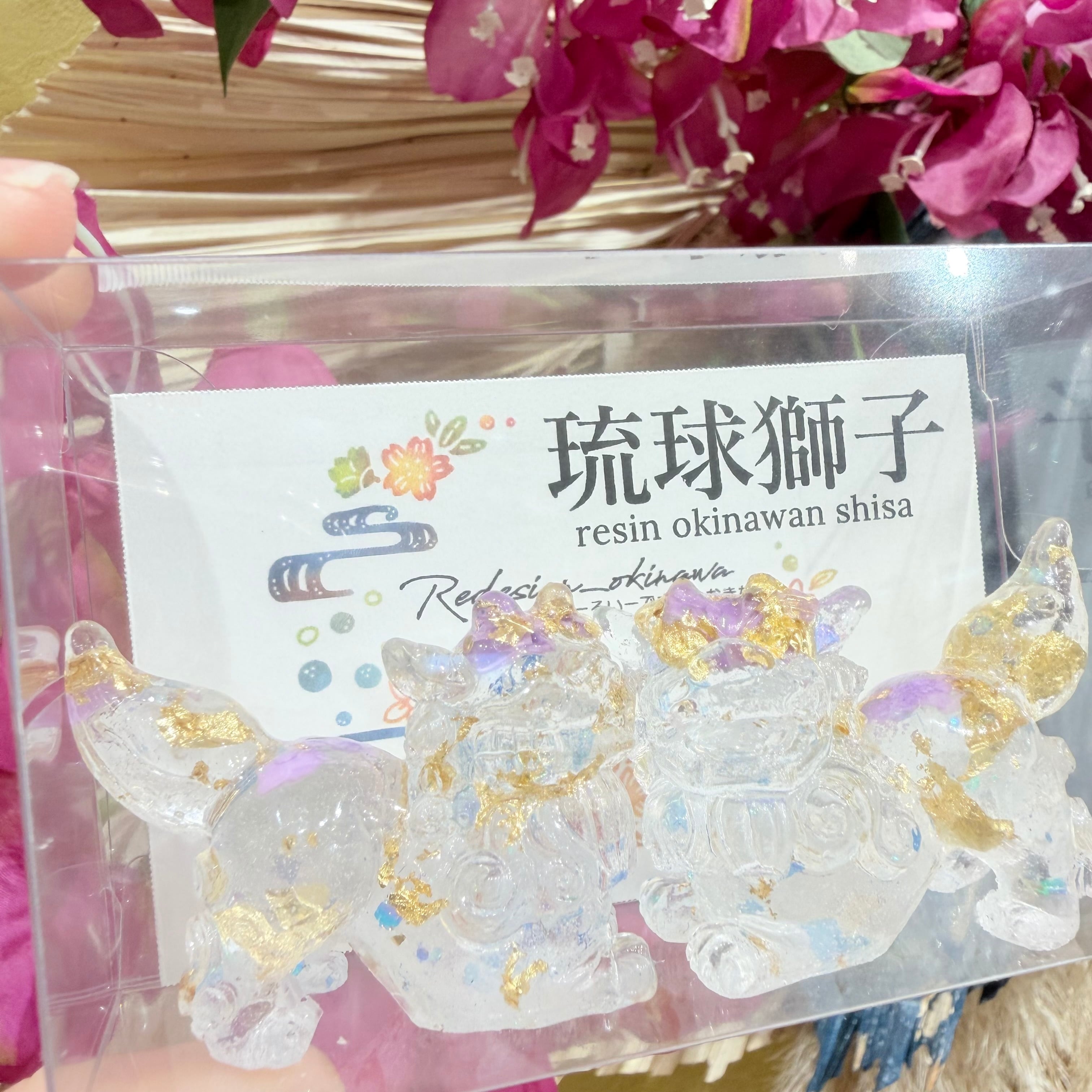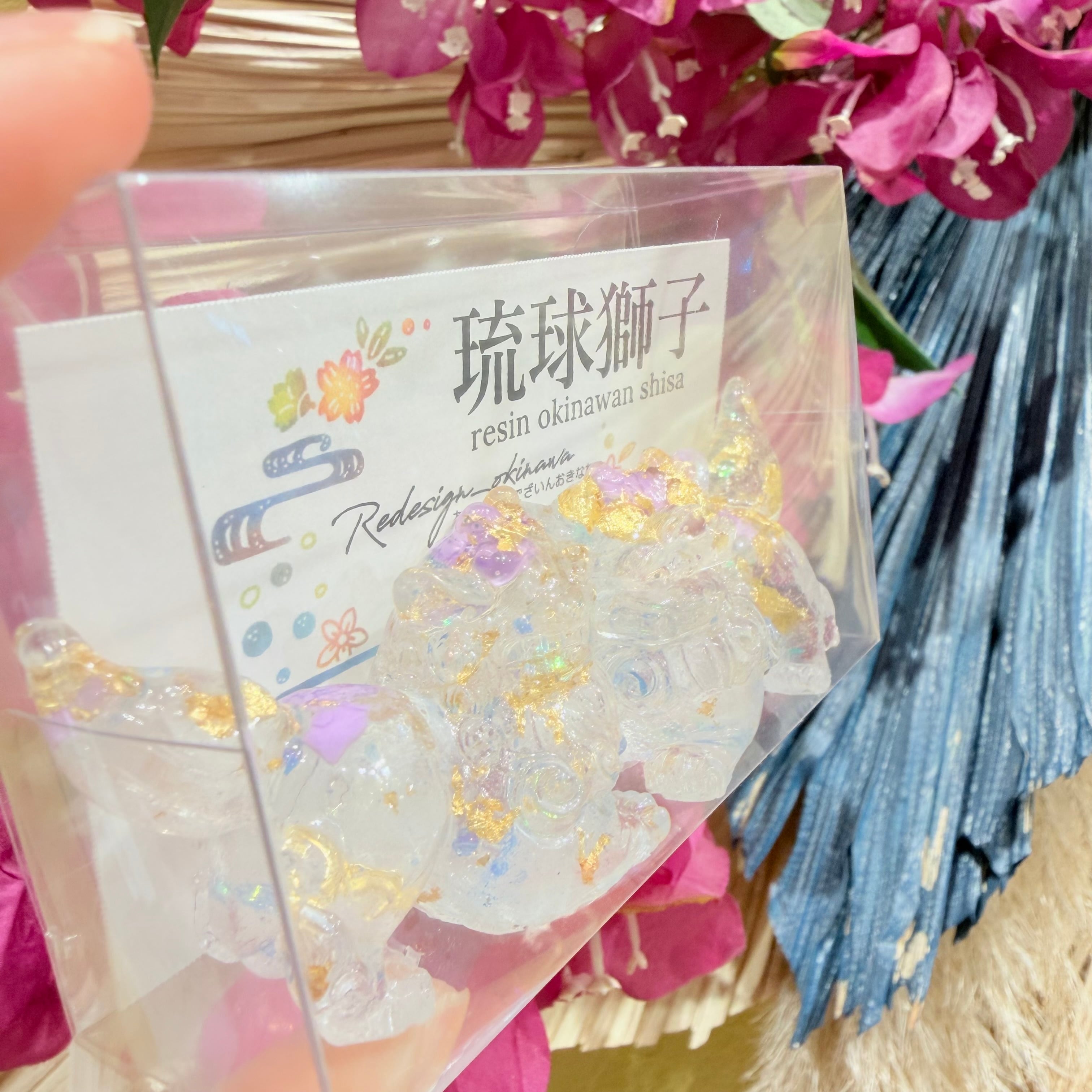 レジンシーサー ホワイトは、あなたの空間に華やかさを加える特別なアイテムです!若干透明感もあり水色ラメが、シーサー本来の可愛らしさを一層引き立てています。この美しいデザインは、リビングや玄関など、さまざまな場所に溶け込み、見る人に癒しを提供することでしょう。