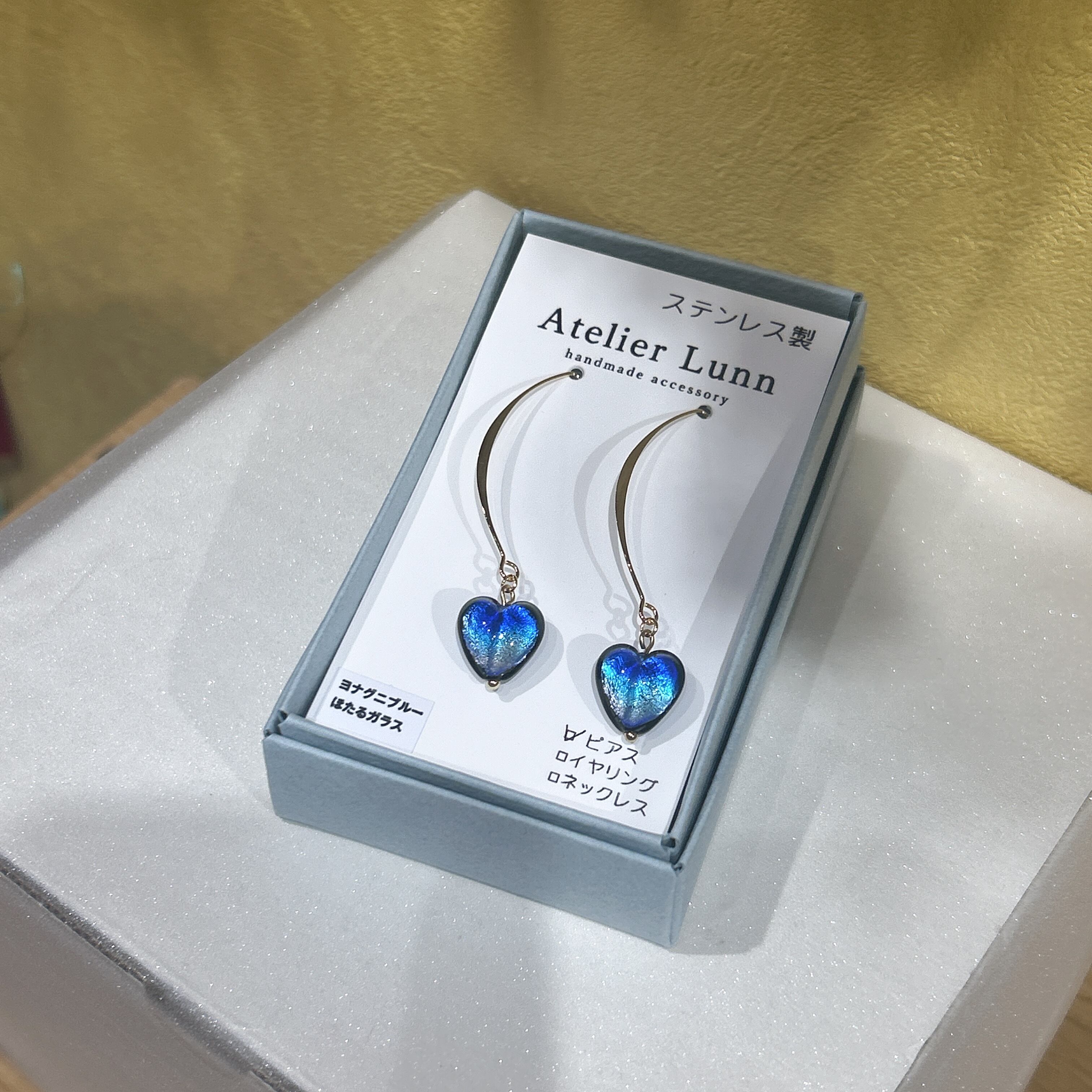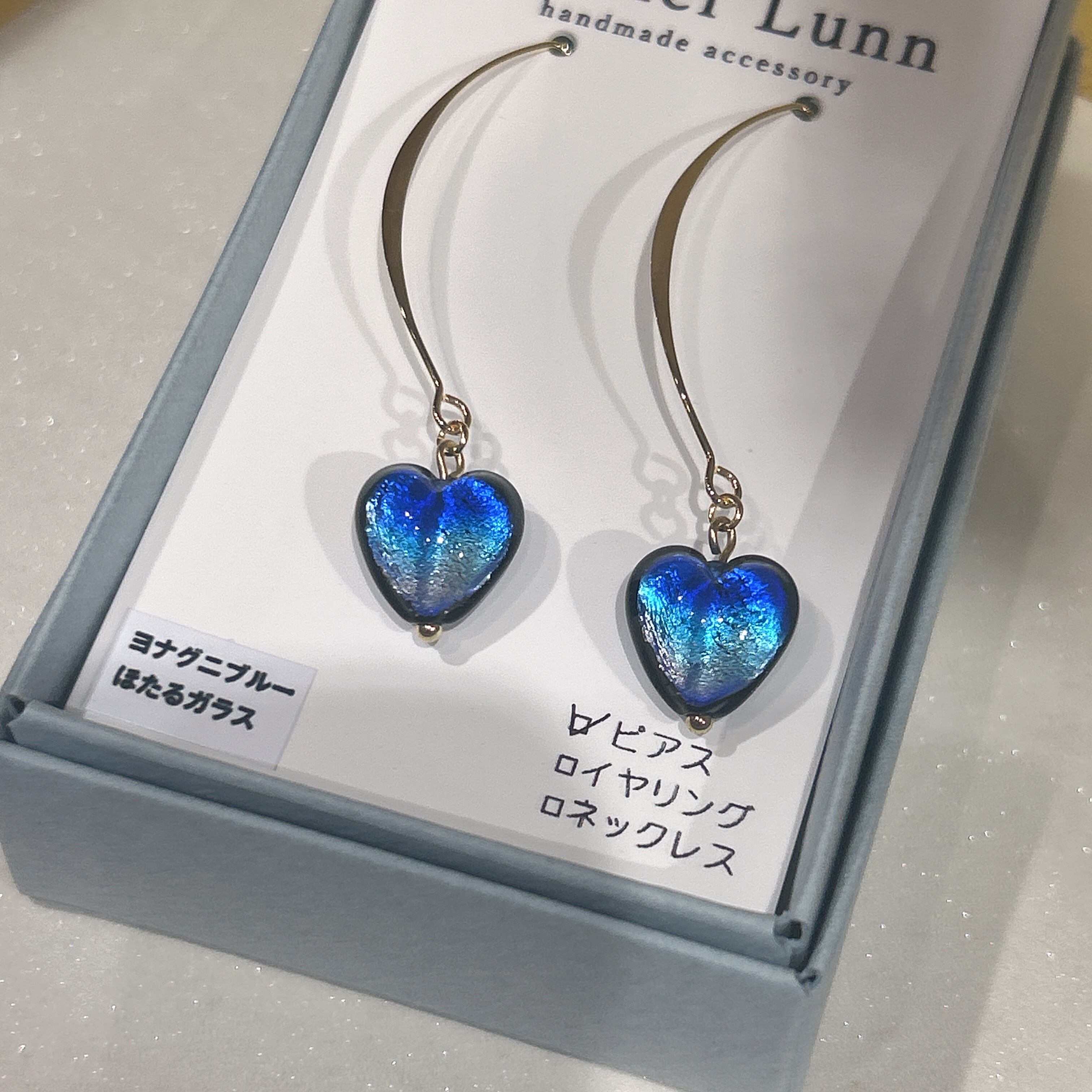 ハート型のピアスが耳元を華やかに彩ります!Atelier Lunnが手掛けたほたるガラスピアスは、垂れるデザインが特徴で、心にひかる美しいヨナグニブルーが印象的です。