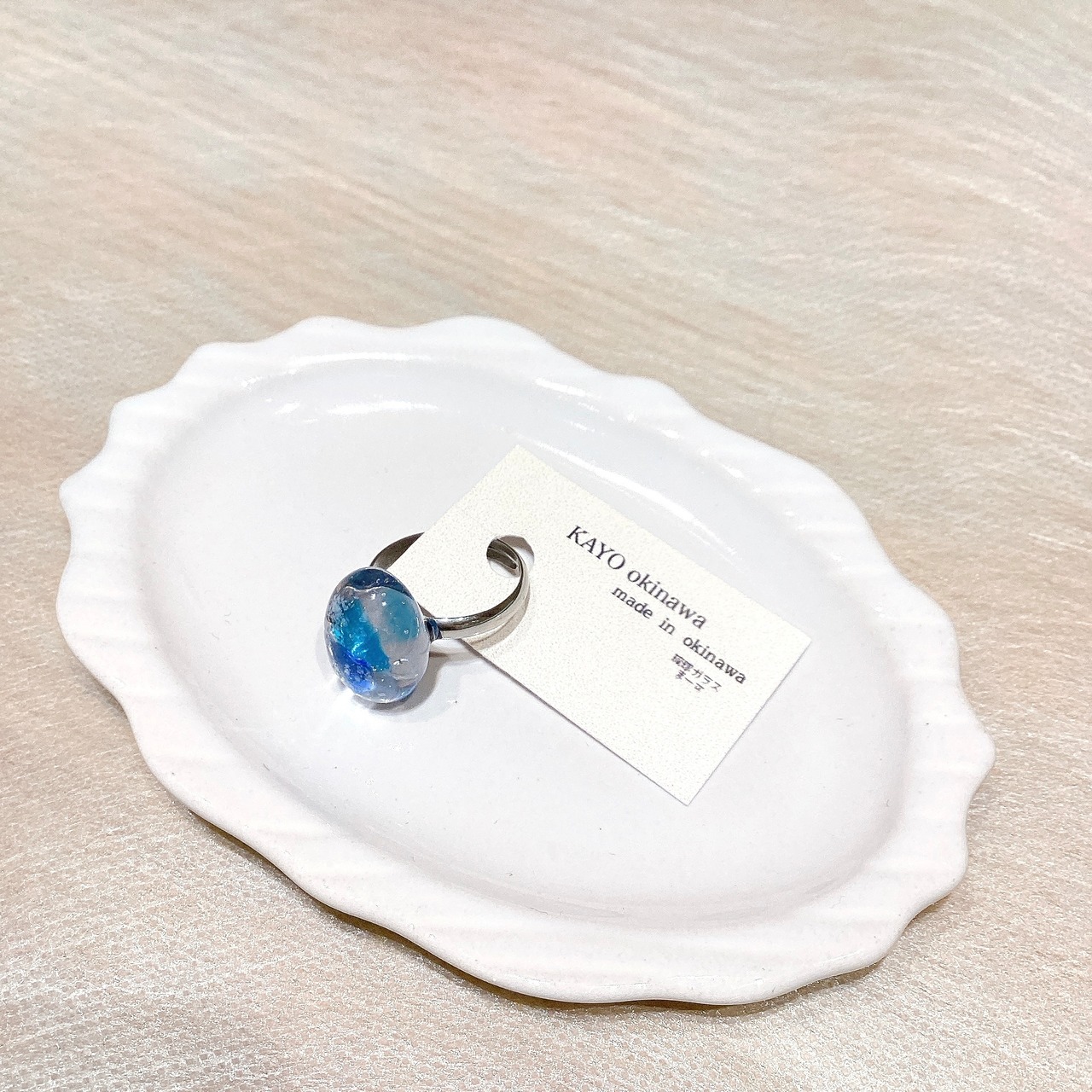 ブルーの琉球ガラスのカケラをまーすと共に閉じ込めた美しいリングが登場です!沖縄の海を感じさせるブルーの色合いが、指元を華やかに演出し、見る人の視線を惹きつけます。