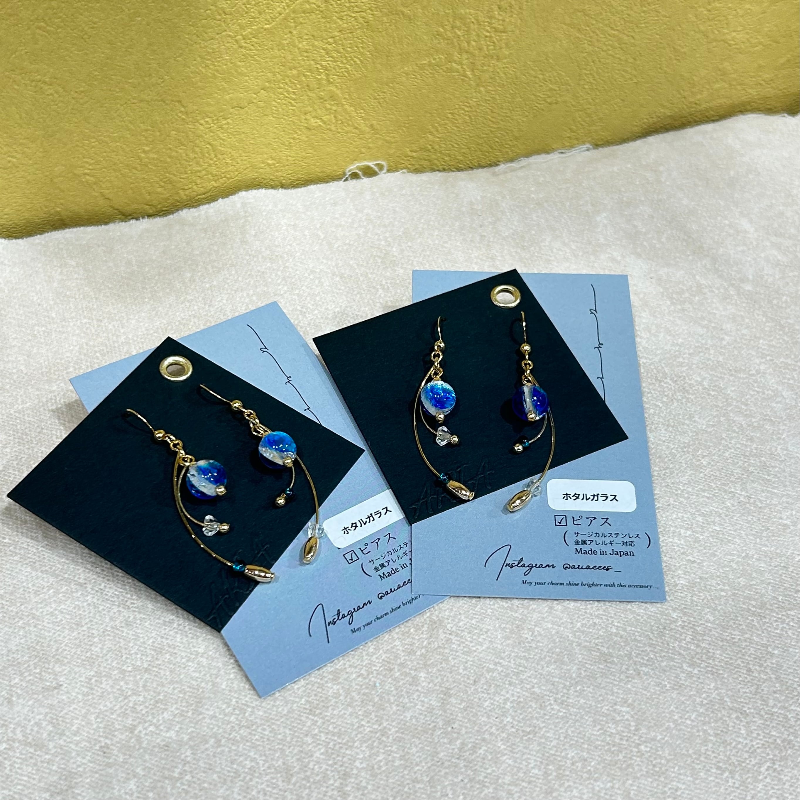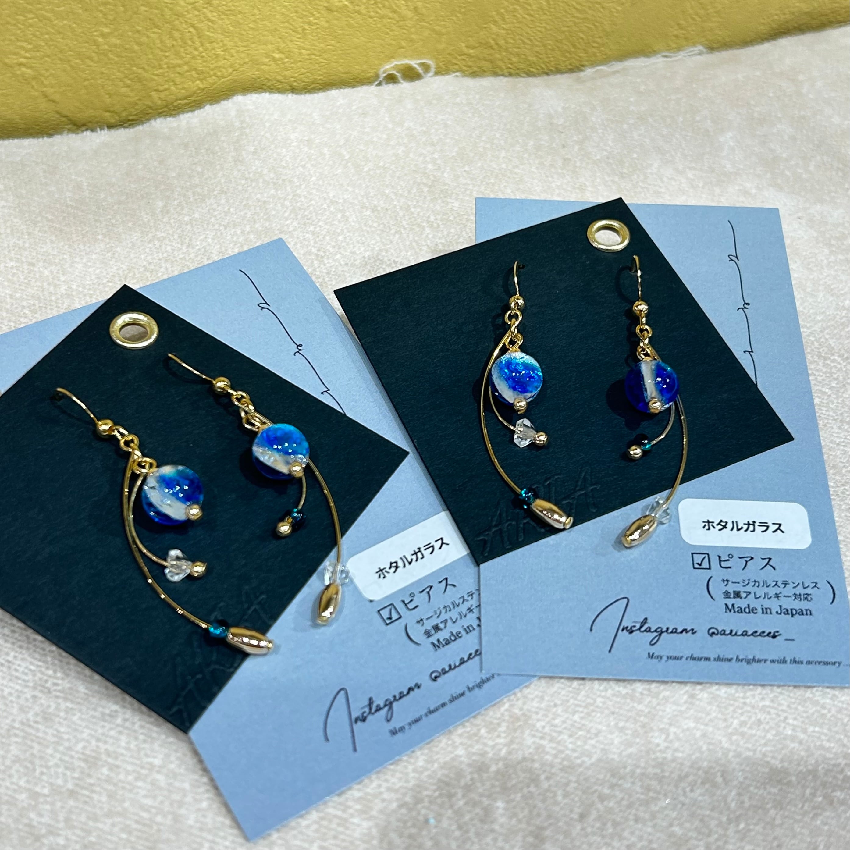 このピアスは、手作業で仕上げられたホタルガラスの魅力を存分に楽しめる一品。サージカルステンレスのフックが付いており、安心してご使用いただけます♪