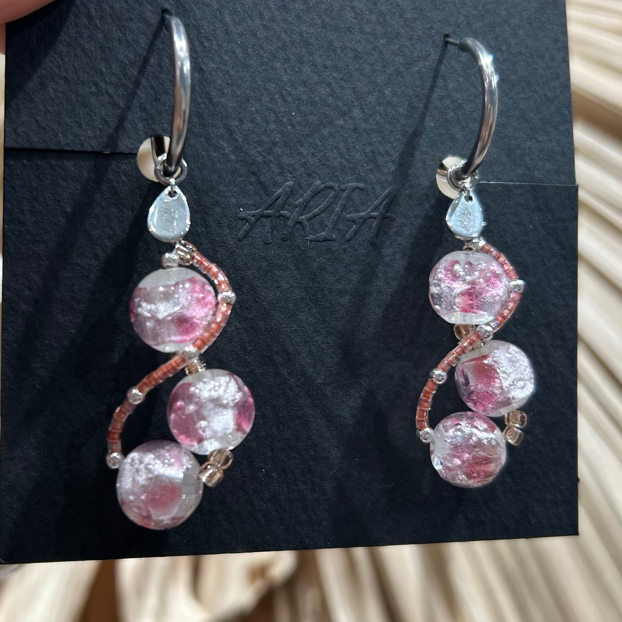 華やかなピンクが印象的なARIAのホタルガラスピアス【long】が新たにラインナップされました!手作業で丁寧に仕上げたホタルガラスのきらめきが特長です。サージカルステンレスのフックを使用しているため、安心して毎日お使いいただけるアイテムです♪
