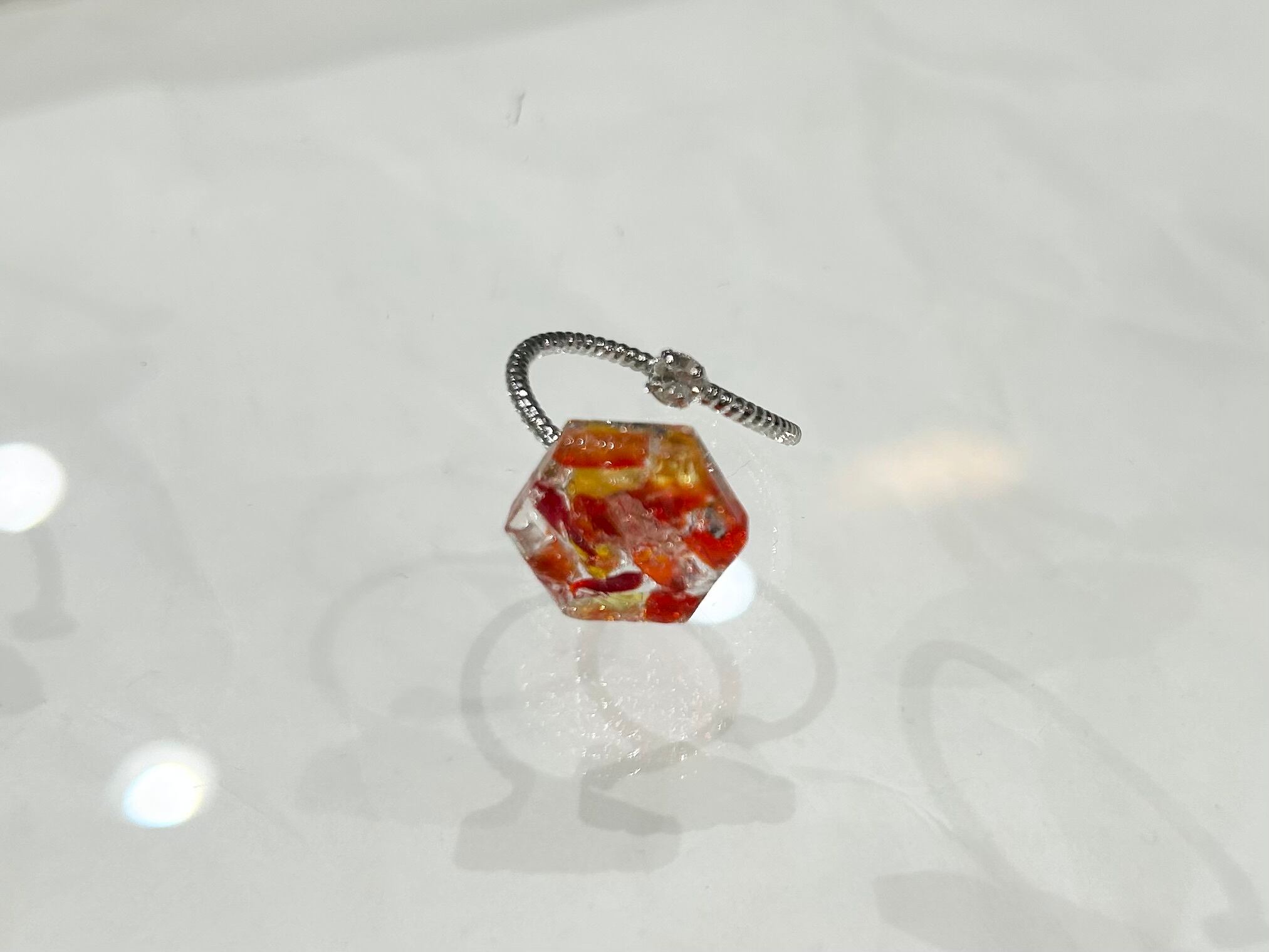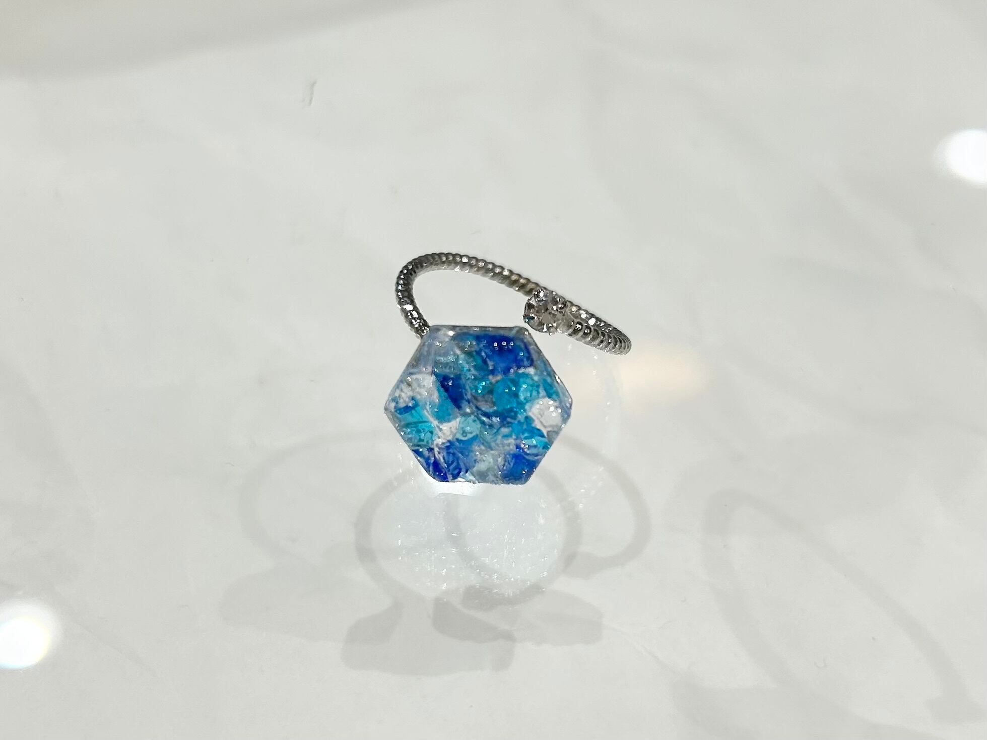 琉球ガラスリング 切子は、一つ一つ丁寧に作られた美しいアイテムです。琉球の伝統工芸を感じさせるレジでコーティングされた切子模様は、どこか懐かしさとともに、現代的な魅力を併せ持っています!このリングは、手元を華やかに彩り、特別な瞬間を演出します。