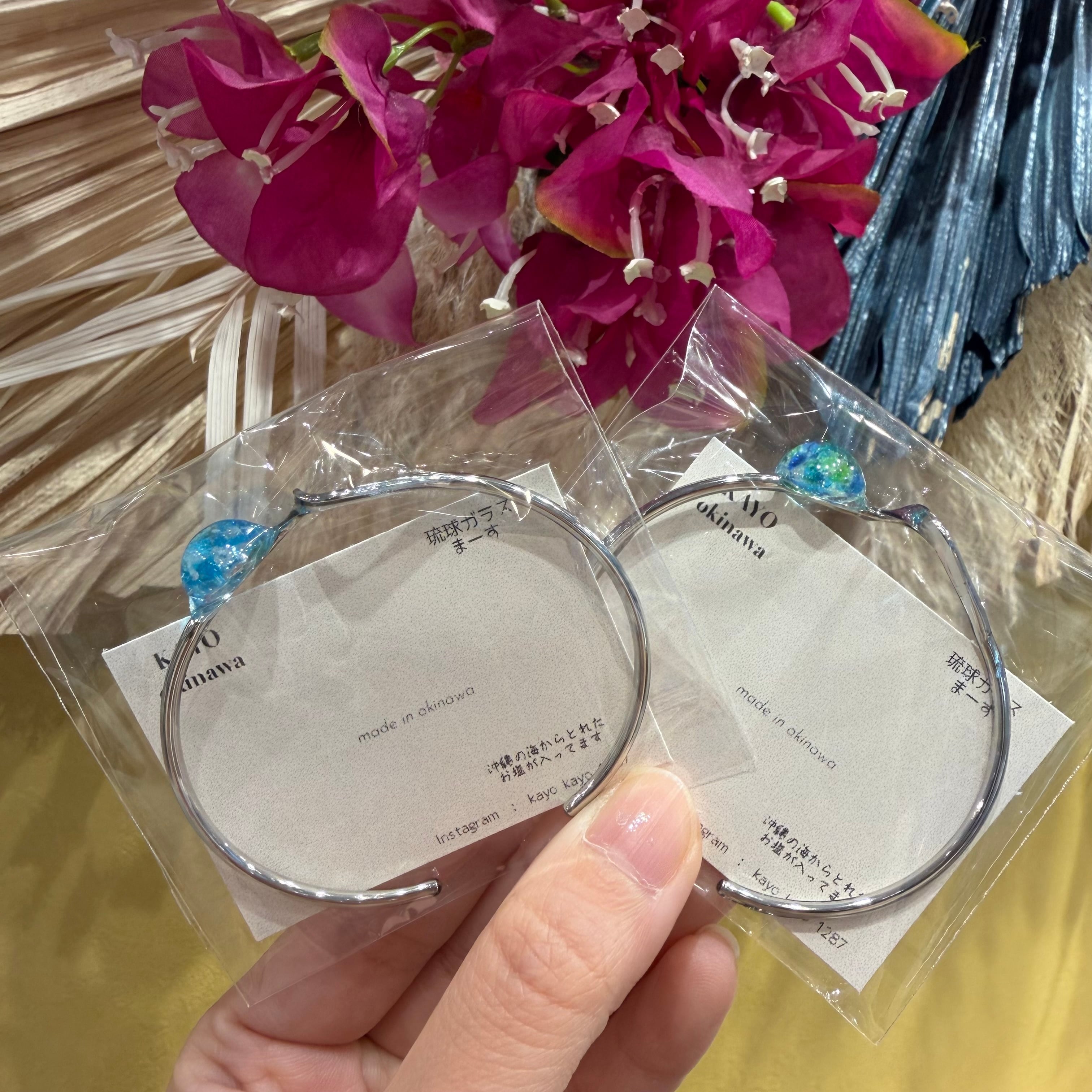 琉球ガラスのカケラと沖縄の自然の恵みを詰め込んだお塩まーす入りのお守りバングルがネットでも購入できます!まーすの質感と琉球ガラスの透明感が絶妙に組み合わさり、手元を華やかに演出してくれます。