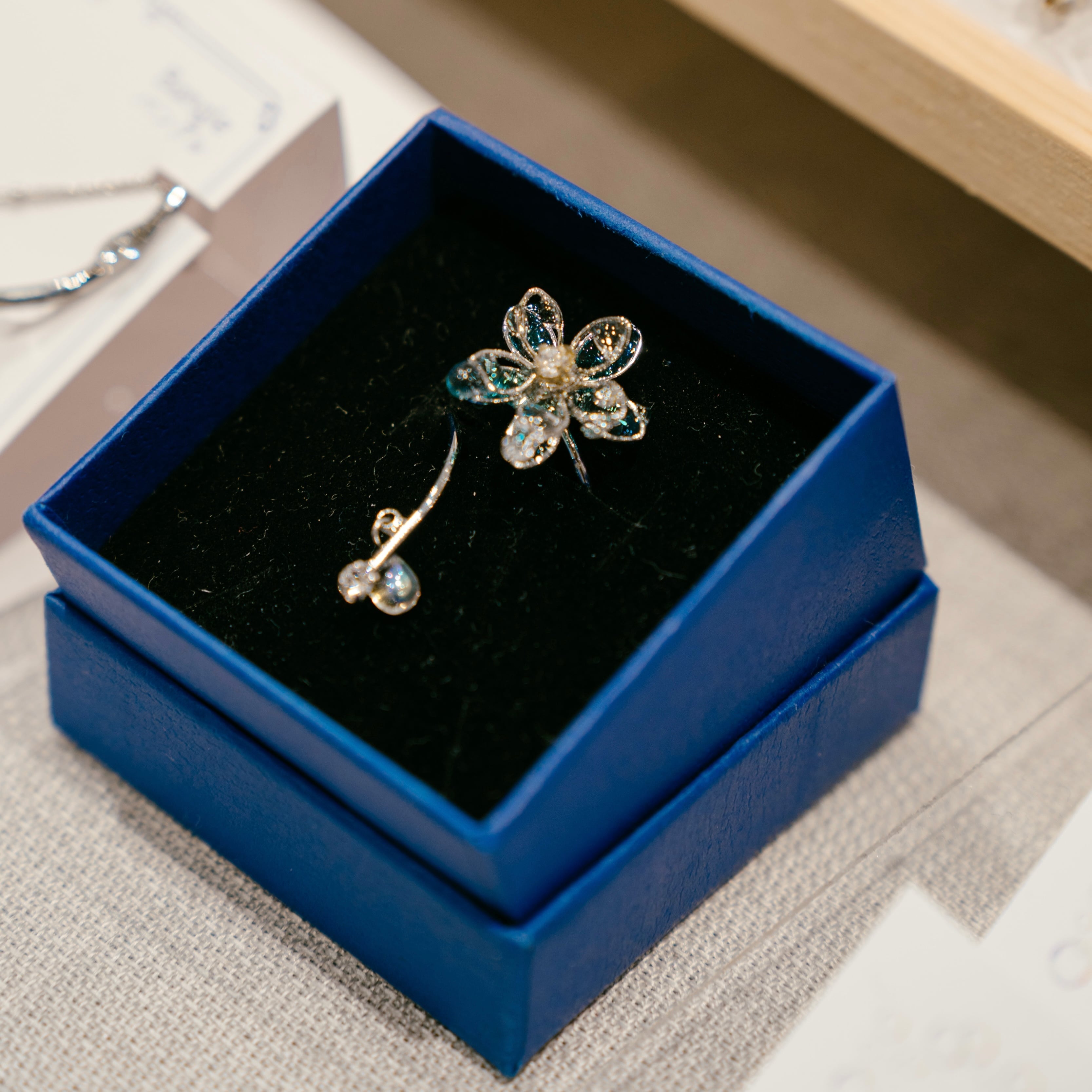 澄んだブルーの花びらに、朝露や水滴をイメージしたレジンを添え、指先でそっと輝く表情に仕上げました。