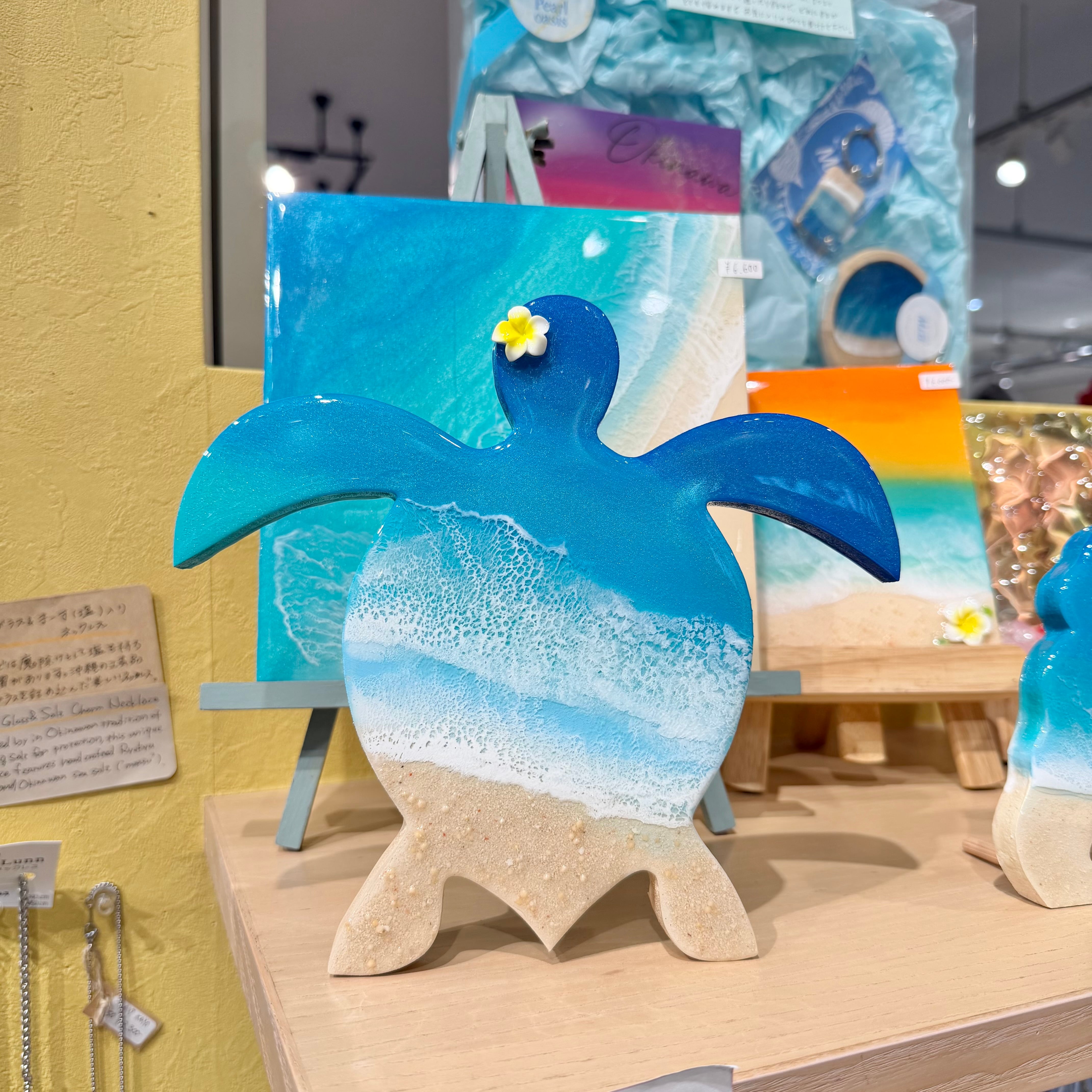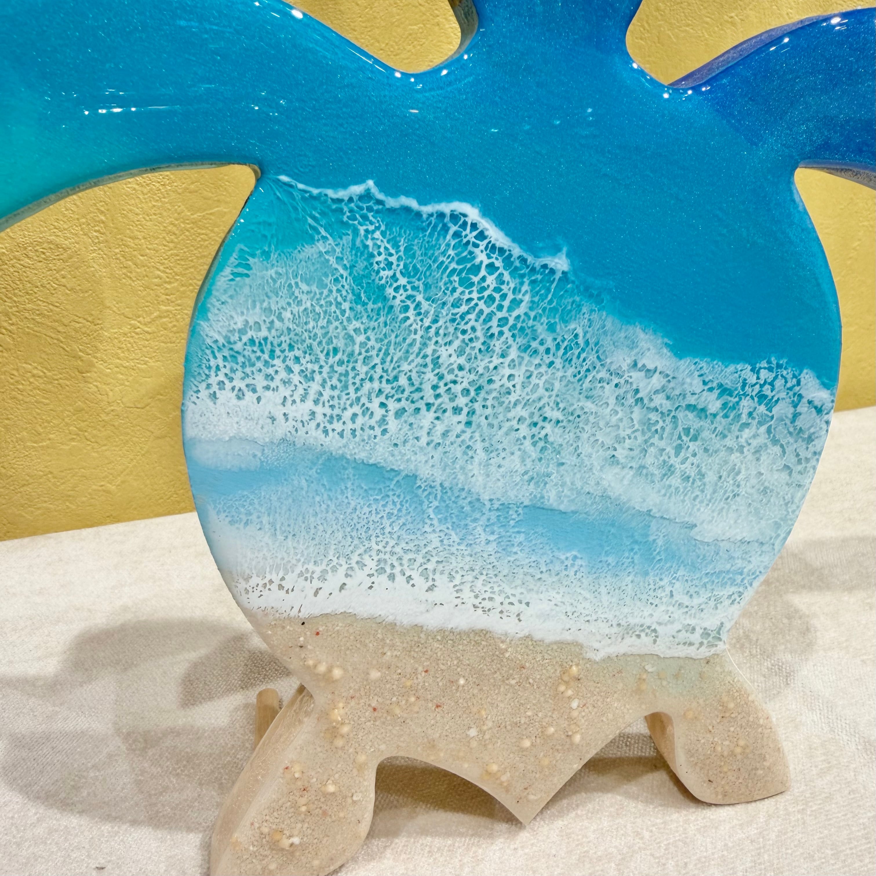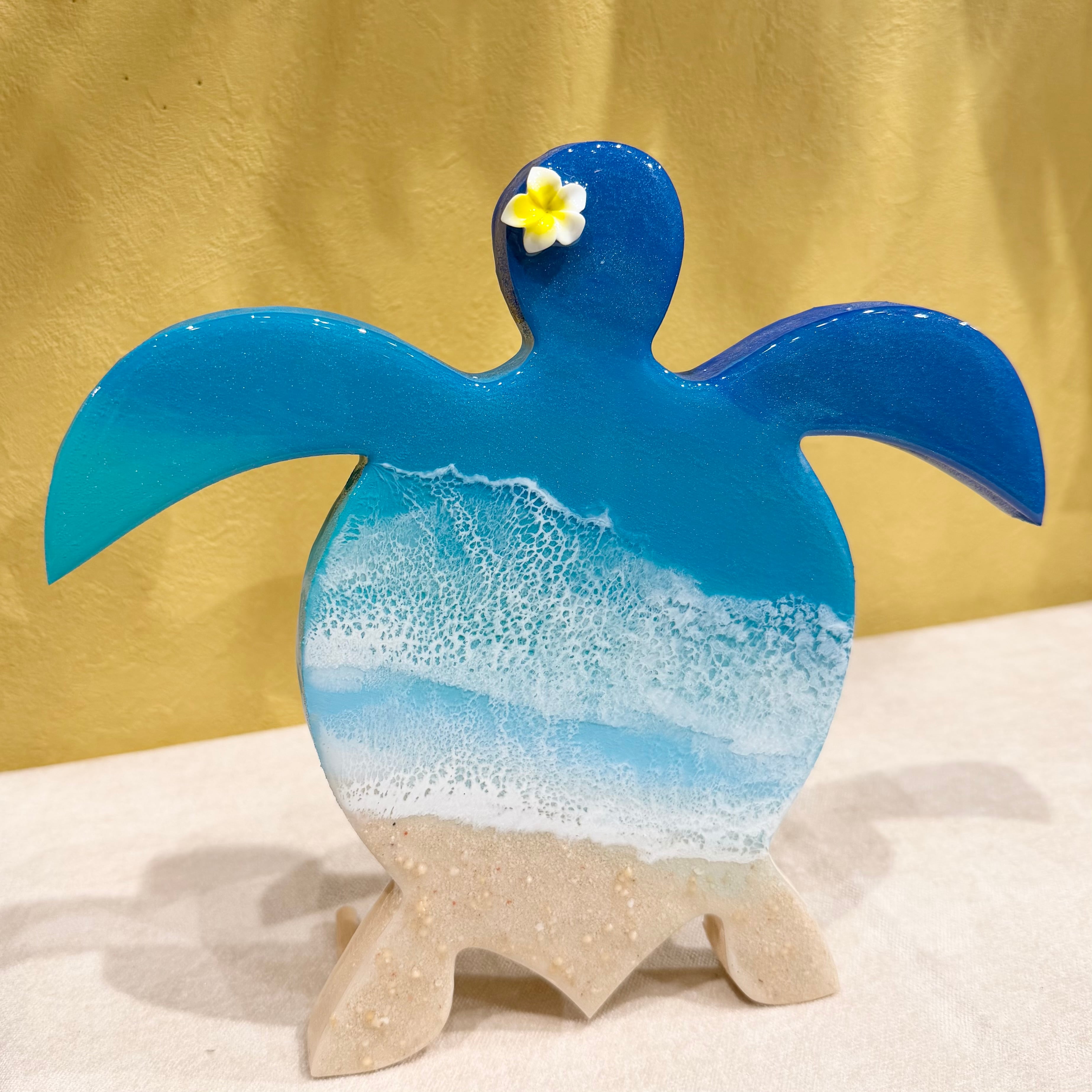 レジン波アート ホヌは、沖縄の海の神秘を感じさせる美しいデザインで、あなたの空間に特別な雰囲気をもたらします!ハンドメイドで仕上げられたこの作品は、まるで波が寄せては返すかのような、躍動感あふれる波模様が特徴です。こちらのアート作品は、部屋のインテリアとしてはもちろん、ギフトにも最適です☆ ホヌ(ウミガメ)のモチーフが、心を穏やかにさせる象徴的なデザインとなっており、見た目だけでなく、その存在感も感動を与えることでしょう。美しい青色と透明感が奏でる調和は、心に癒しを与えるアイテムです。