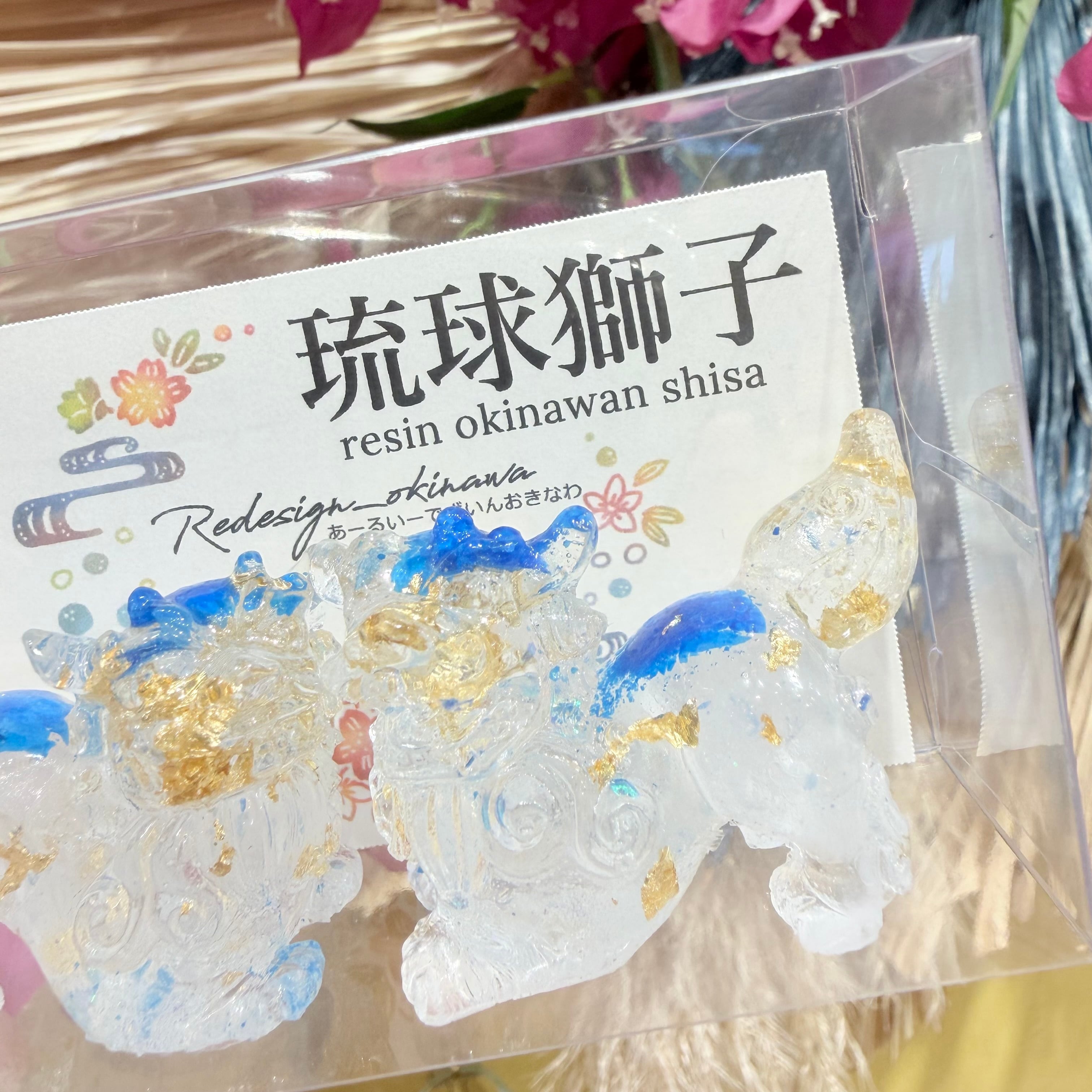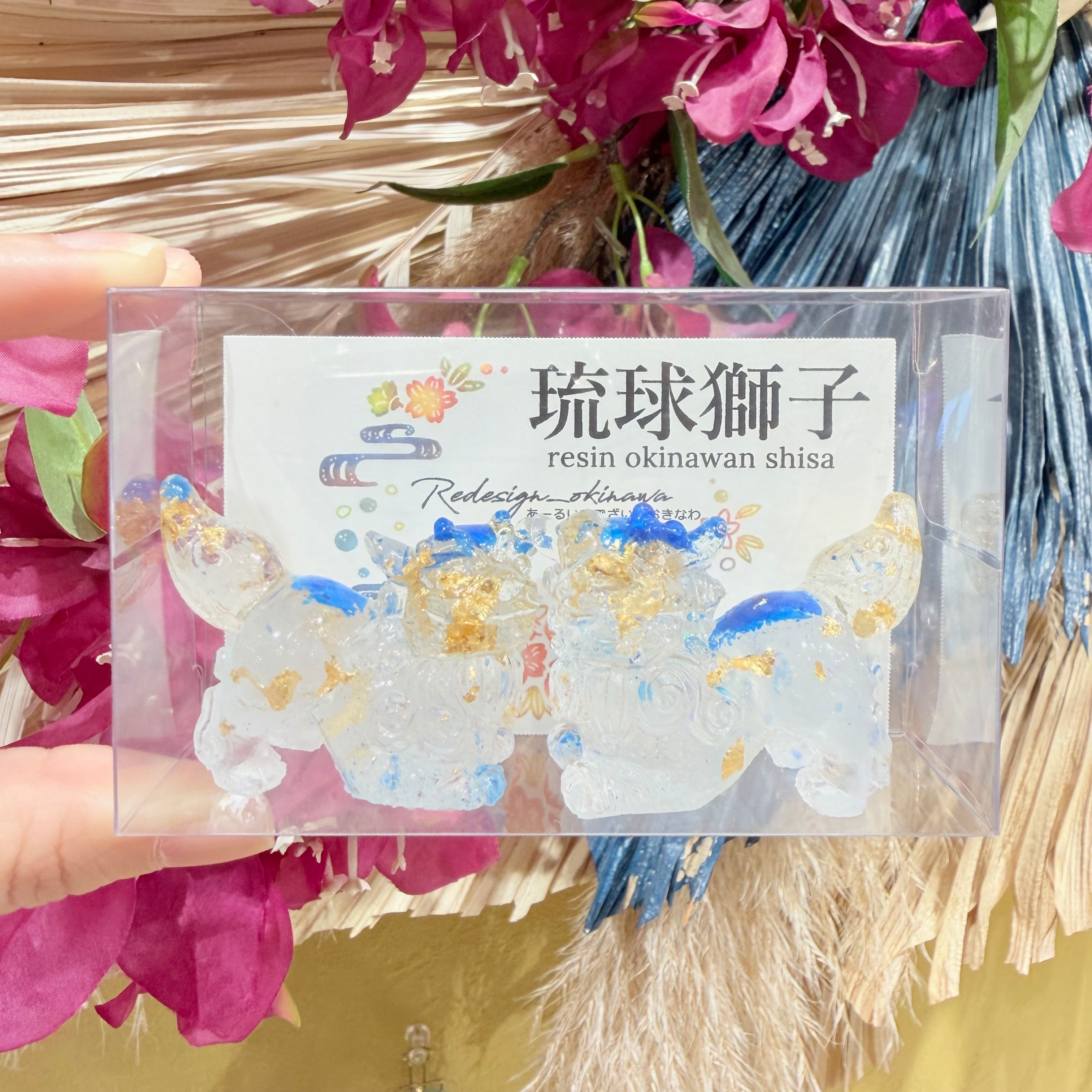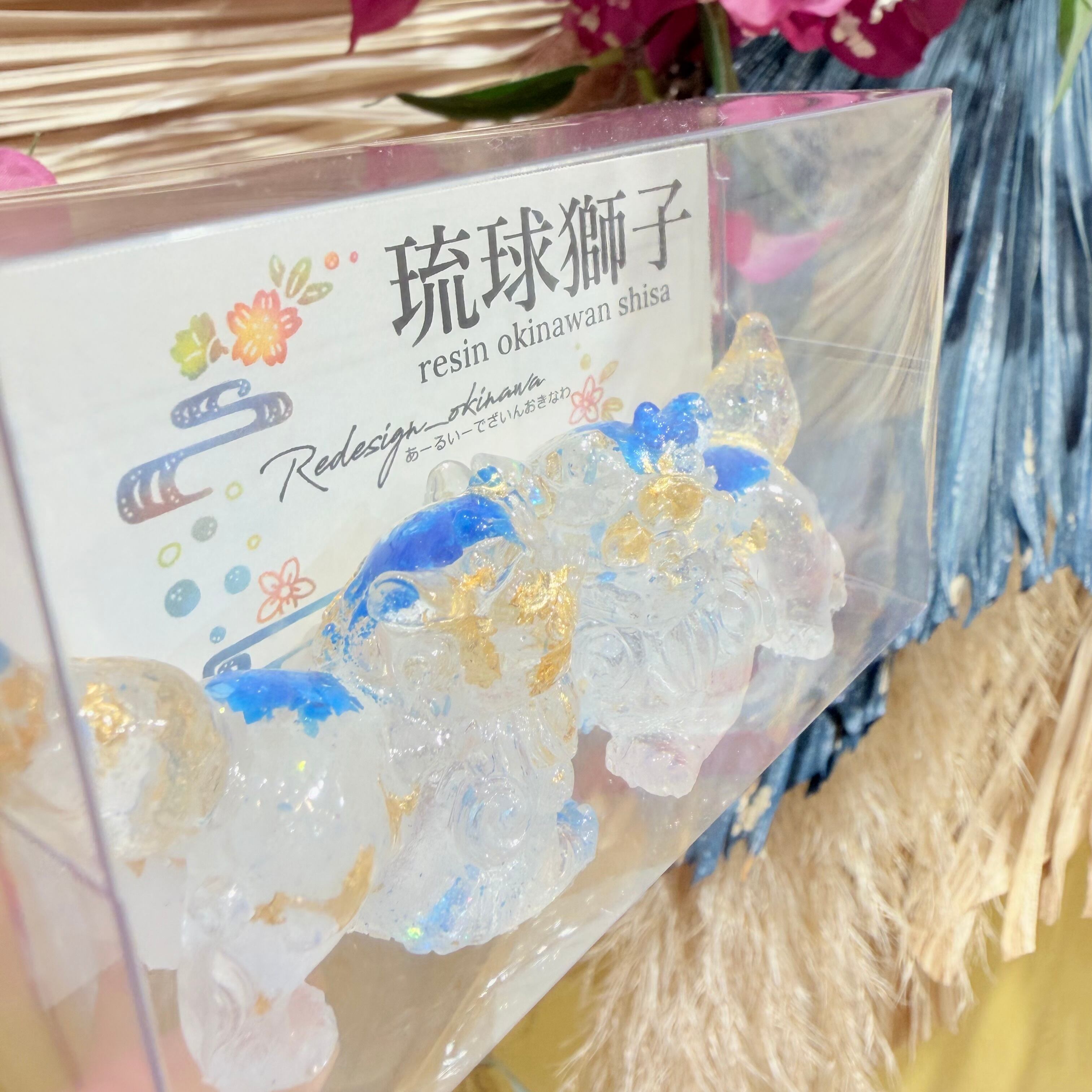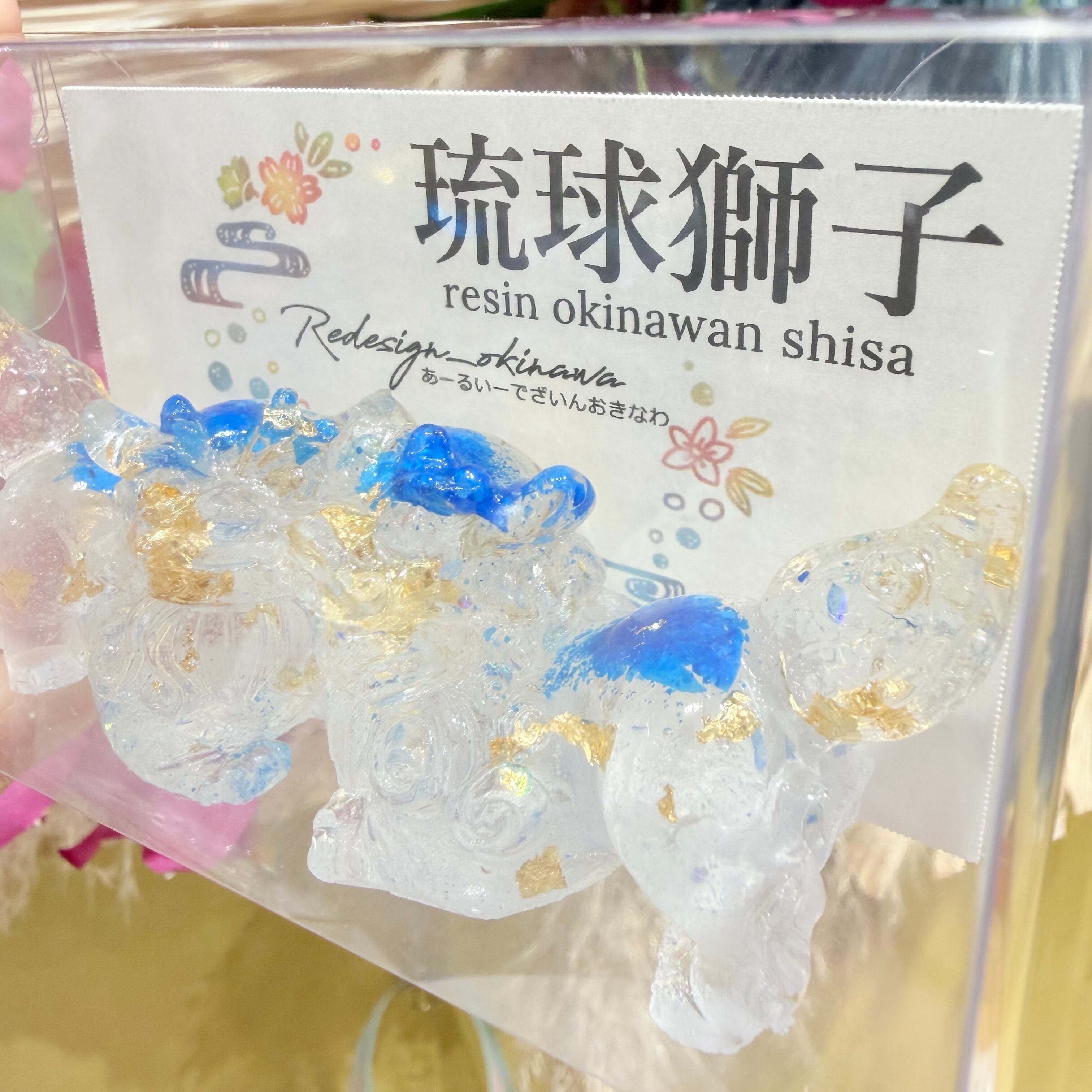 レジンシーサー は、あなたの空間に華やかさを加える特別なアイテムです!若干透明感もあり水色ラメが、シーサー本来の可愛らしさを一層引き立てています。この美しいデザインは、リビングや玄関など、さまざまな場所に溶け込み、見る人に癒しを提供することでしょう。