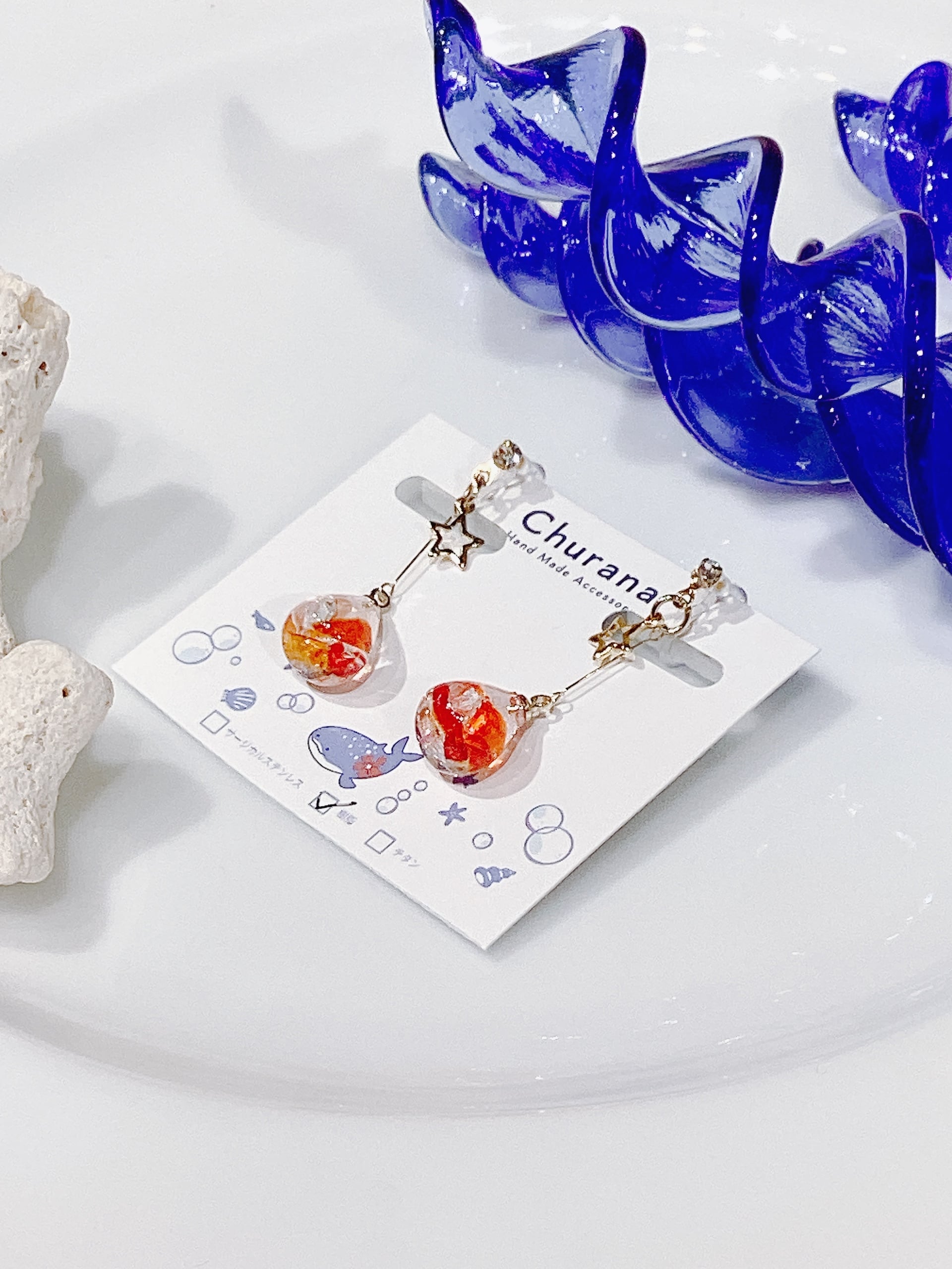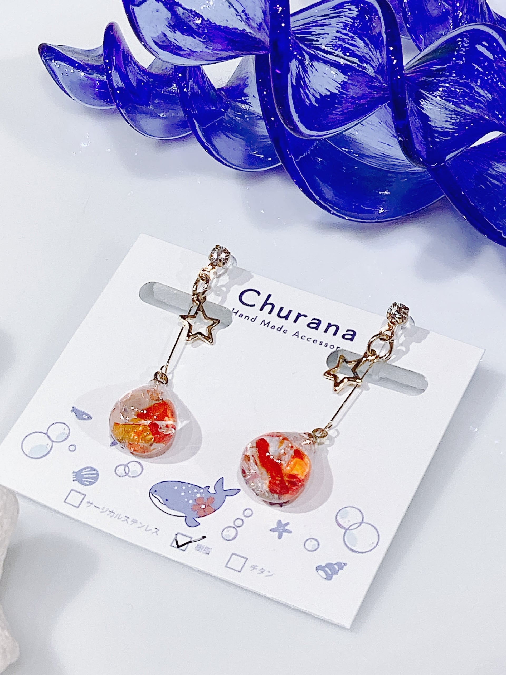 琉球ガラスのカケラを使用した繊細なデザイン。色とりどりの琉球ガラスは、まるで南国の海から生まれた宝石のように、さりげなく耳元を華やかにします。手作りの温もりが詰まったデザインは、光を受けてきらりと輝き、あなたの日常に特別な瞬間をもたらします!