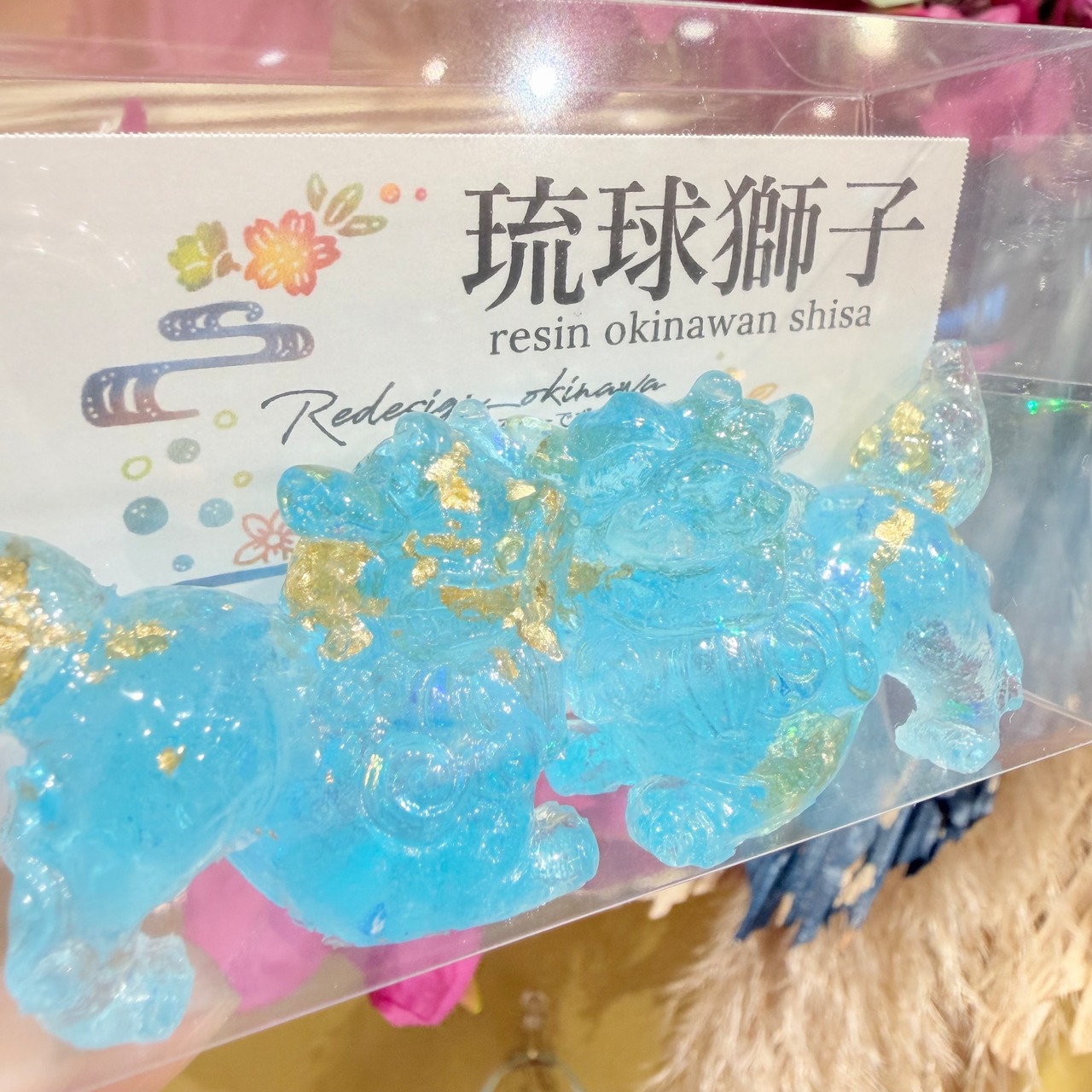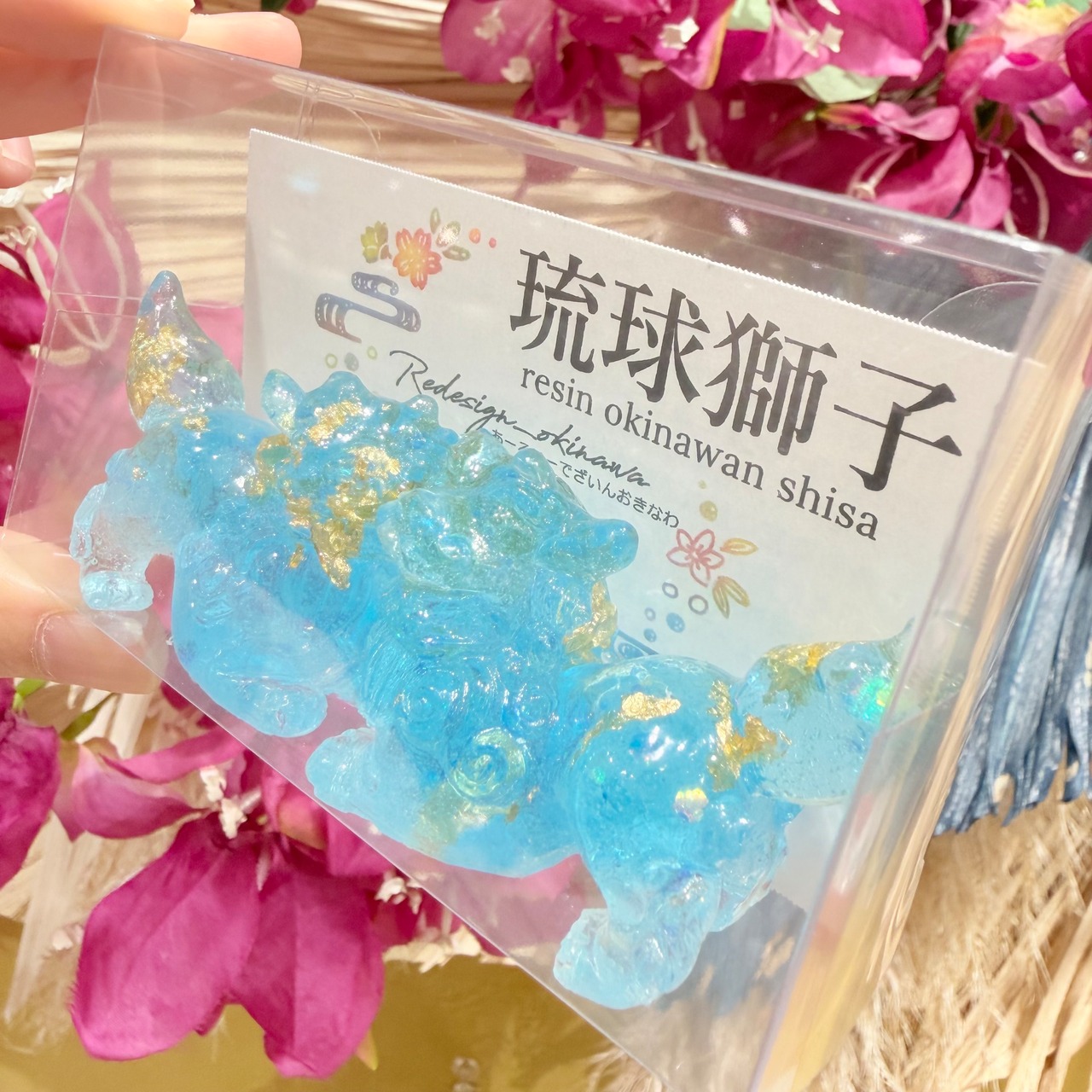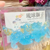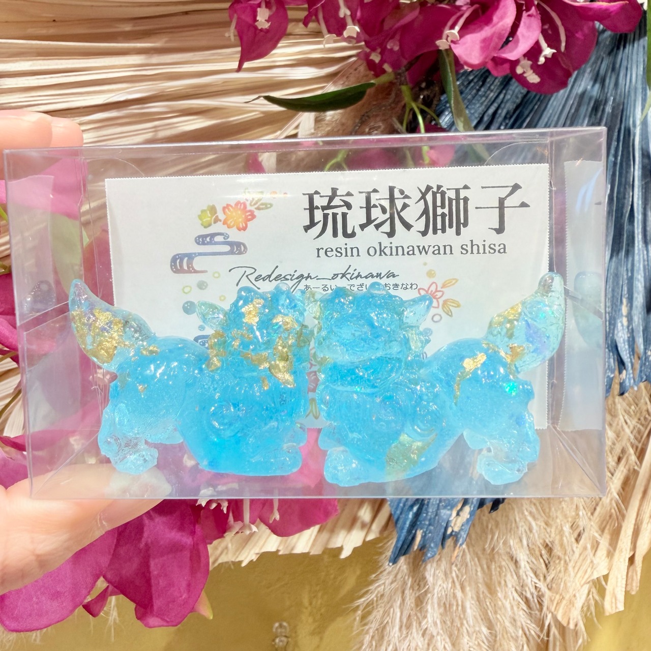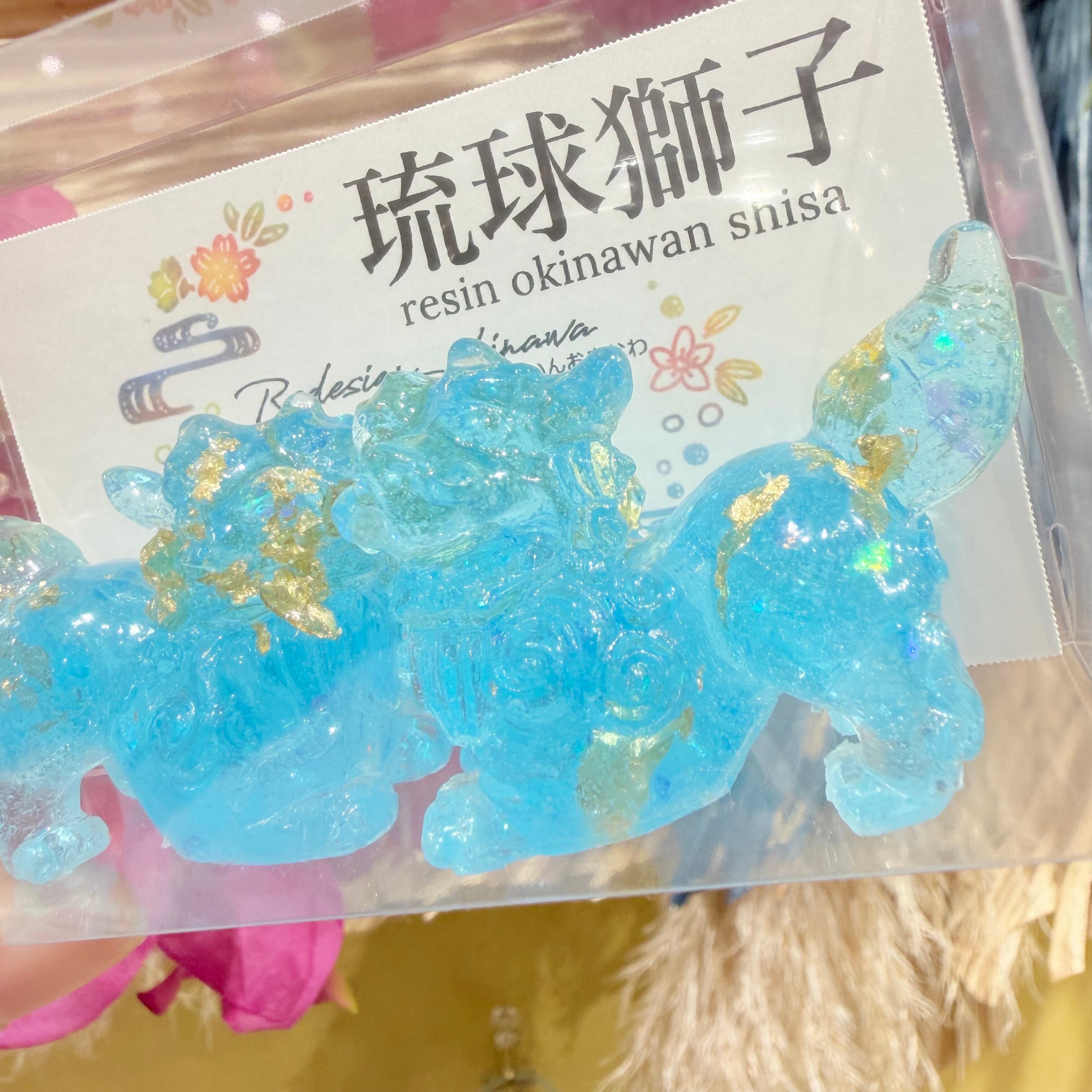 レジンシーサー は、あなたの空間に華やかさを加える特別なアイテムです!若干透明感もあり水色ラメが、シーサー本来の可愛らしさを一層引き立てています。この美しいデザインは、リビングや玄関など、さまざまな場所に溶け込み、見る人に癒しを提供することでしょう。