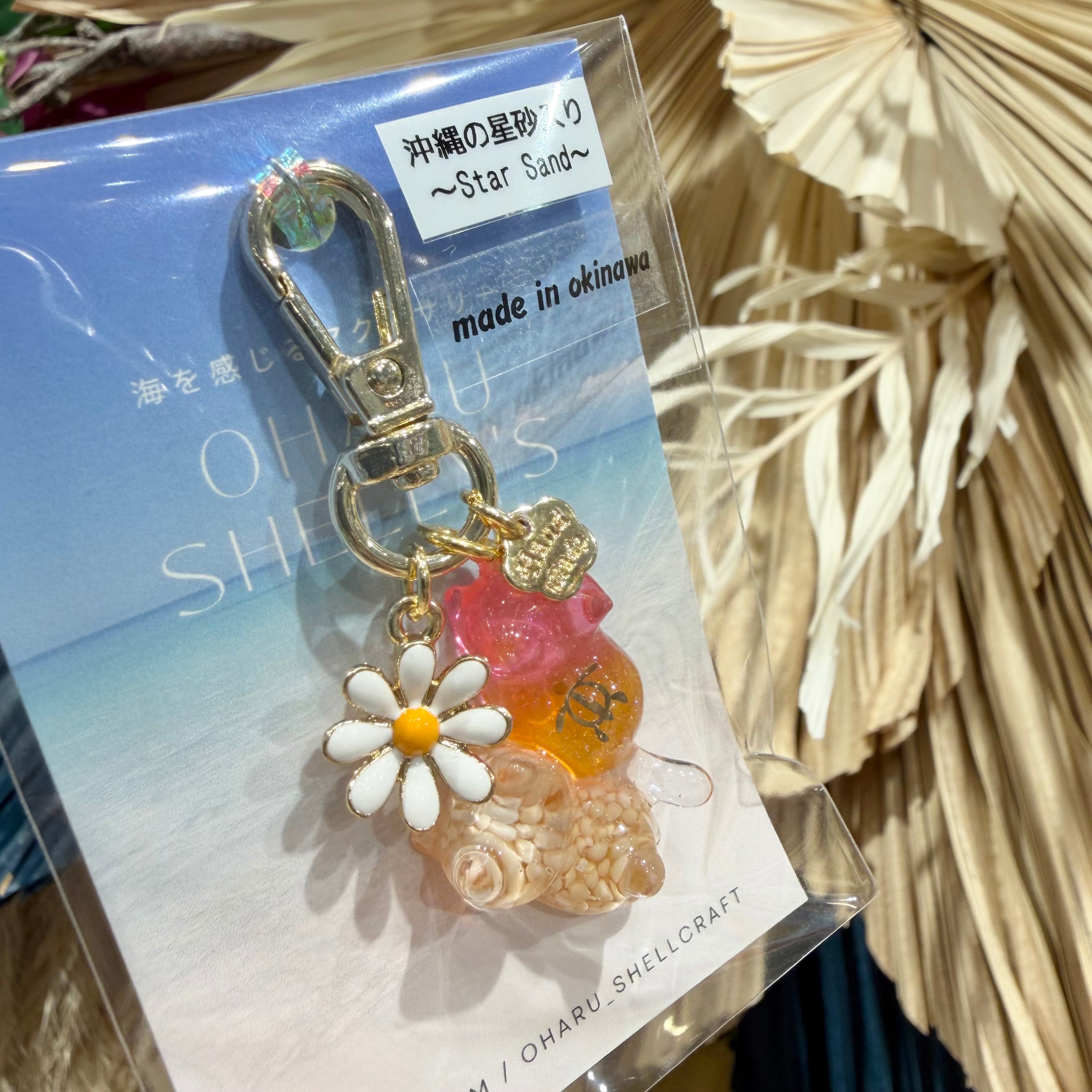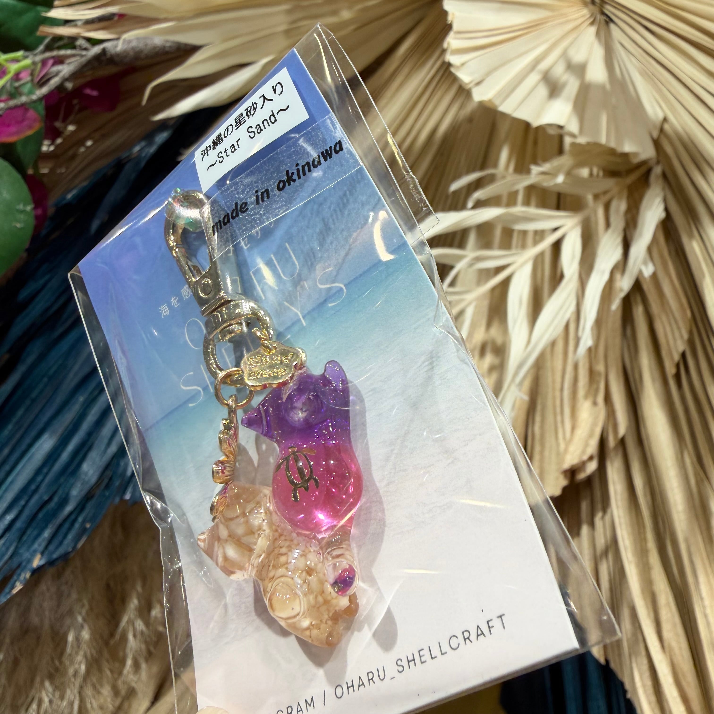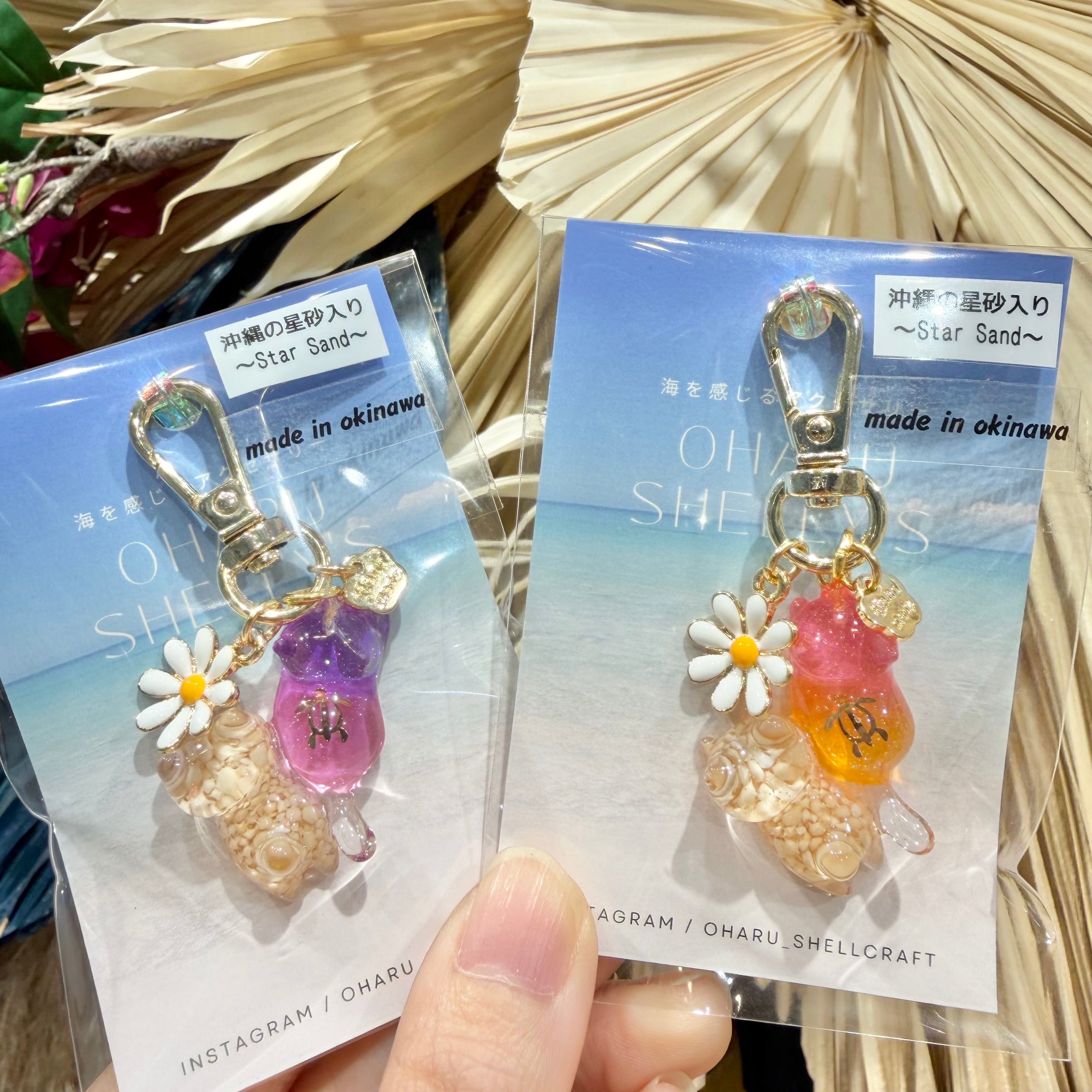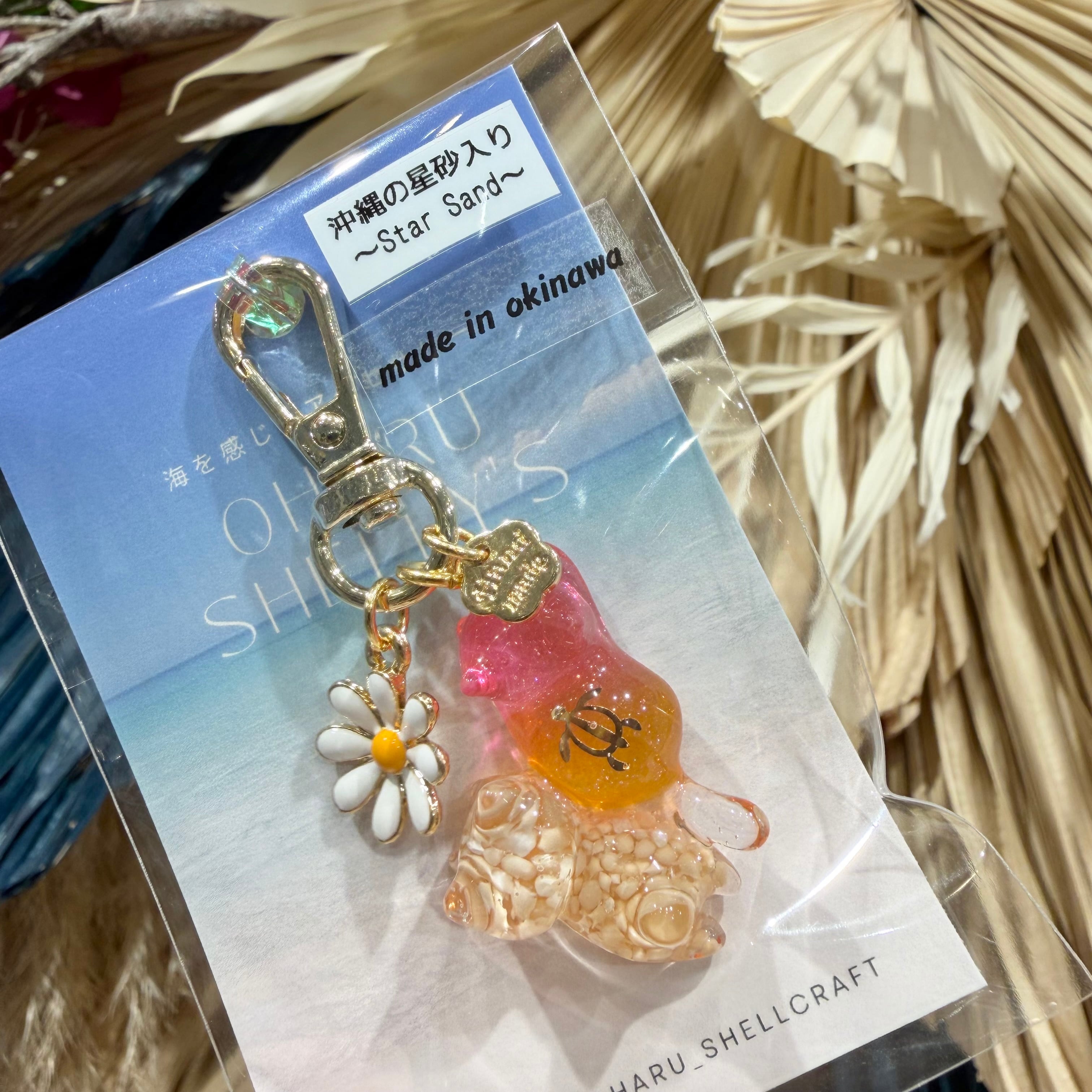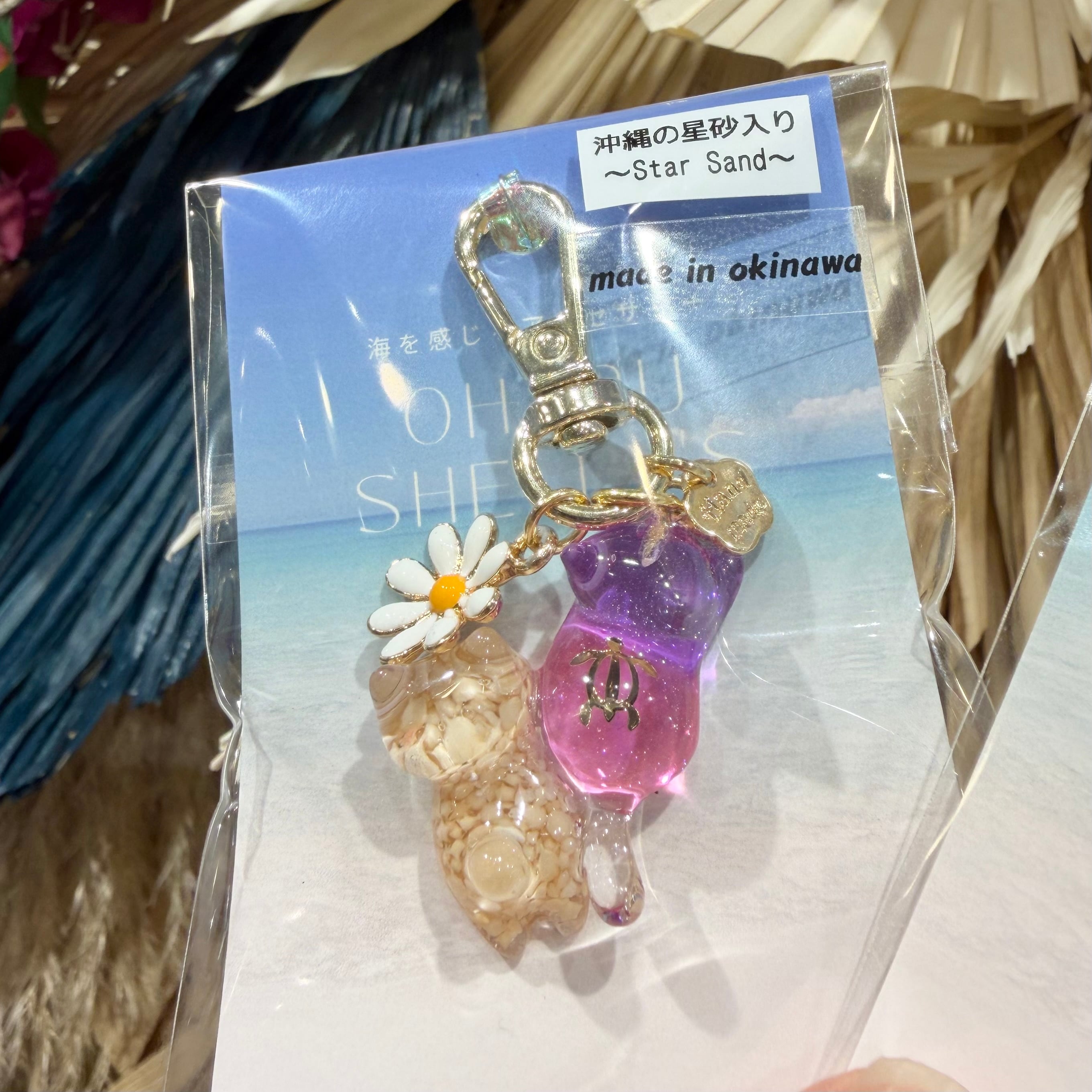 ねこの可愛らしいフォルムと沖縄の星砂入りのチャームが特徴のキーホルダーです☺︎