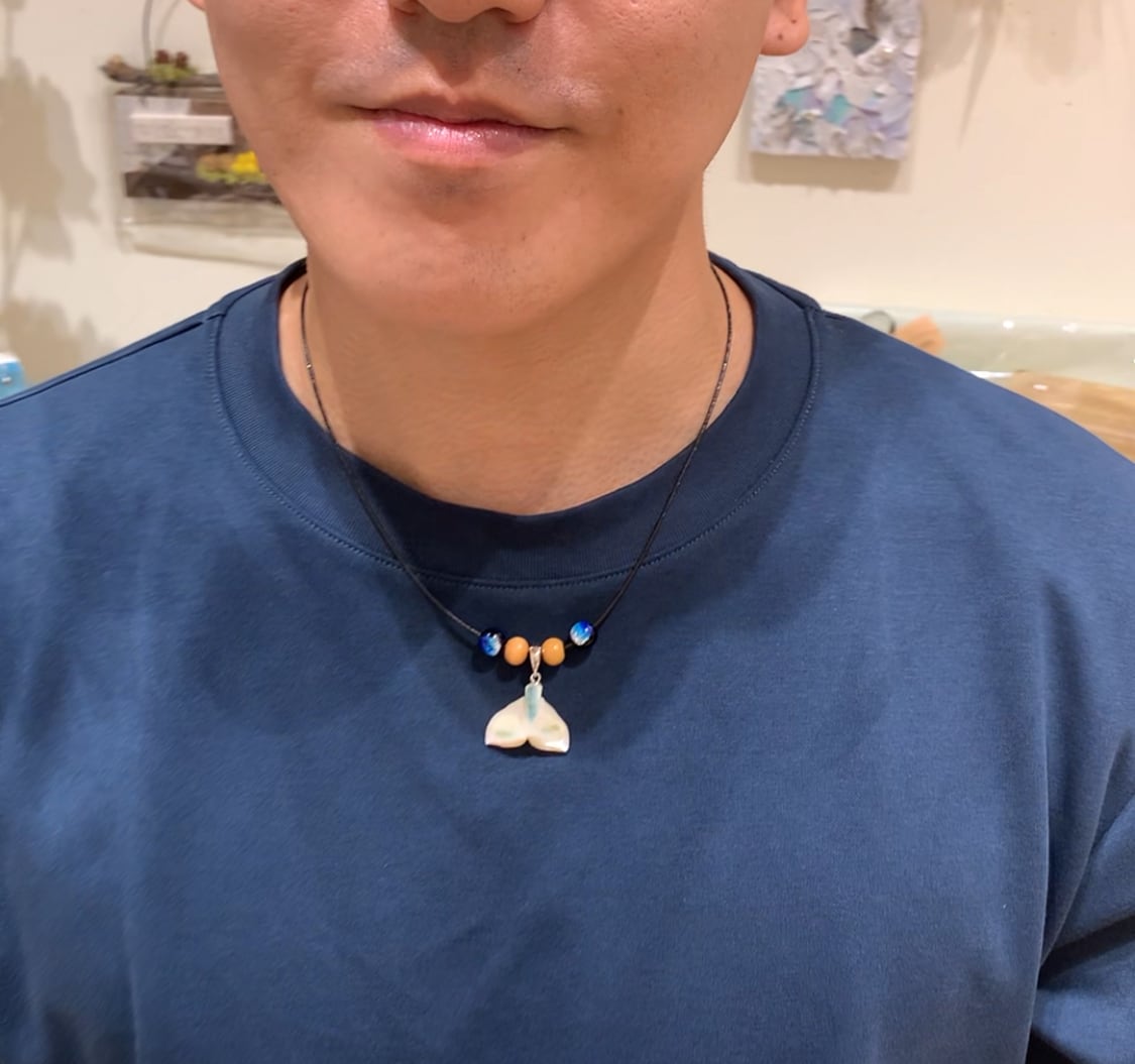 沖縄の自然の美しさを閉じ込めた、夜光貝とホタルガラスを使用した魅力的なネックレス。このネックレスは、どんなコーディネートにも合うシンプルなデザインでありながら、夜光貝の独特の輝きとホタルガラスの幻想的な色合いが際立ち、見る人の目を引きます。
