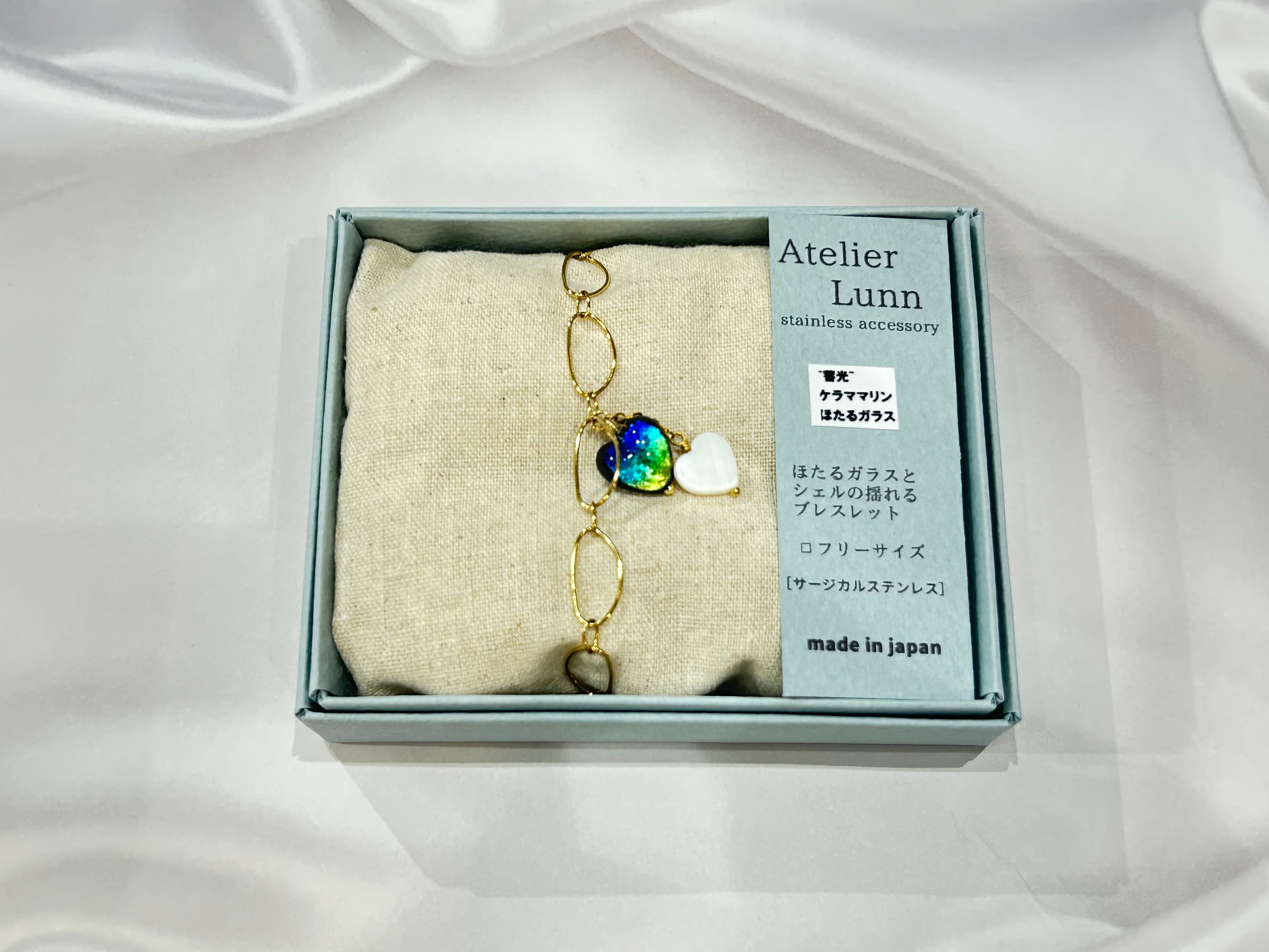 沖縄の美しい自然をそのまま感じられる、シェルブレスレット ケラママリンハートが登場しました!蓄光とホタルガラスの輝きが調和し、夜空の星のような神秘的な魅力を演出します。