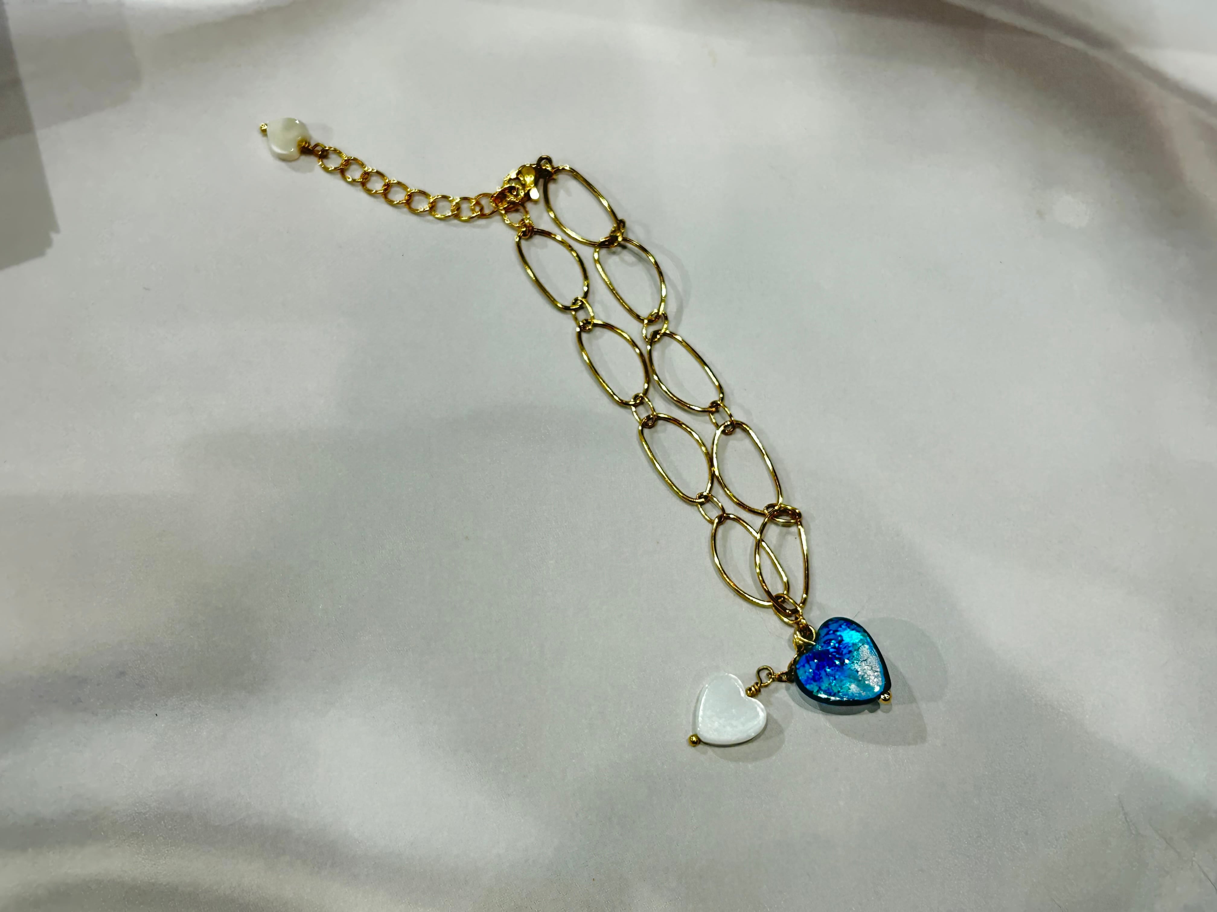 沖縄の神秘的な海を感じさせる、シェルブレスレット ハテルマブルー ハートが登場しました!蓄光とホタルガラスの美しい輝きが、まるで海の底から浮かび上がるような幻想的なデザインを生み出しています。