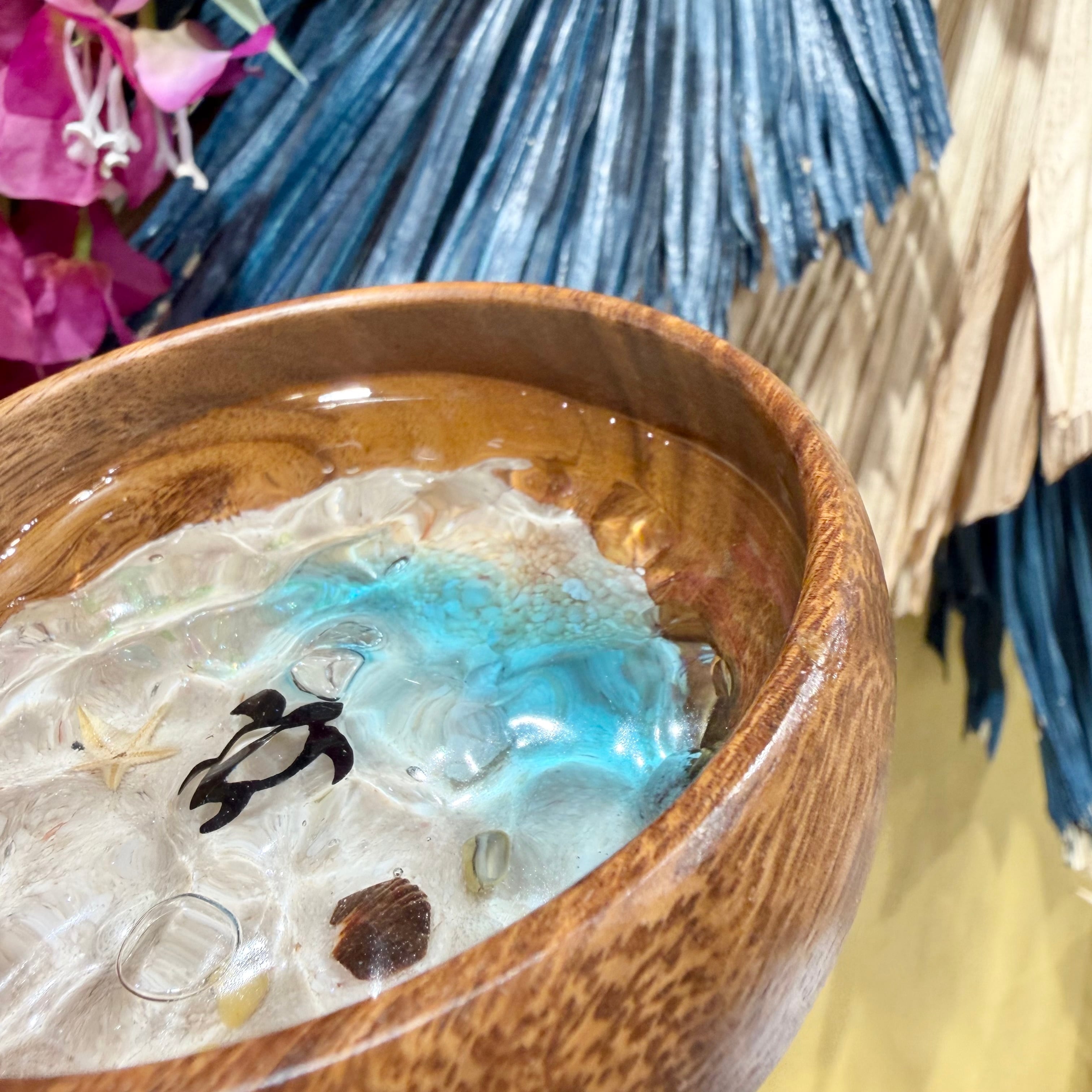 繊細な波紋模様が魅力的なウッドトレイ。直径約10㎝ほどの手のひらサイズで、器は木製で出来ており空間に馴染む温もりのある質感。