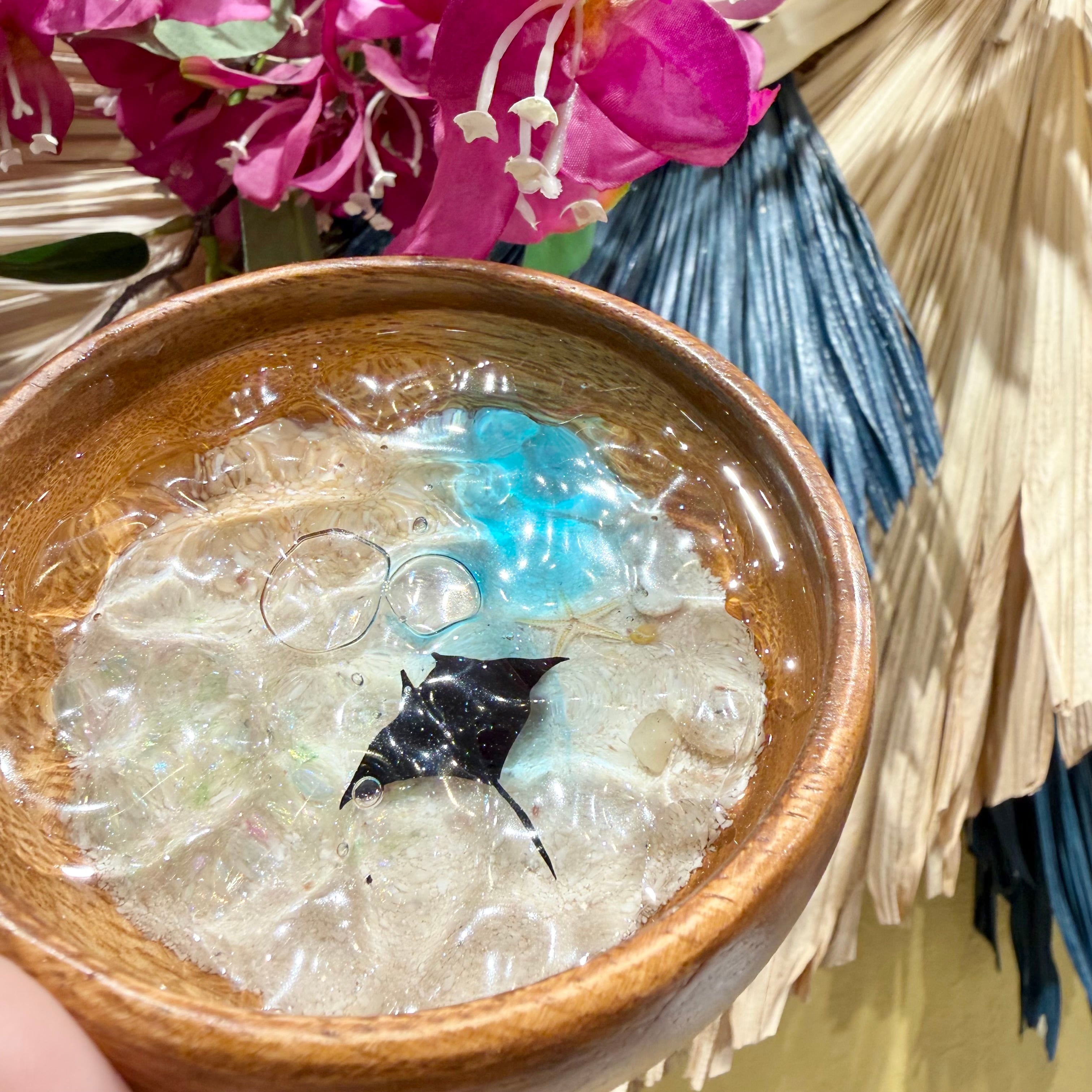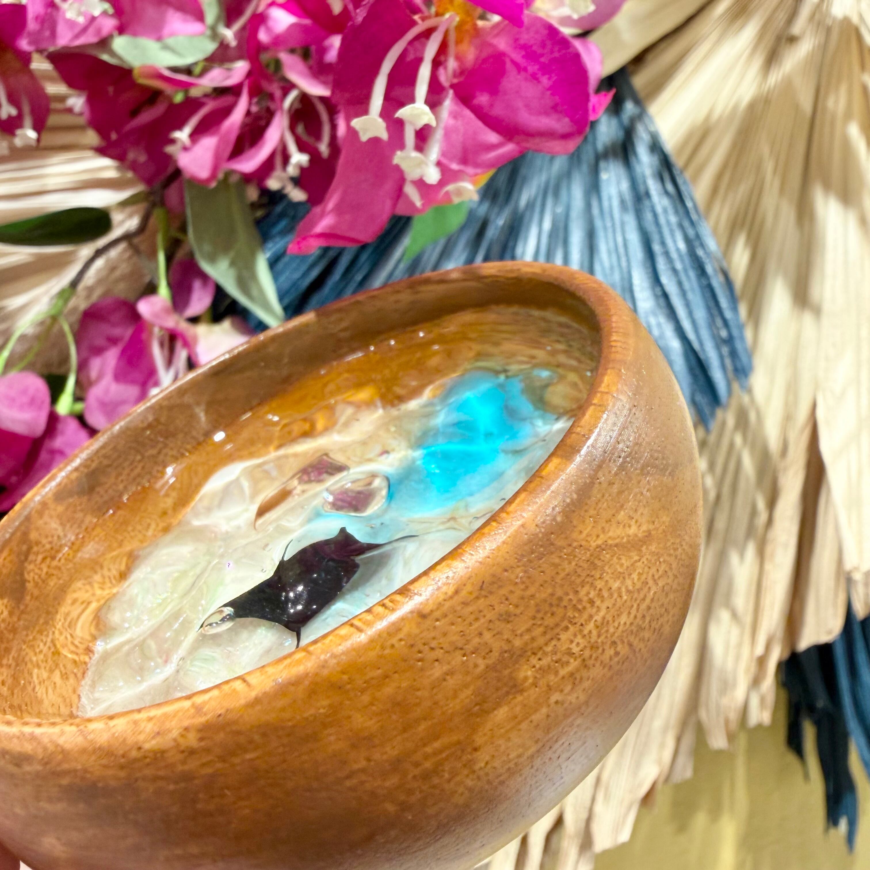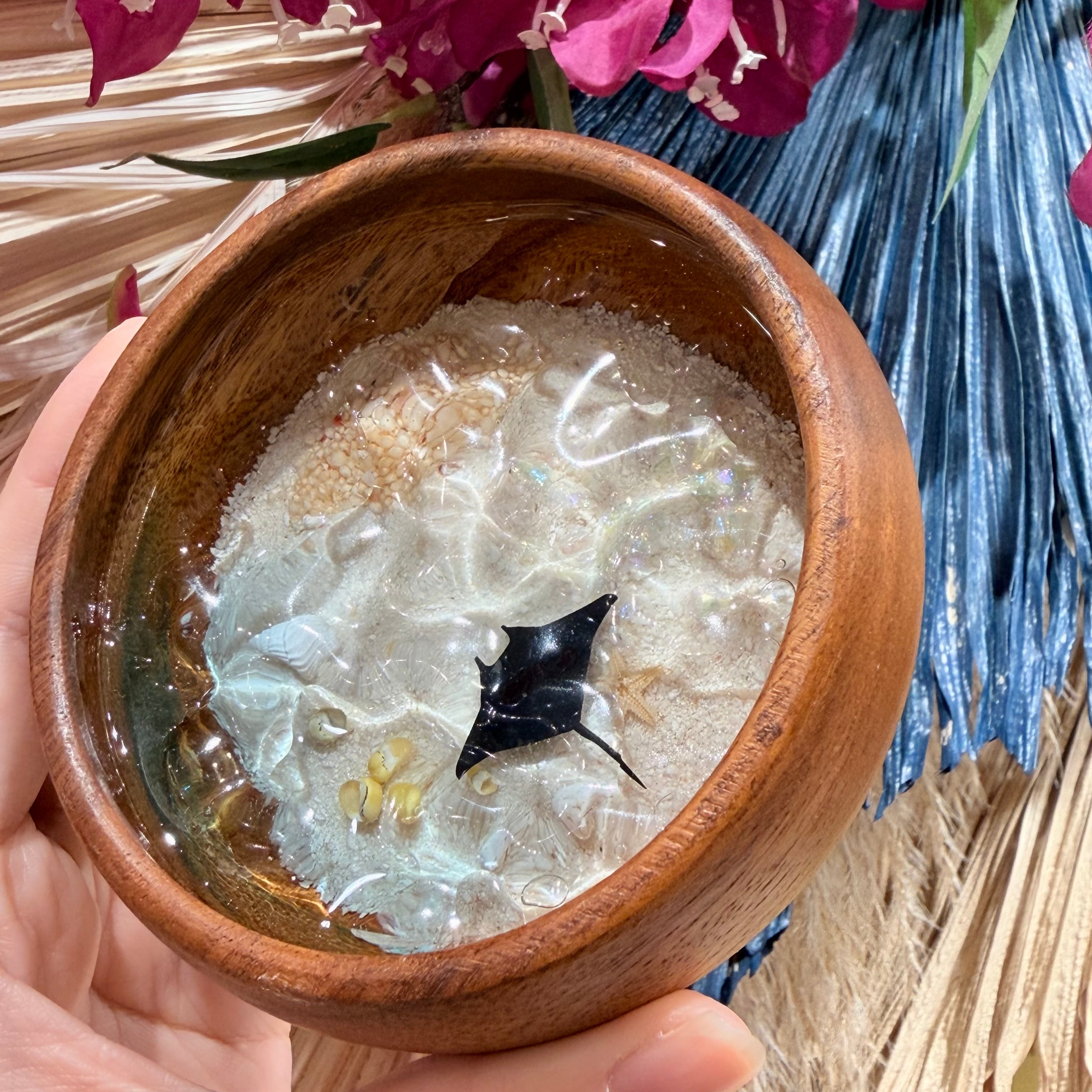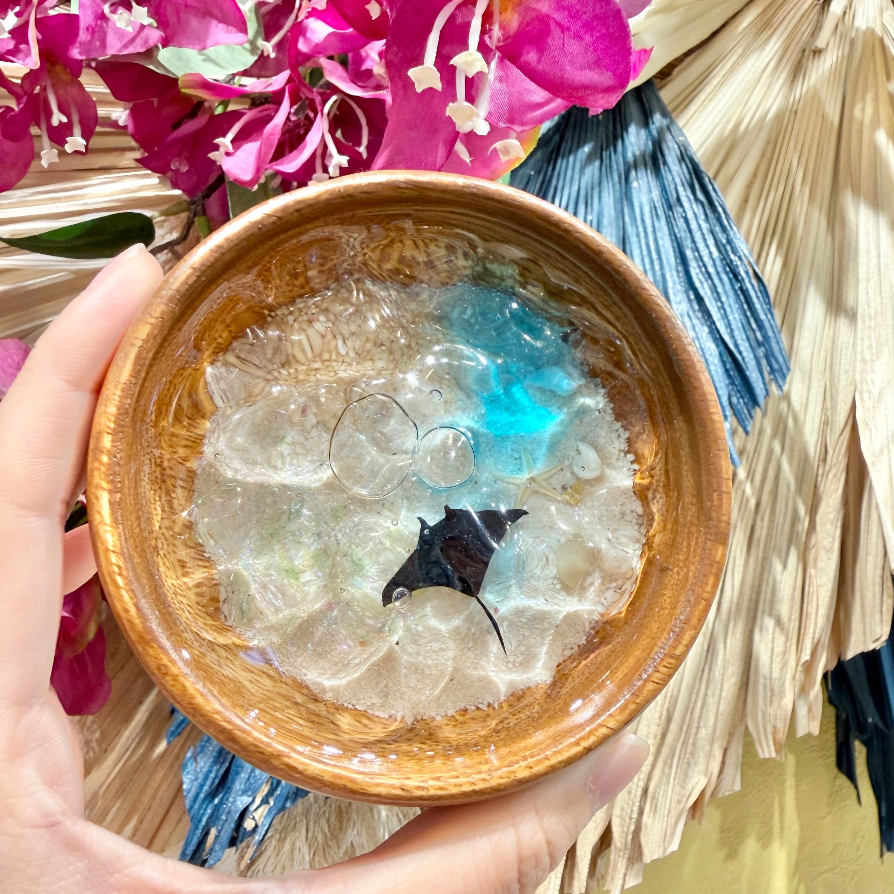繊細な波紋模様が魅力的なウッドトレイ。直径約10㎝ほどの手のひらサイズで、器は木製で出来ており空間に馴染む温もりのある質感。