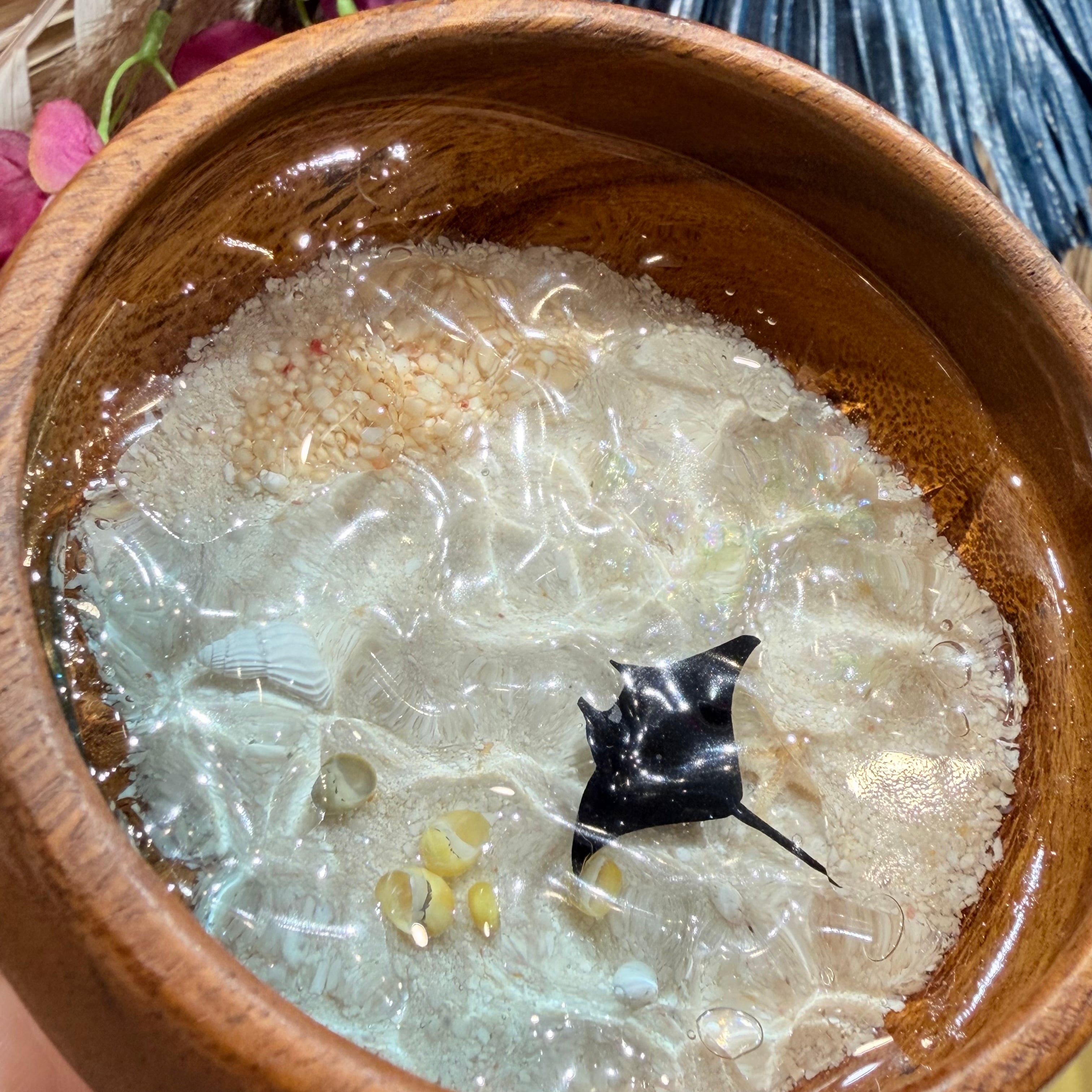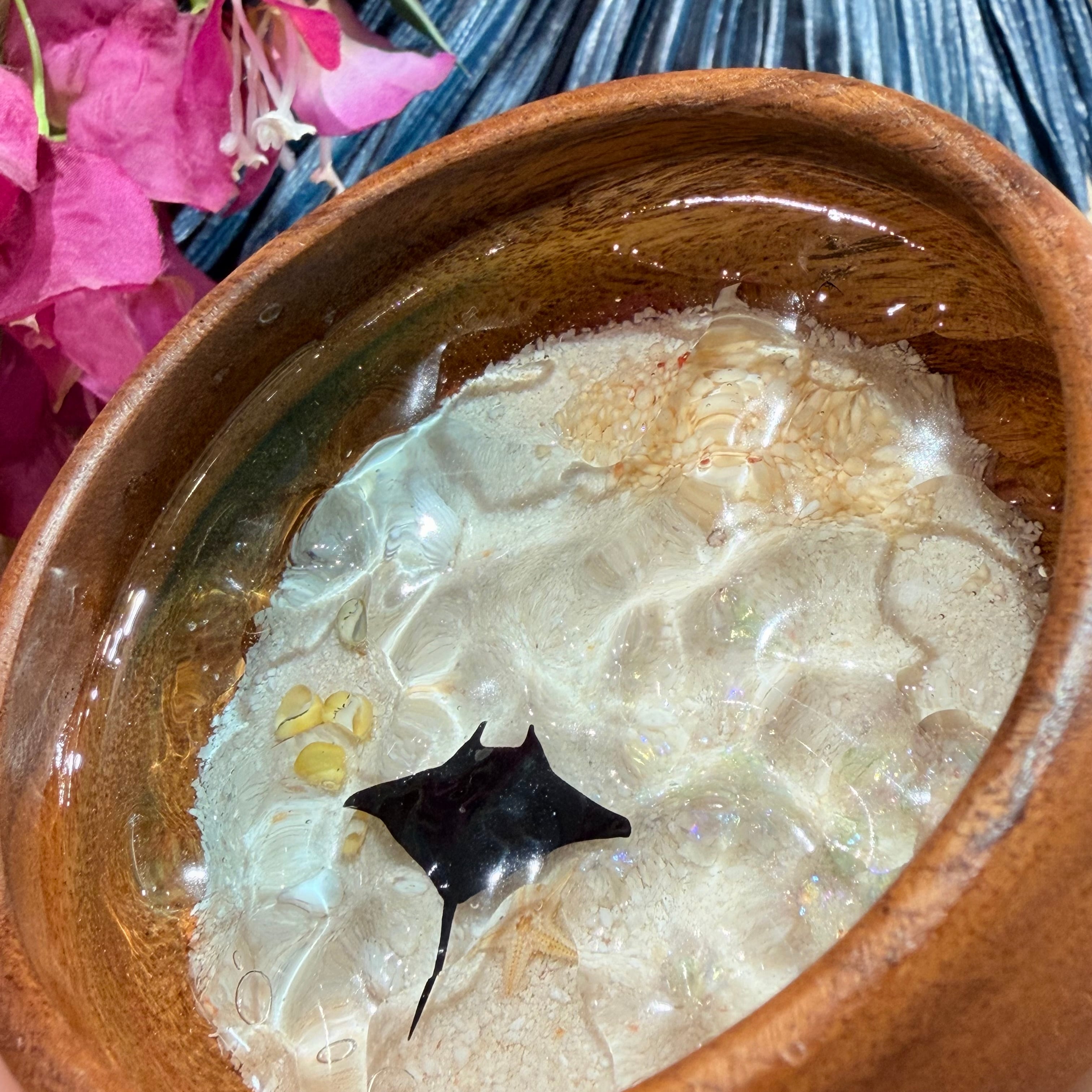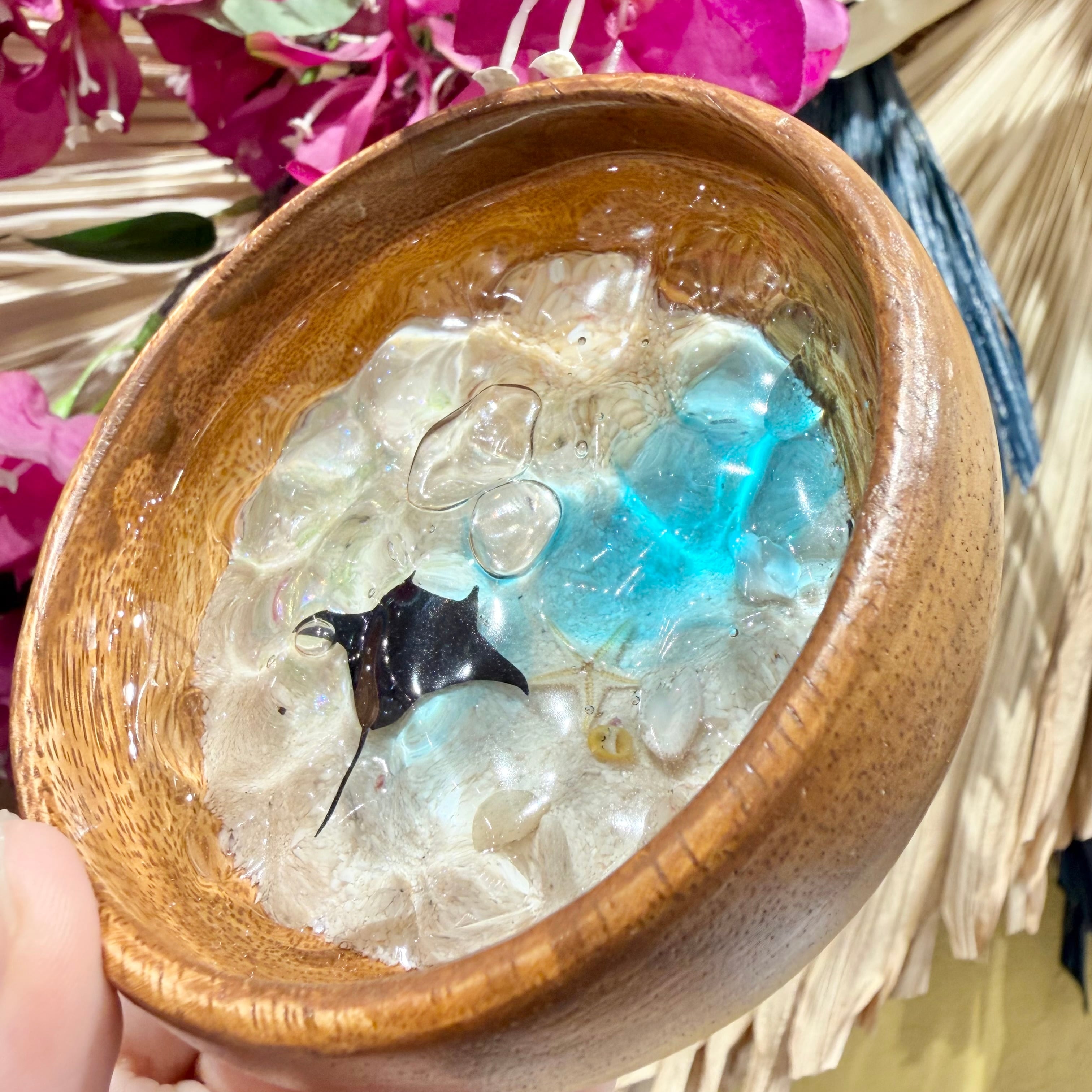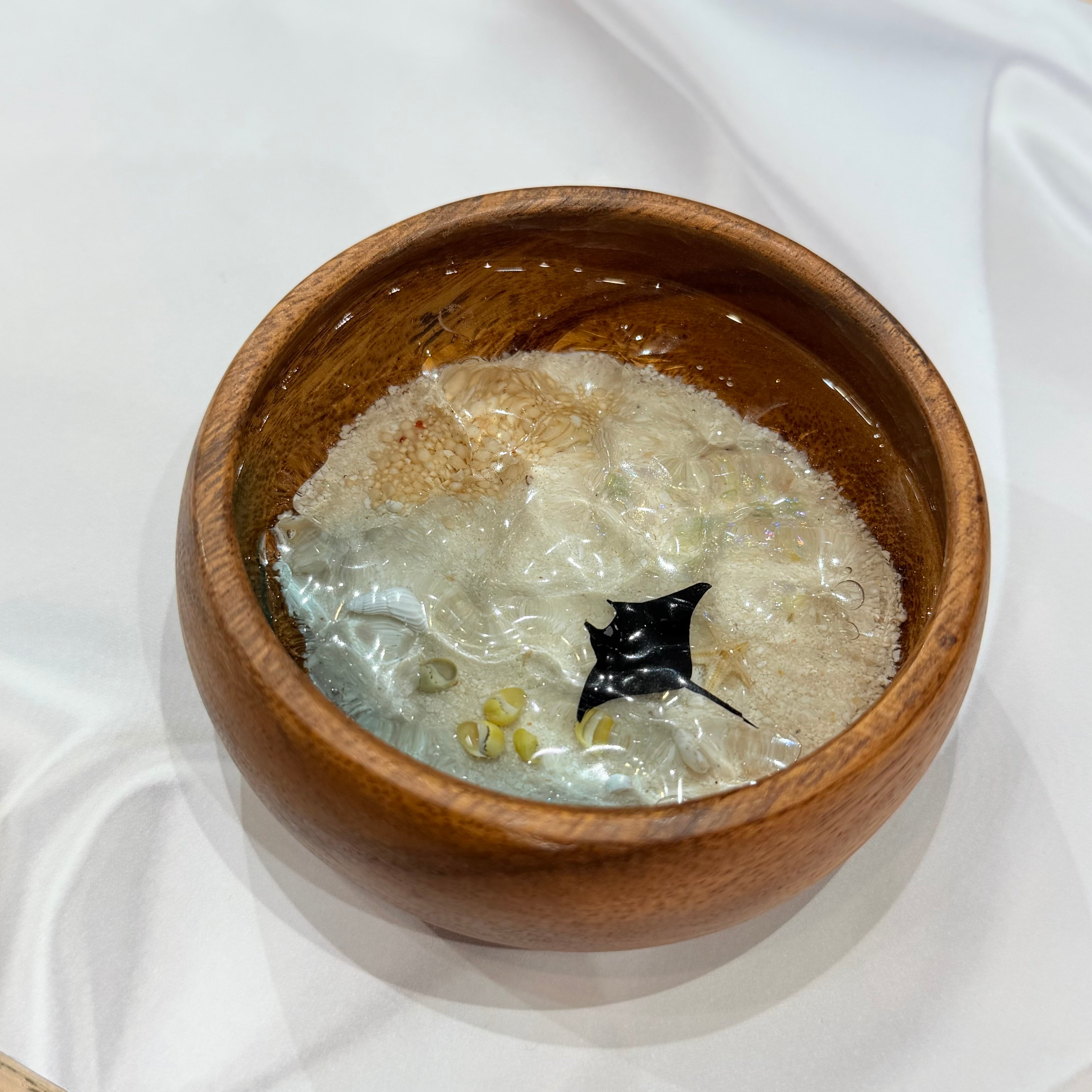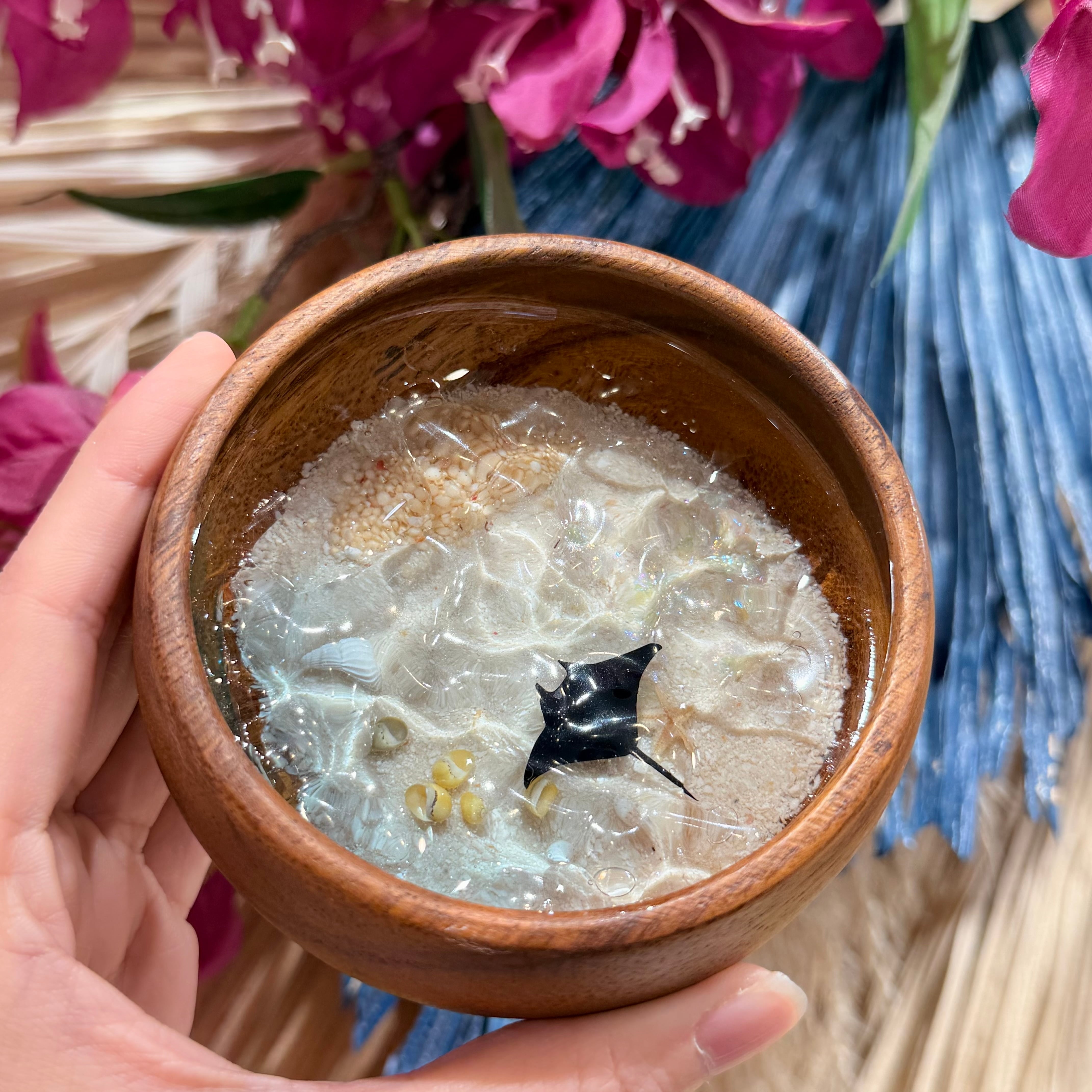 繊細な波紋模様が魅力的なウッドトレイ。直径約10㎝ほどの手のひらサイズで、器は木製で出来ており空間に馴染む温もりのある質感。