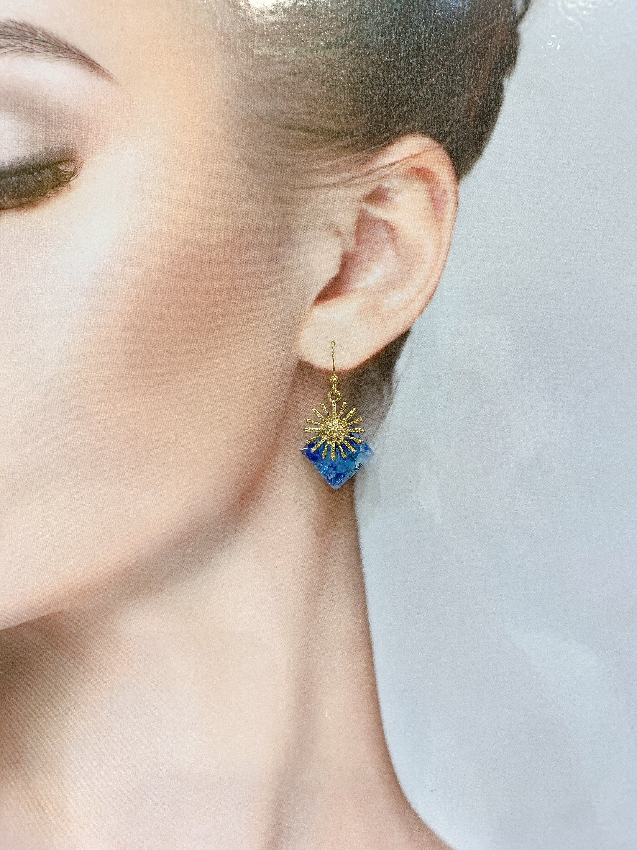 琉球ガラスを使用しており、深みのある青色が特徴です。光を受けて煌めく姿は、耳元に涼やかさを加え、どんな装いにもアクセントとなります。カジュアルな日常使いはもちろん、大切な人への贈り物にも最適です。