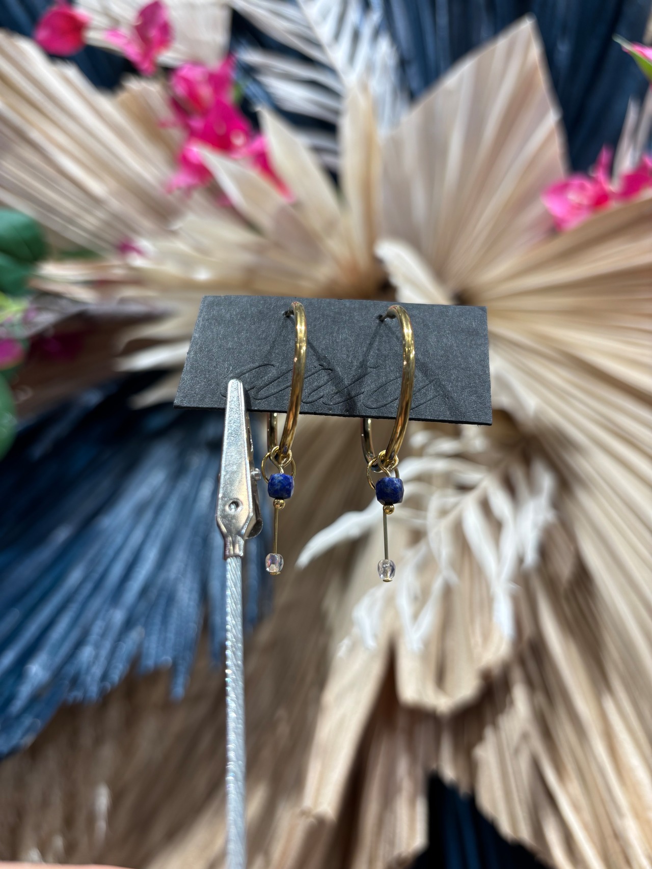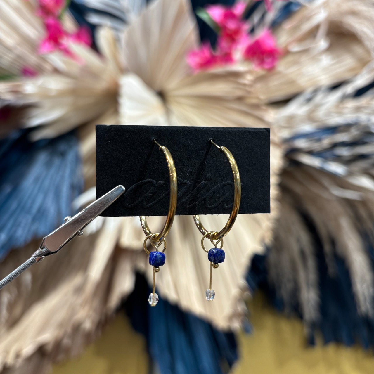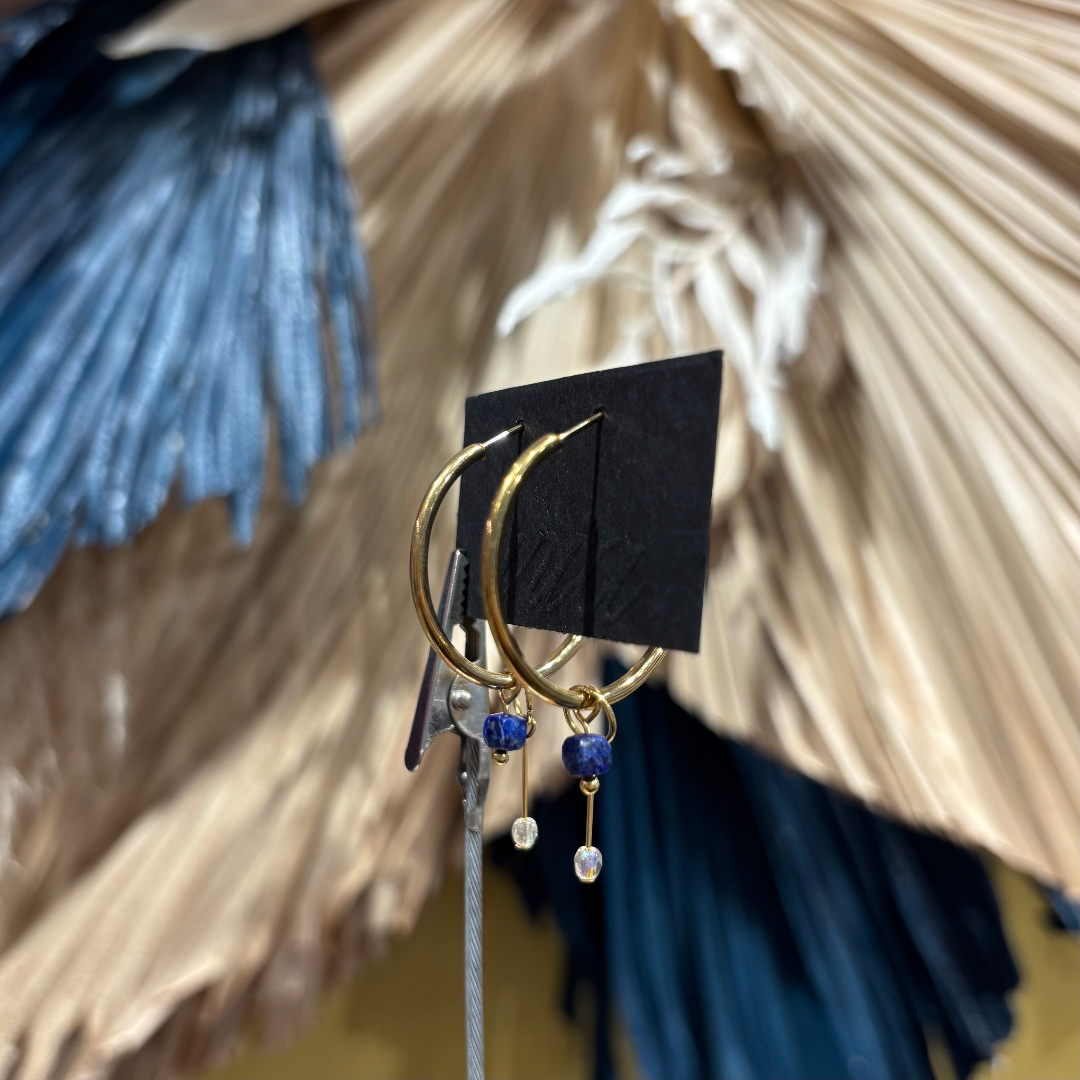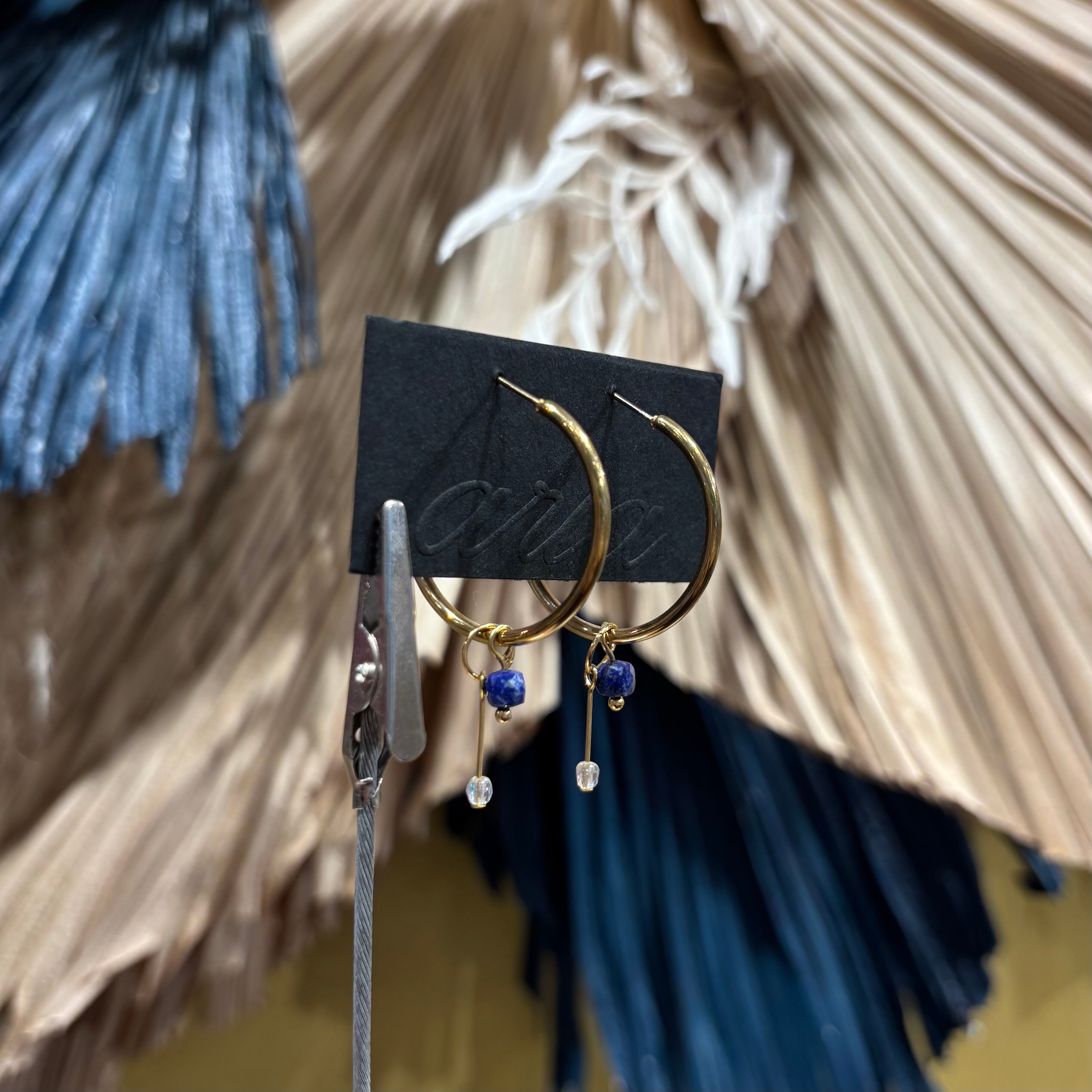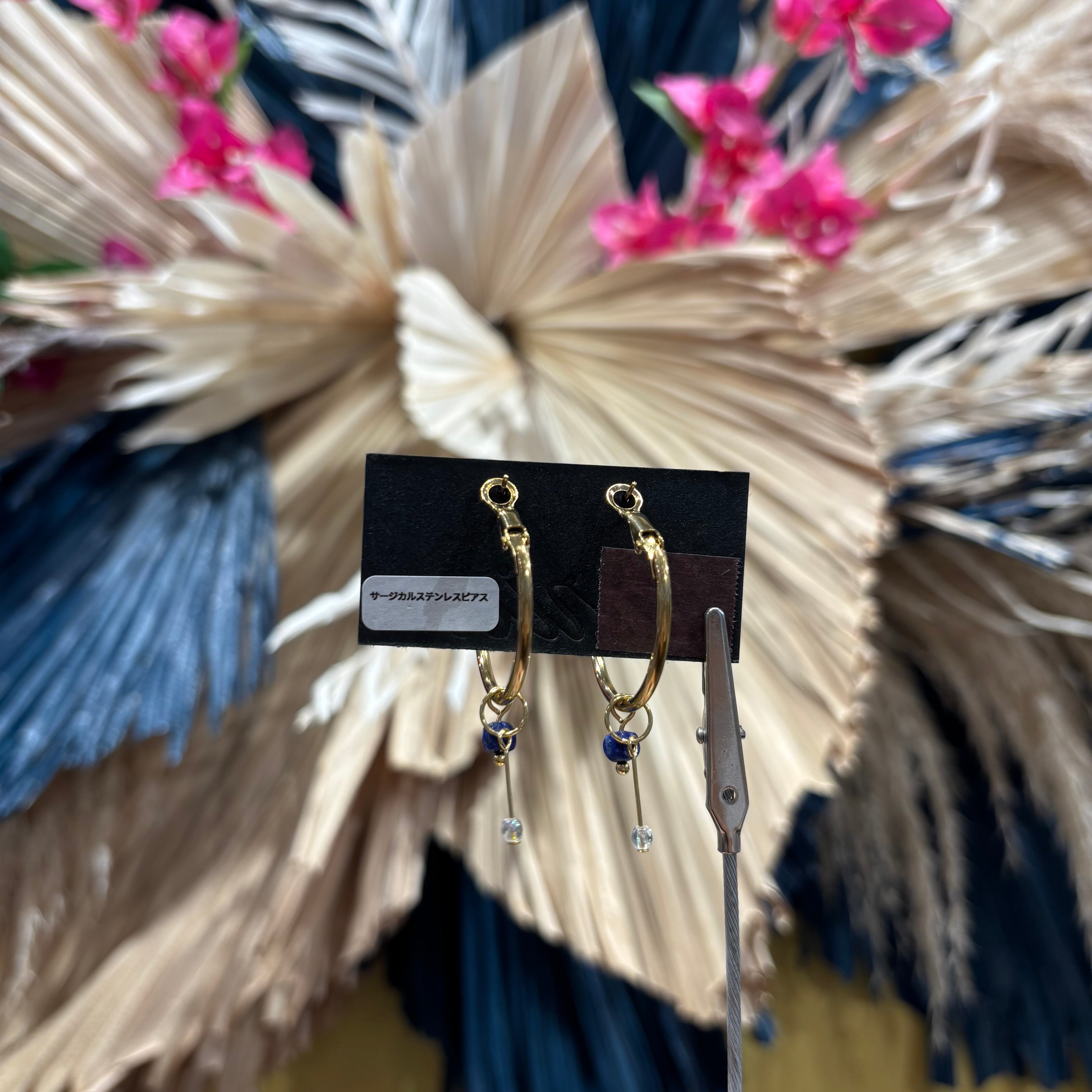 シンプルなフープに、ラピスラズリをあしらったピアス。