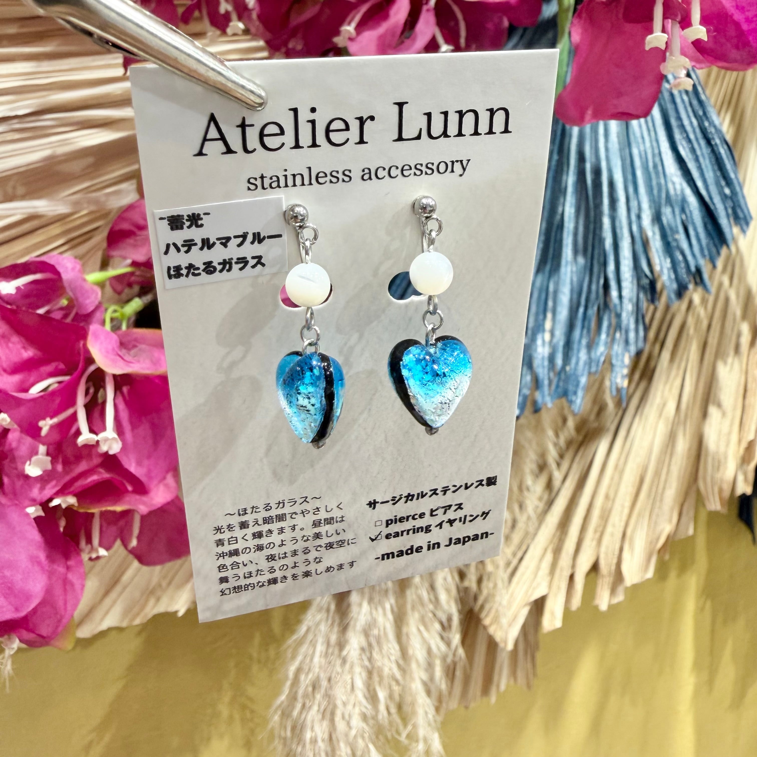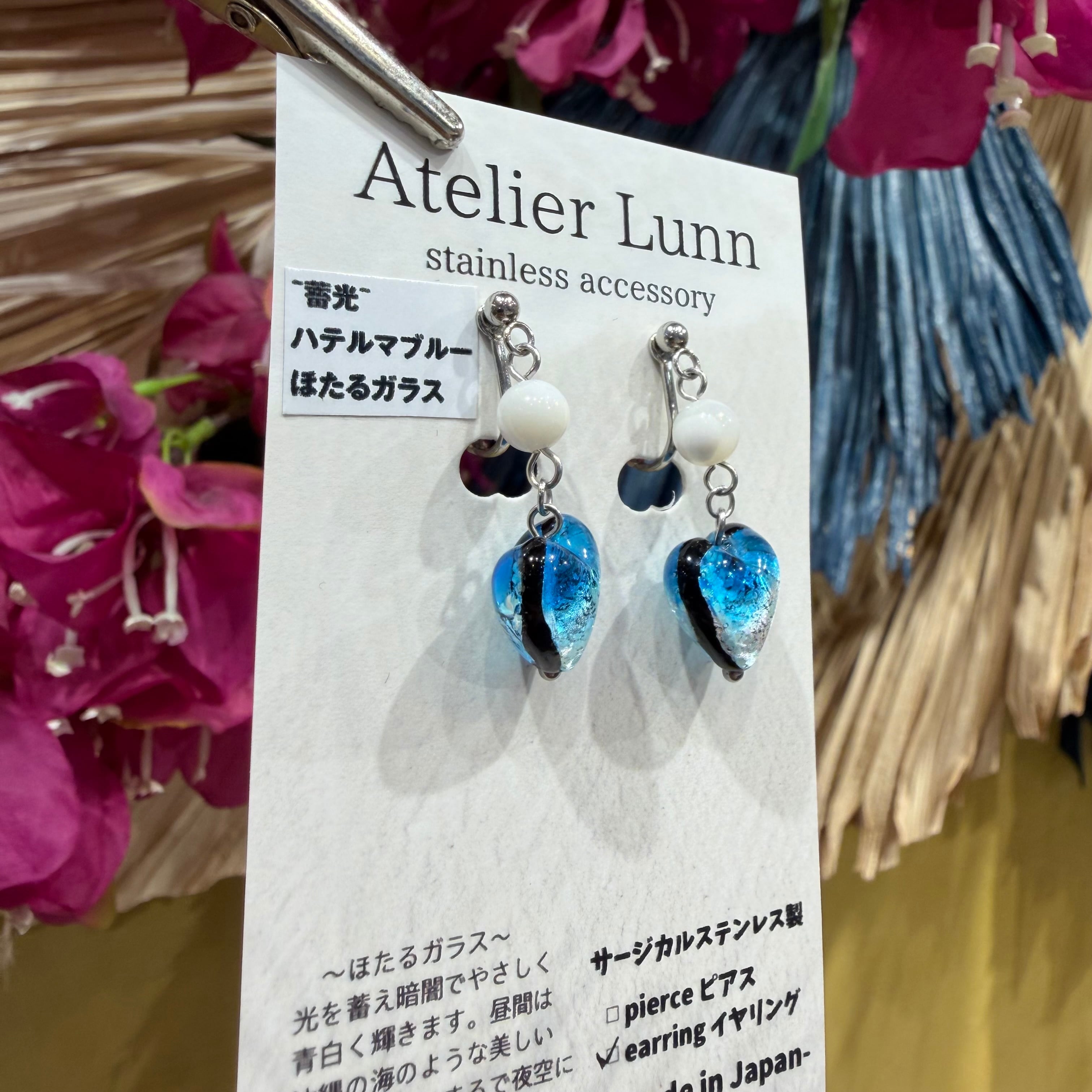 このピアスは、シェルとホタルガラスが3連になっており、揺れるとその柔らかな曲線と色合いが耳元で華やかさを添えます。