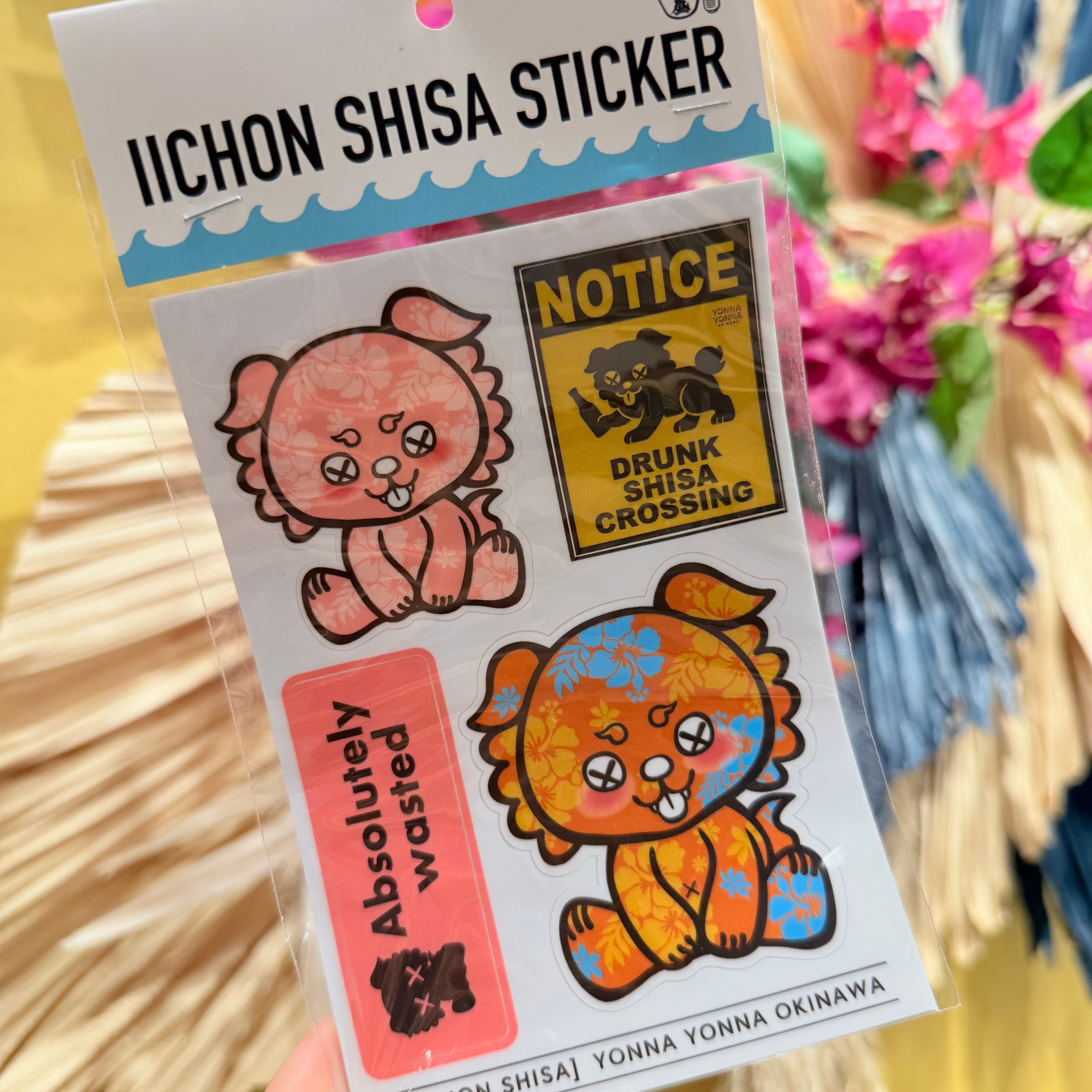 いーちょんシーサー(ほろ酔いシーサー)が描かれた可愛いステッカー。