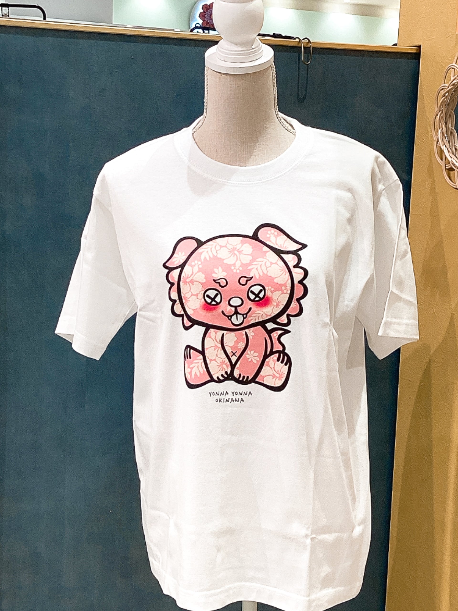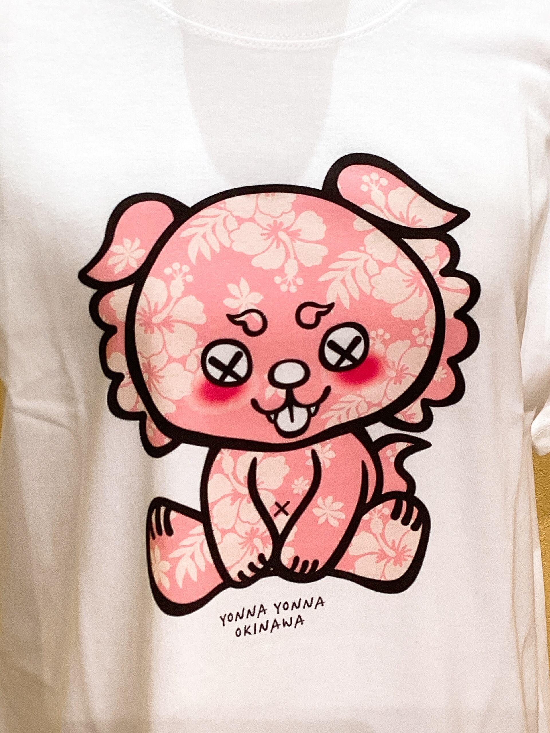 いーちょんシーサー(ハイビピンク/ホワイト)が描かれた可愛いコットンTシャツ。