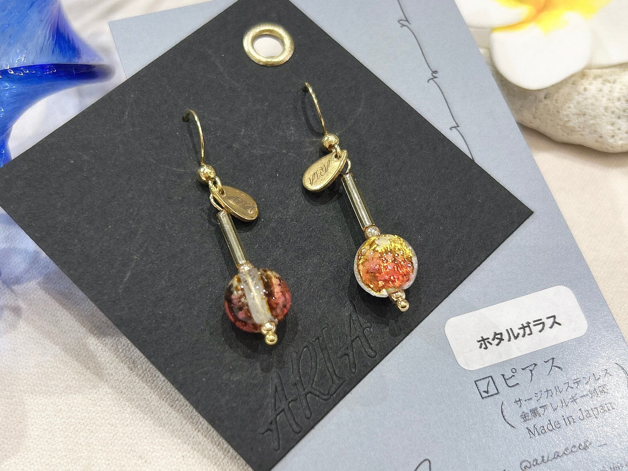 夕日の美しいグラデーションを映し出す、ホタルガラスのピアスが登場しました!この幻想的なアイテムは、サージカルステンレスを用いた金具を使用しているため、デイリーユースにもぴったり。肌に優しく、安心してご使用いただけます。