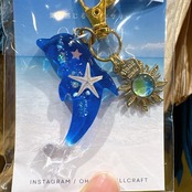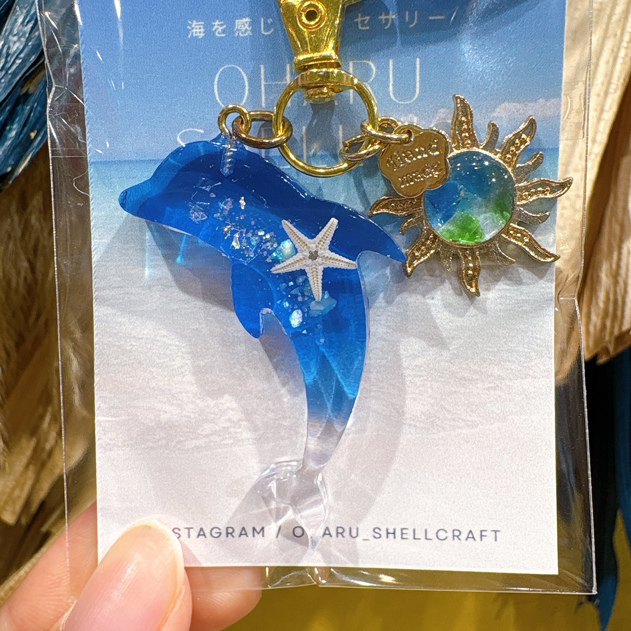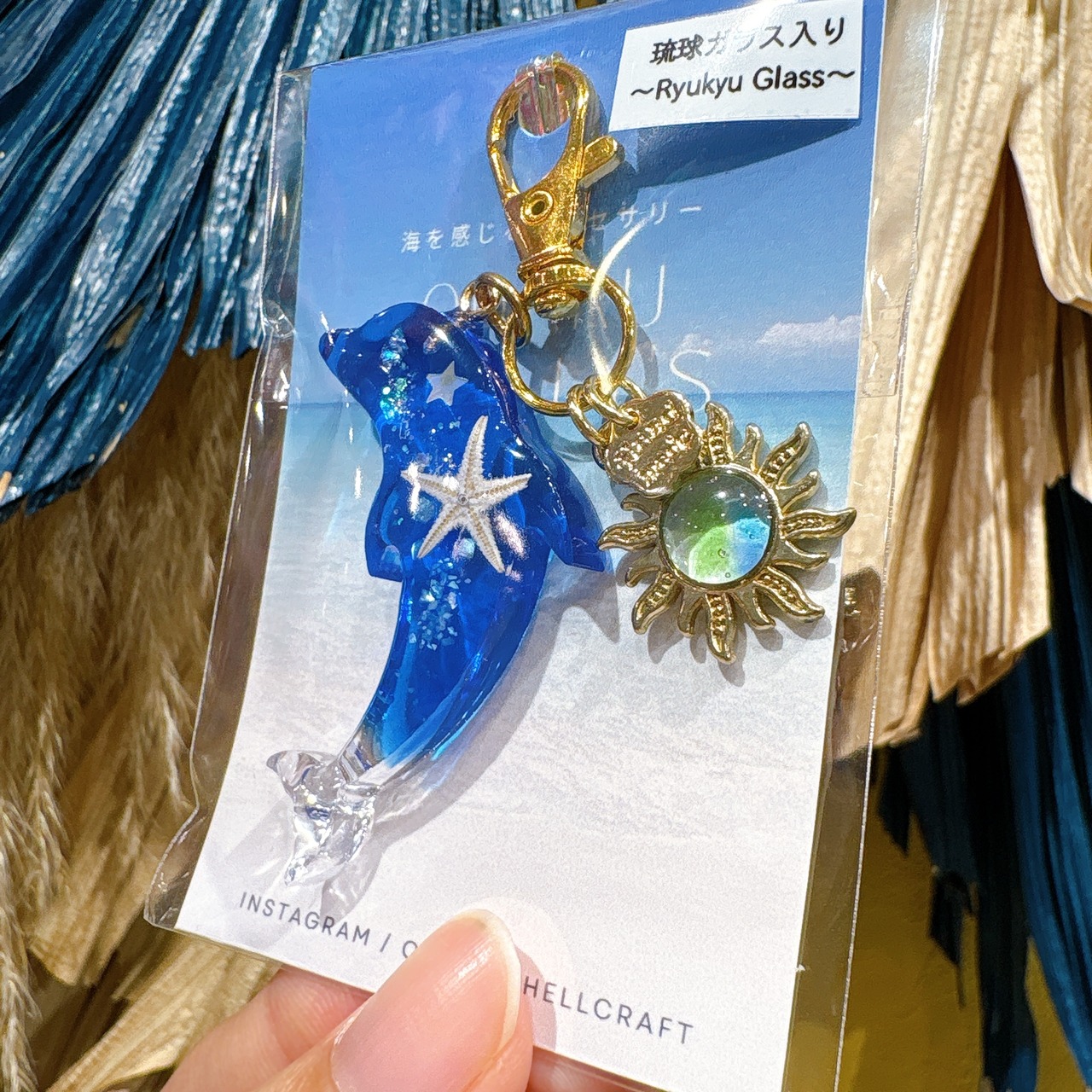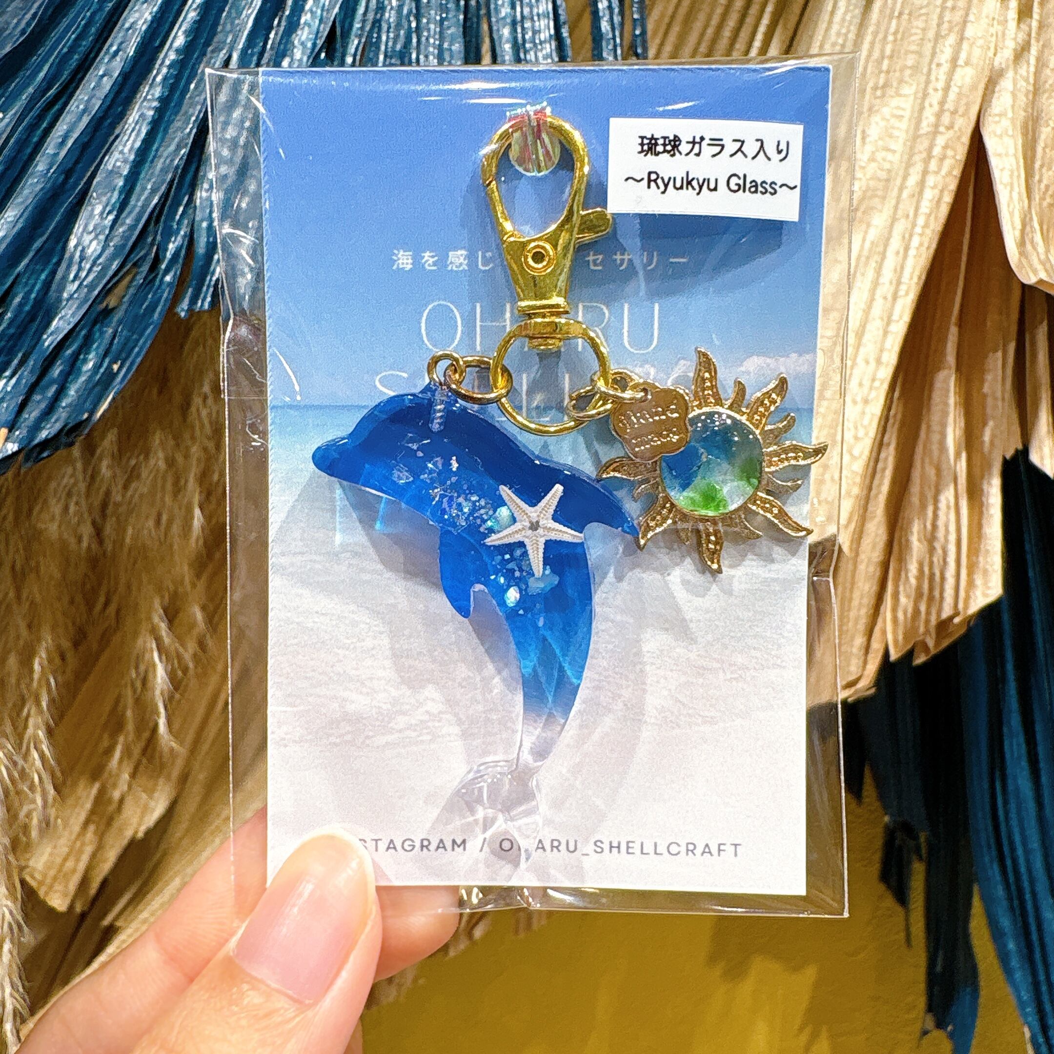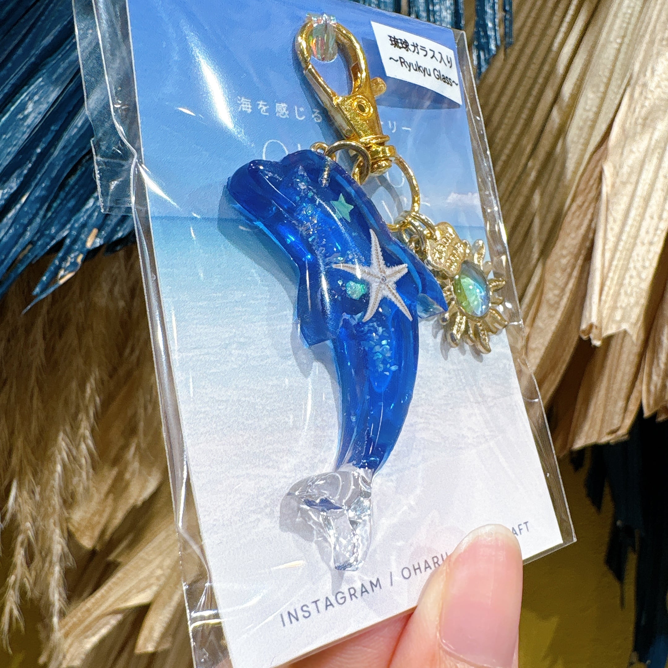 琉球ガラスのチャームがアクセント、沖縄の美しい海をイルカのモチーフにした可愛いキーホルダー。