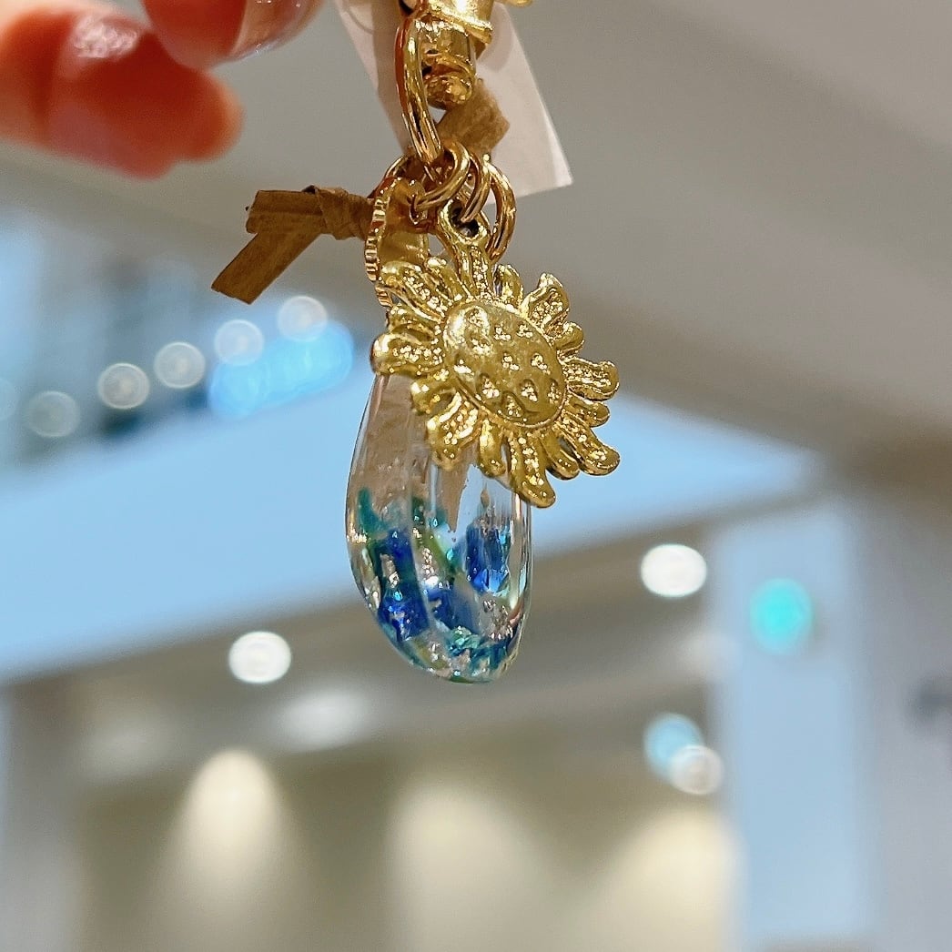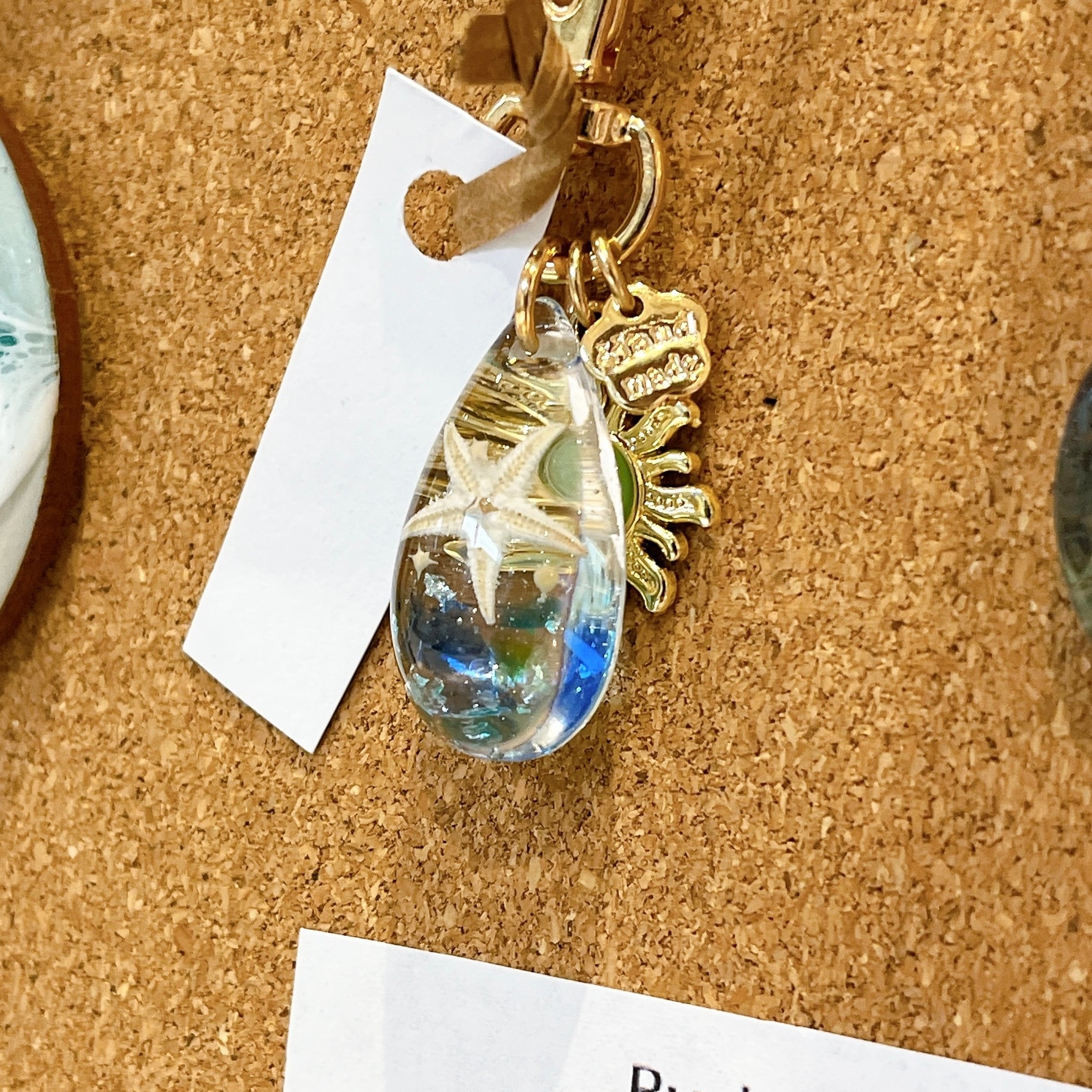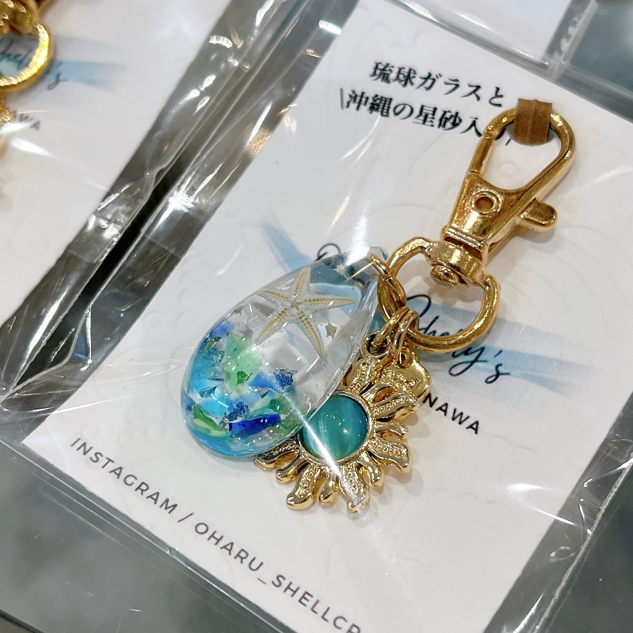 琉球ガラスの輝きが魅力のハンドメイドキーホルダーは、オリジナリティ溢れるしずくのデザインがおしゃれなアクセントとなります。