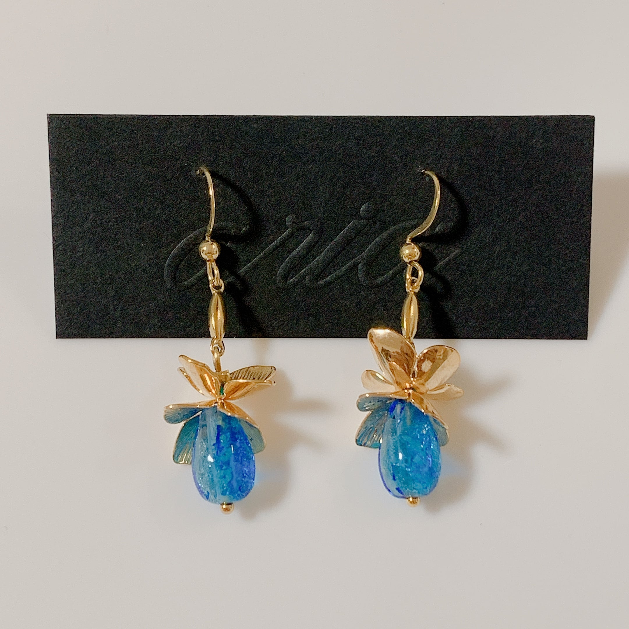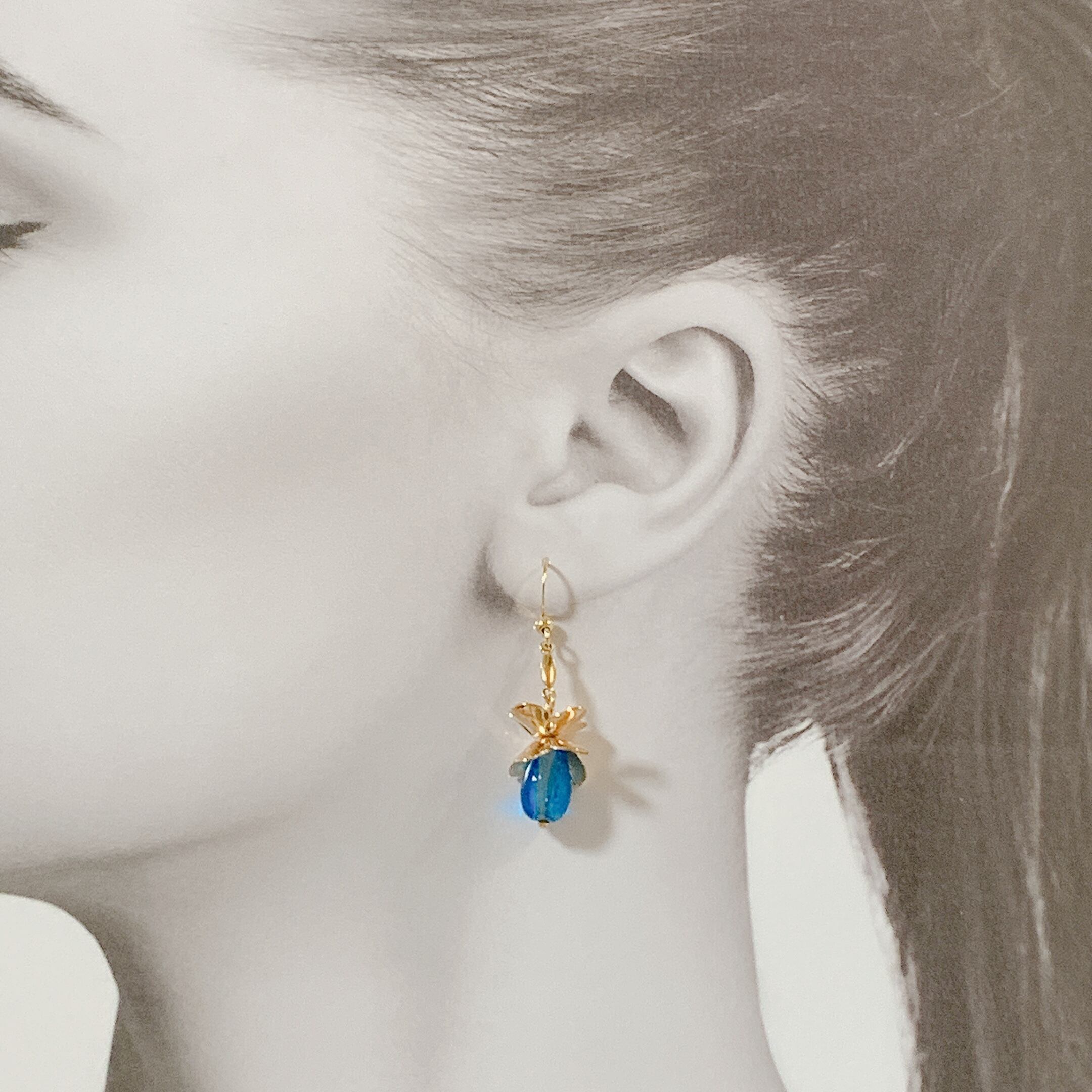 沖縄の美しい自然を感じさせるホタルガラスとゴールドのお花を使用した華やかなデザインです。