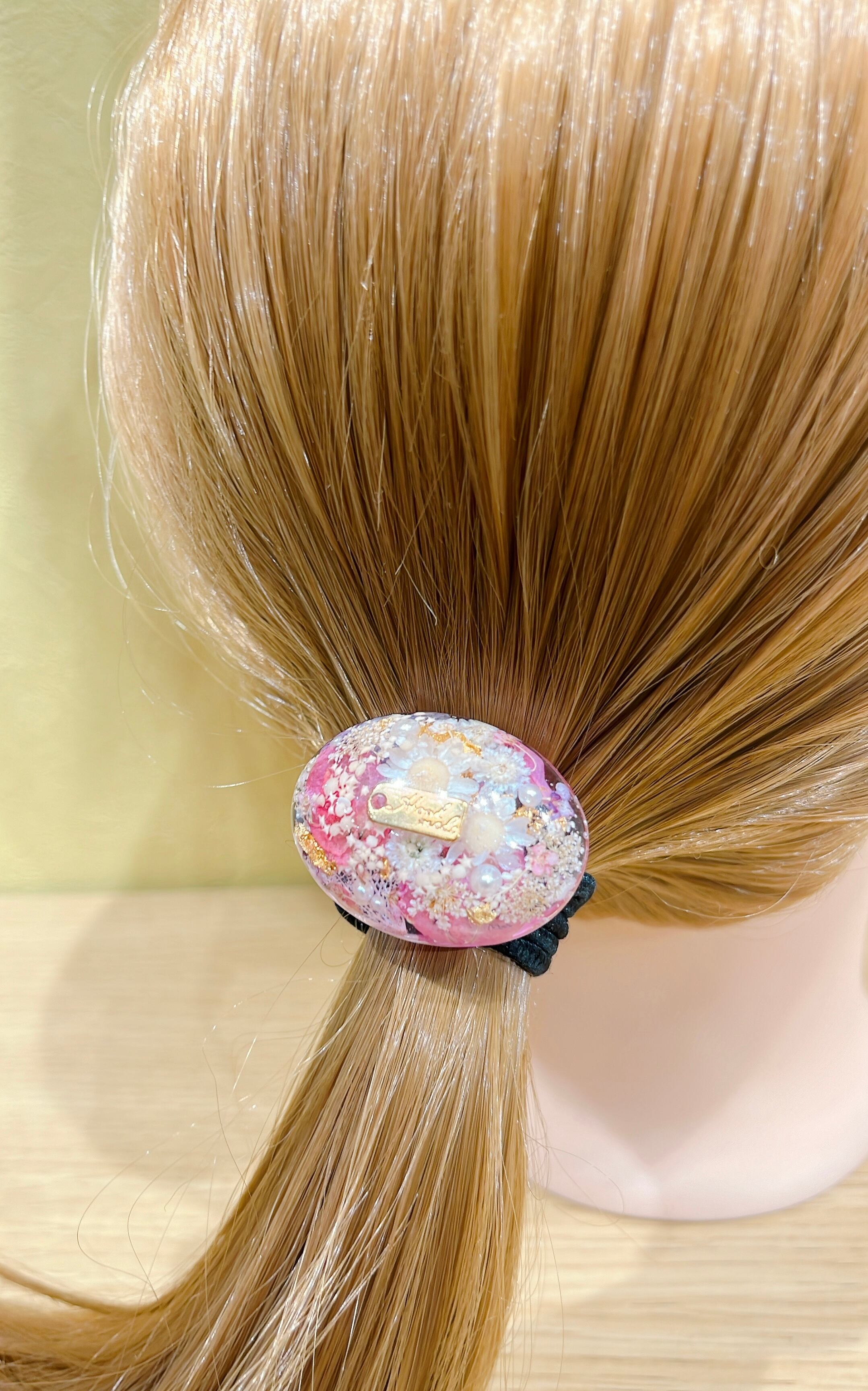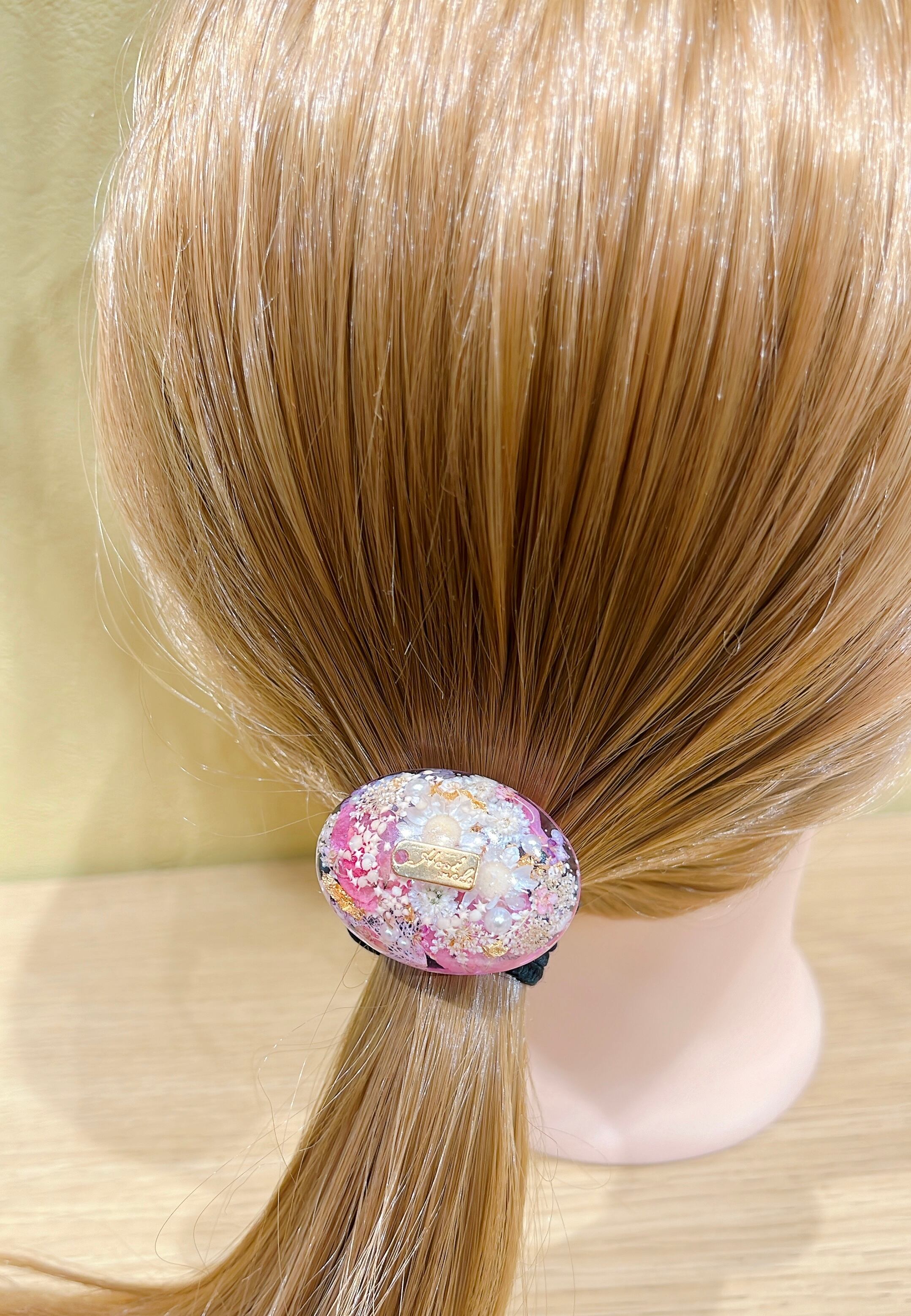 沖縄で採れたブーゲンと星砂やドライフラワー、パールを散りばめたかわいらしいヘアゴム。1つでヘアスタイルが華やかになりオシャレに飾れるアイテムです。