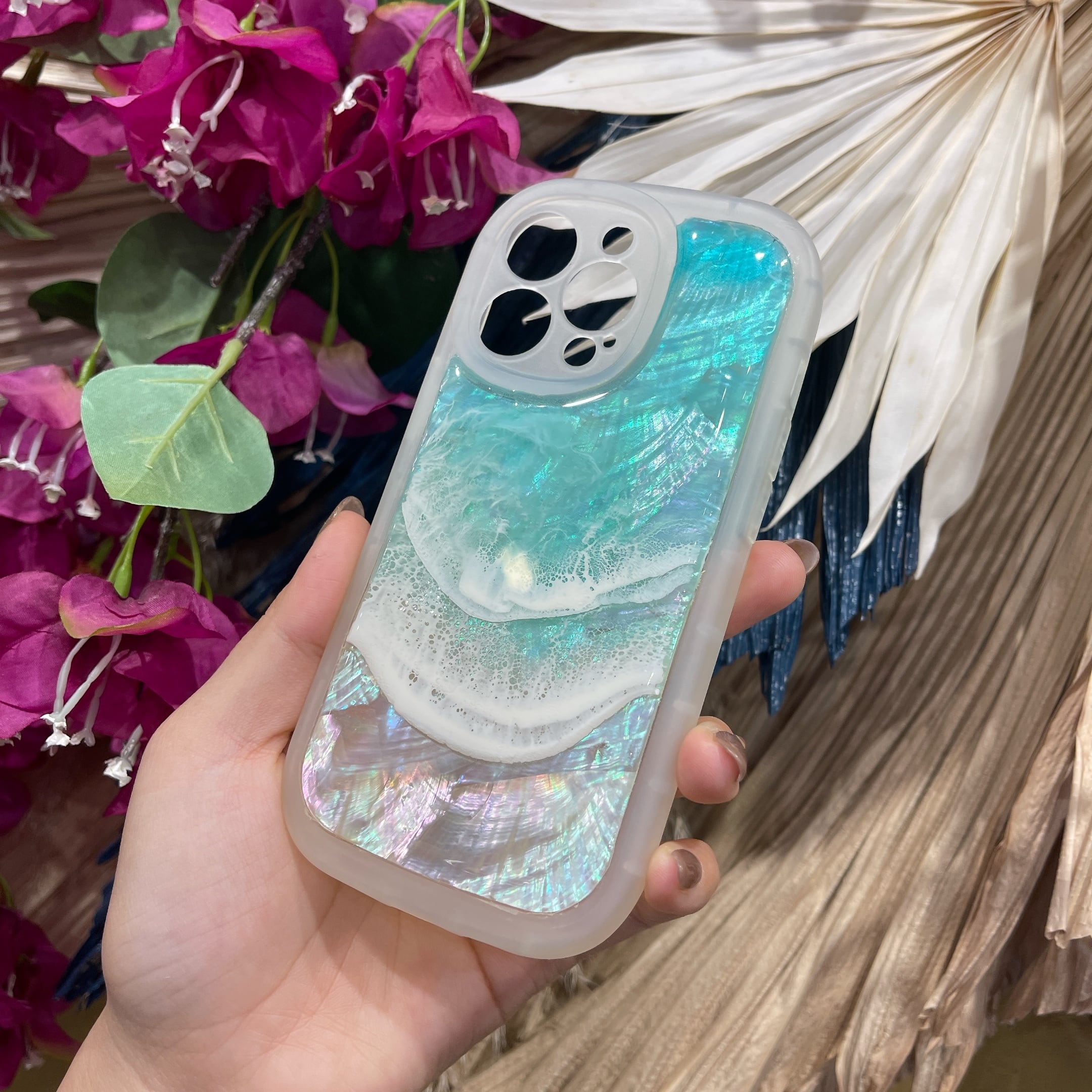 エメラルドグリーンの海を思わせる美しい波アートが施された、シェルベースのiPhone13pro用スマホケースが登場です!