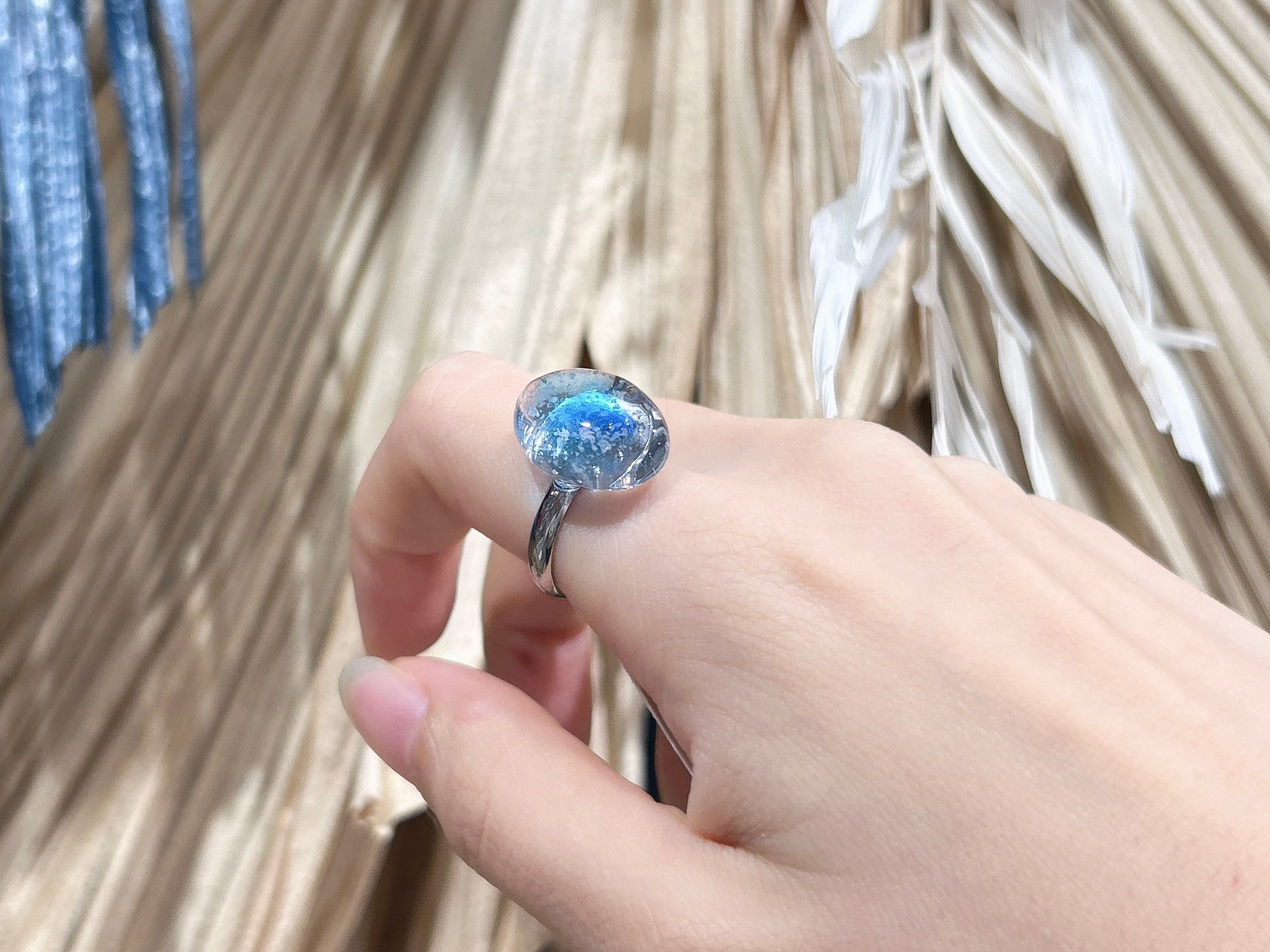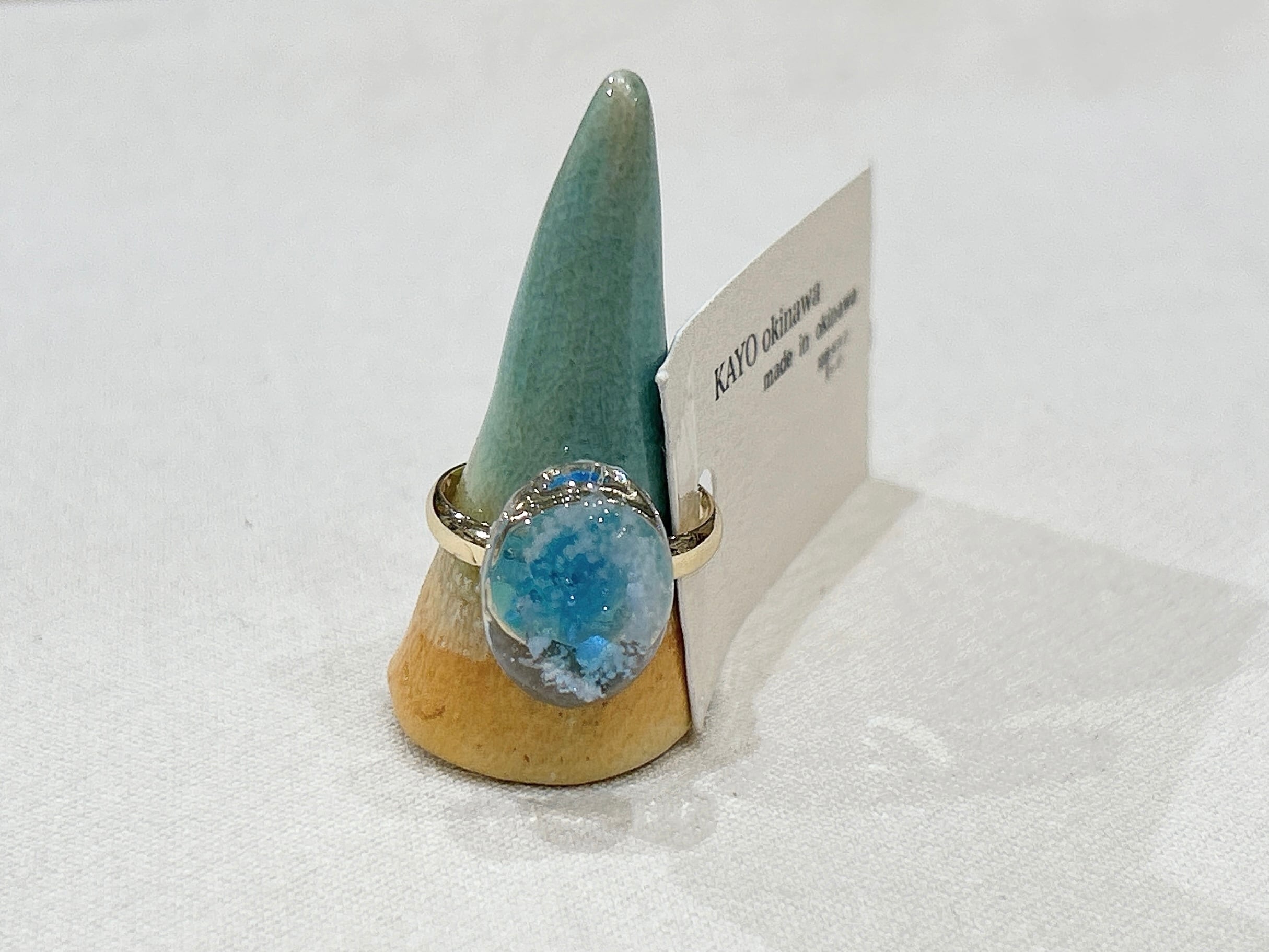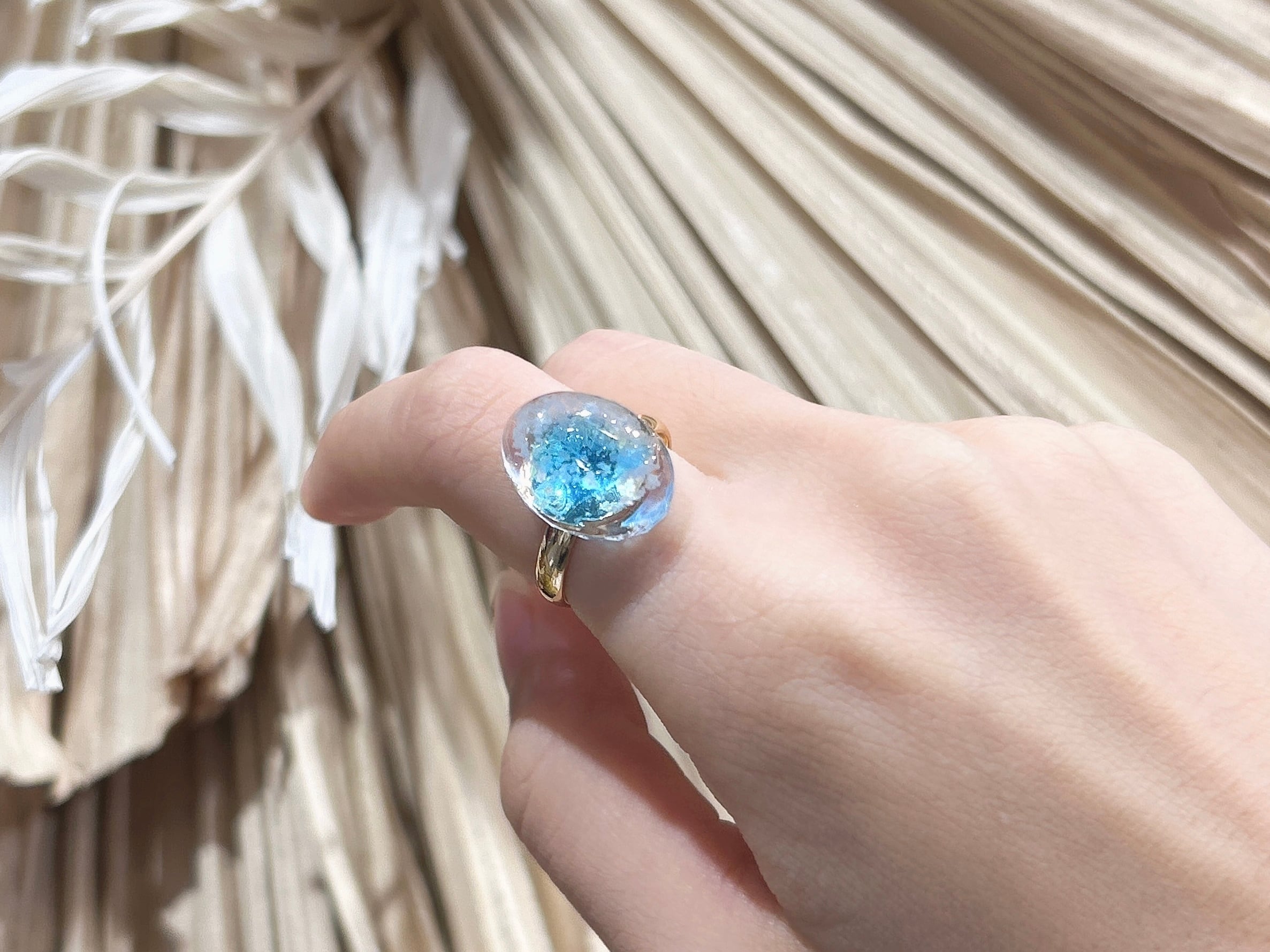 沖縄の自然の恵みを詰め込んだまーす入りの琉球ガラスリングが登場しました!珠のような光沢感が美しいこのリングは、まーすの質感と琉球ガラスの透明感が絶妙に組み合わさり、手元を華やかに演出してくれます。