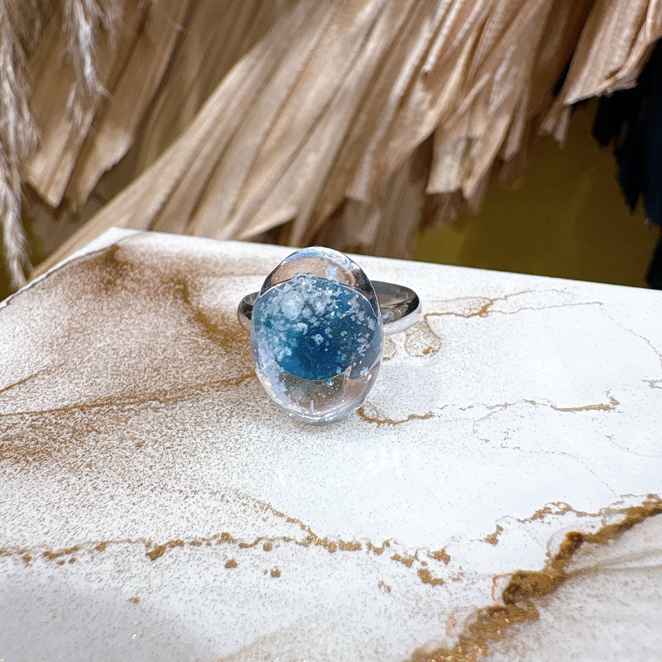 緑の琉球ガラスのカケラをまーすと共に閉じ込めた美しいリングが登場です!シンプルなデザインが特徴で、日常使いにも特別な場面にもぴったりなアクセサリーです。爽やかな海を感じさせる色合いが、指元を華やかに演出し、見る人の視線を惹きつけます。