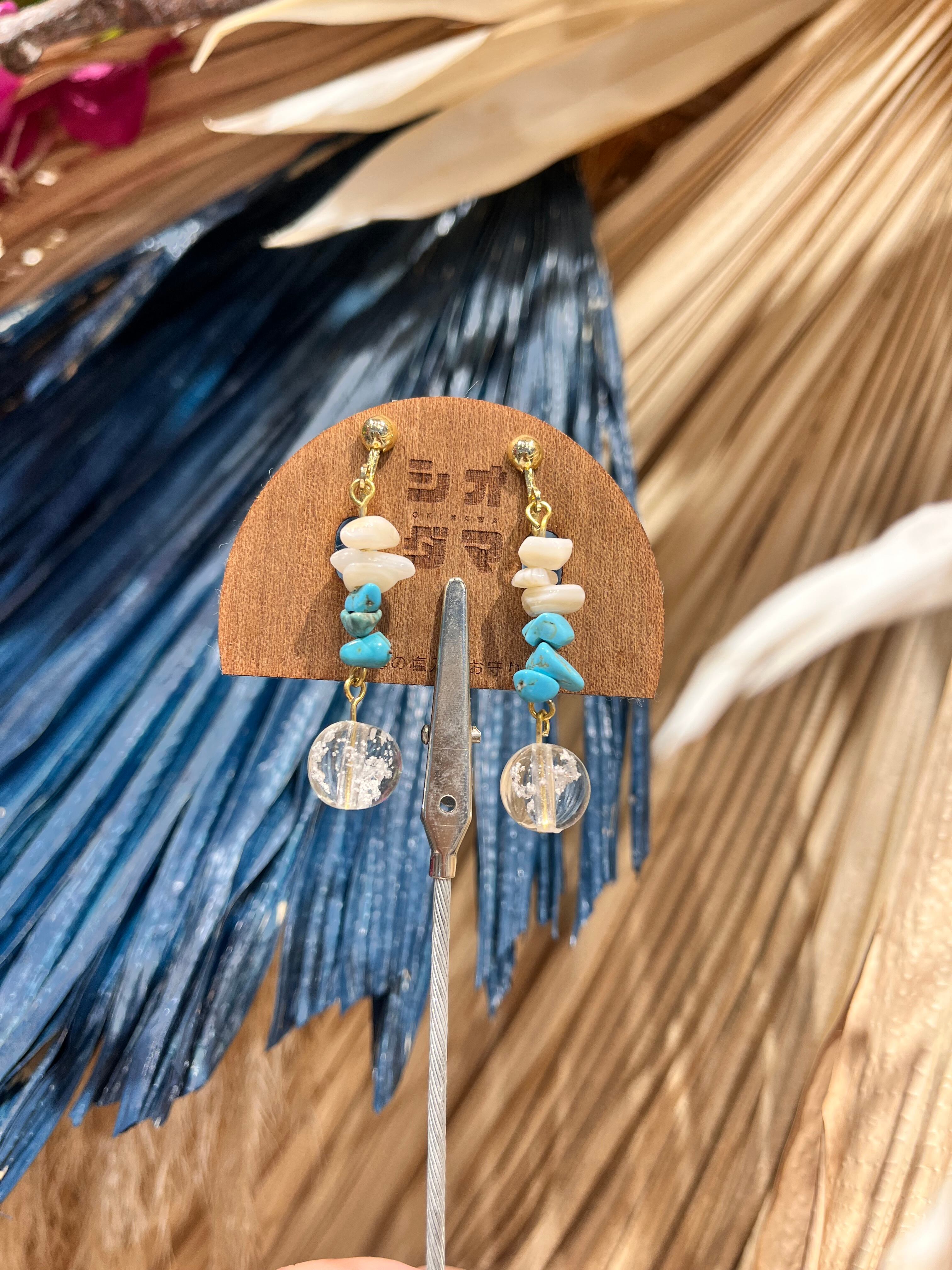 天然が生んだ美しいターコイズと塩珠をあしらったピアス。軽やかなデザインで、日常使いにも特別な場面にもぴったりです。ターコイズの色味が耳元を華やかに演出し、周囲の視線を引きつけます。