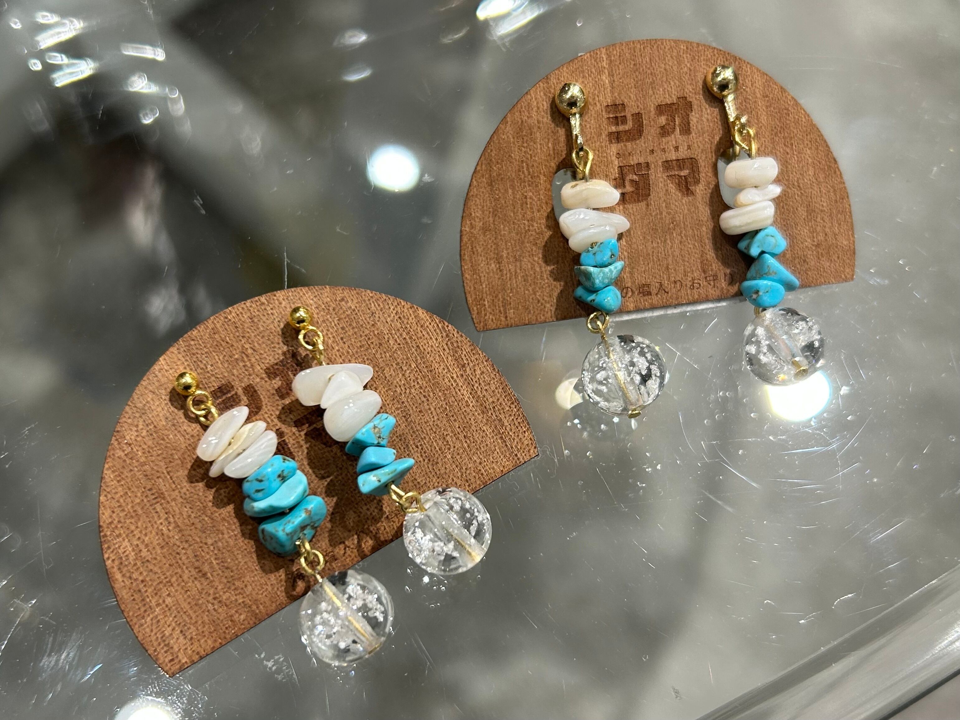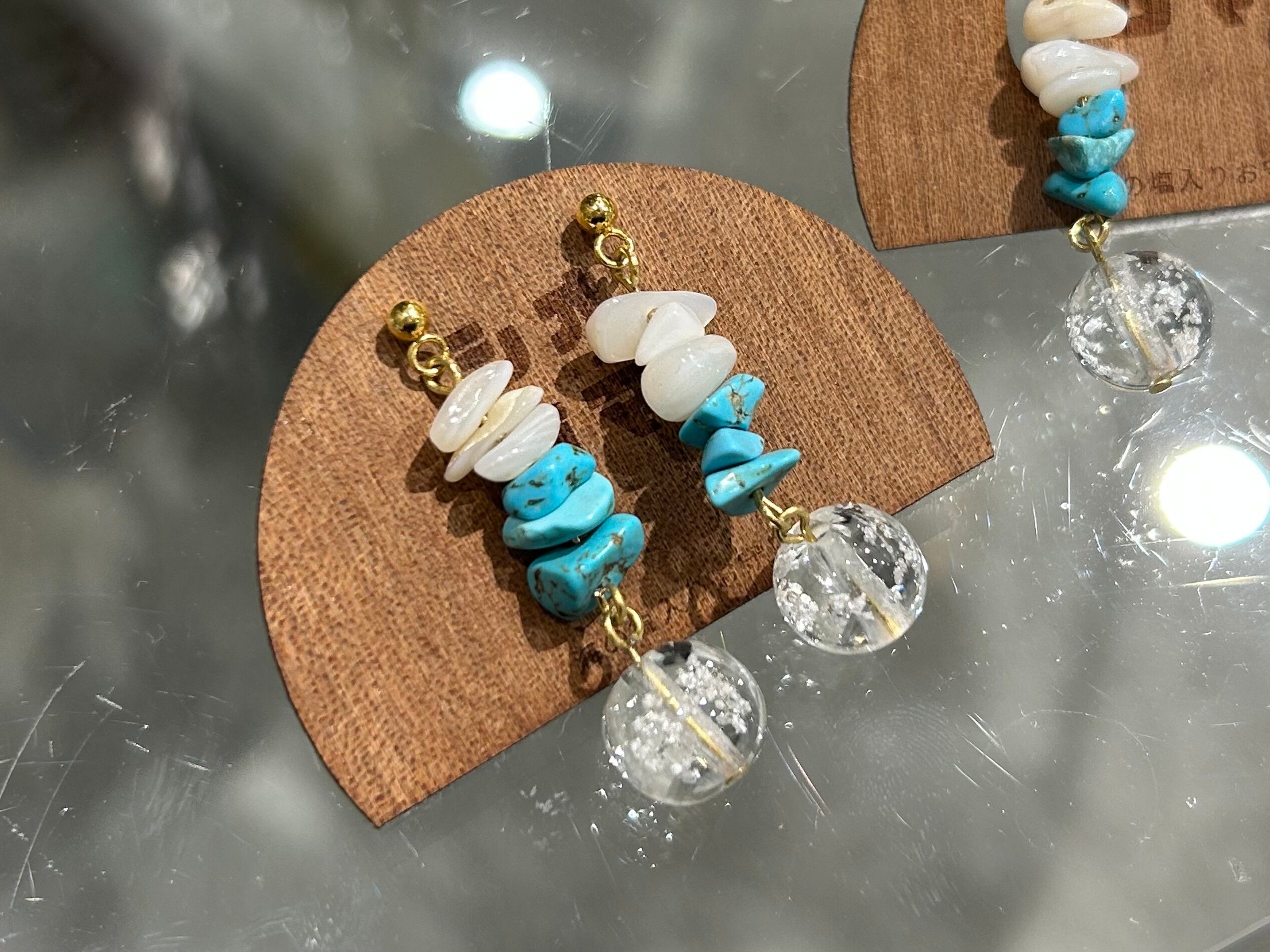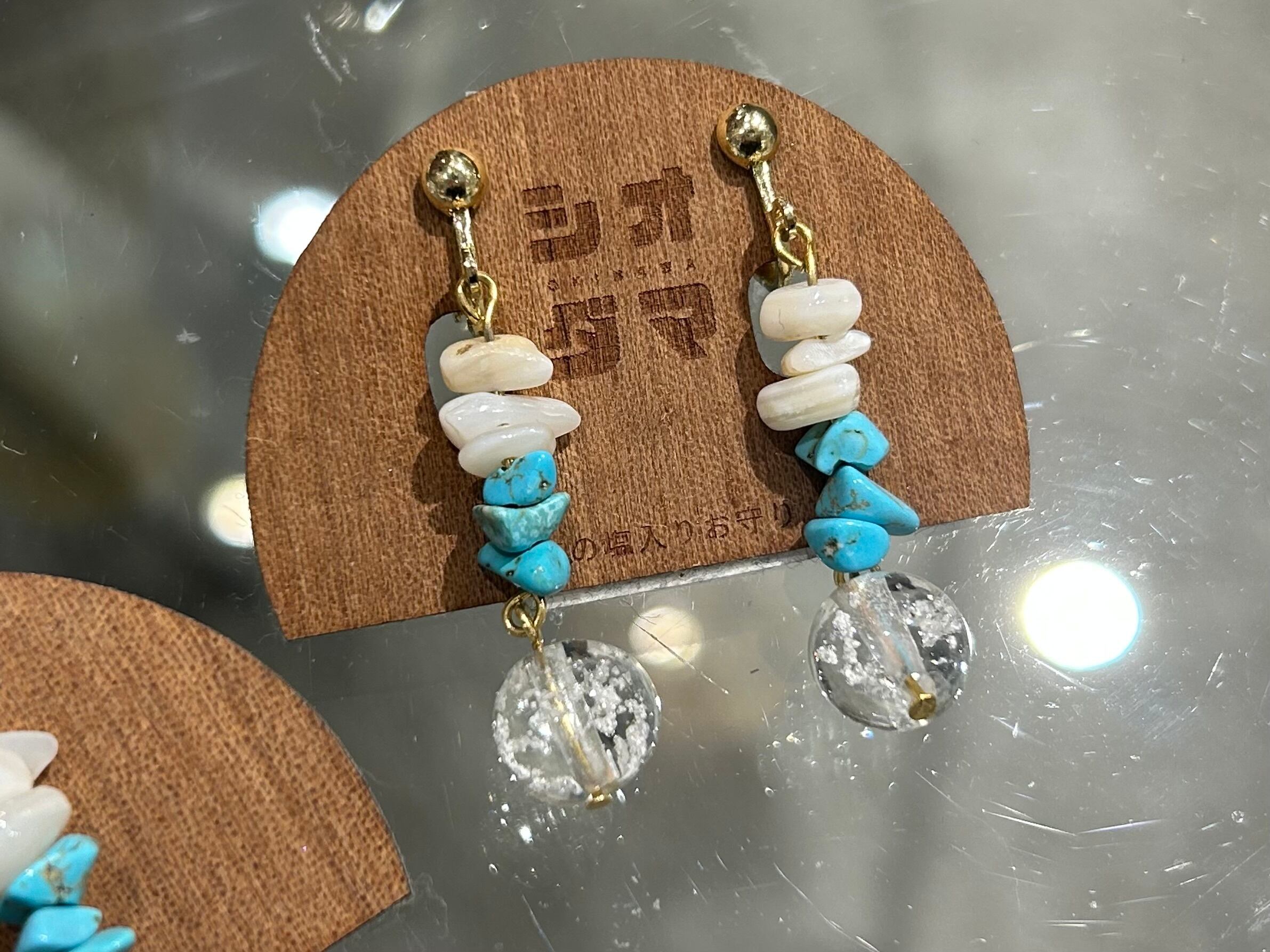 天然が生んだ美しいターコイズと塩珠をあしらったアクセサリー。軽やかなデザインで、日常使いにも特別な場面にもぴったりです。ターコイズの色味が耳元を華やかに演出し、周囲の視線を引きつけます。